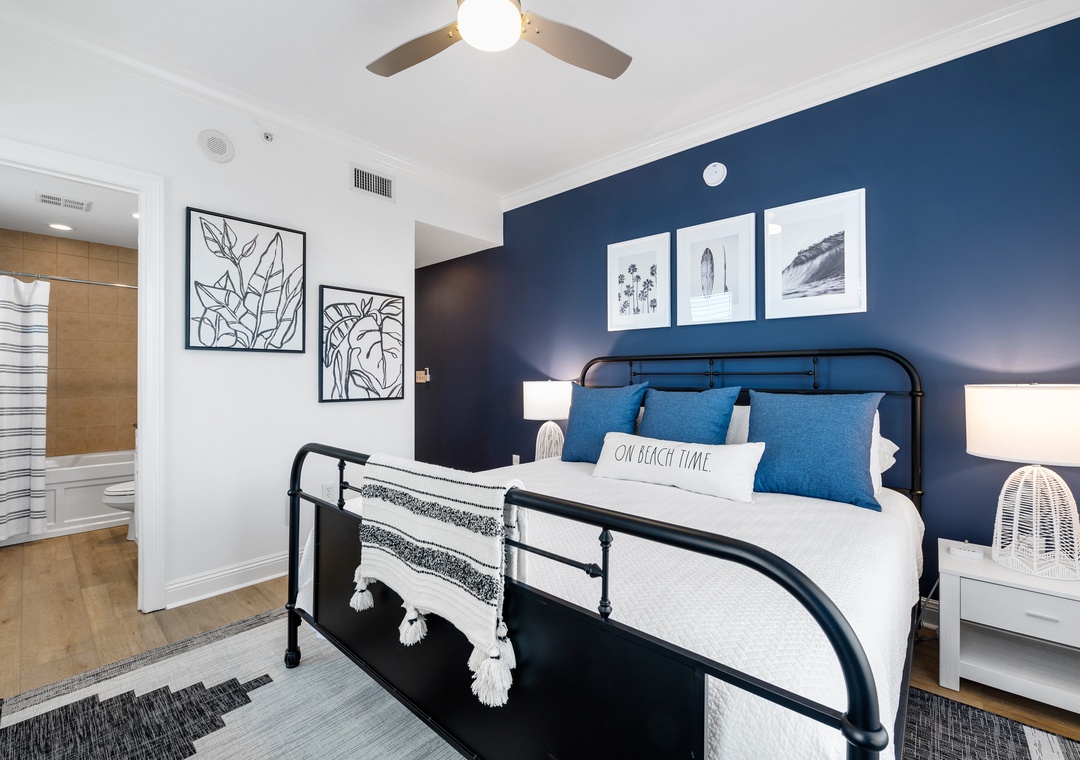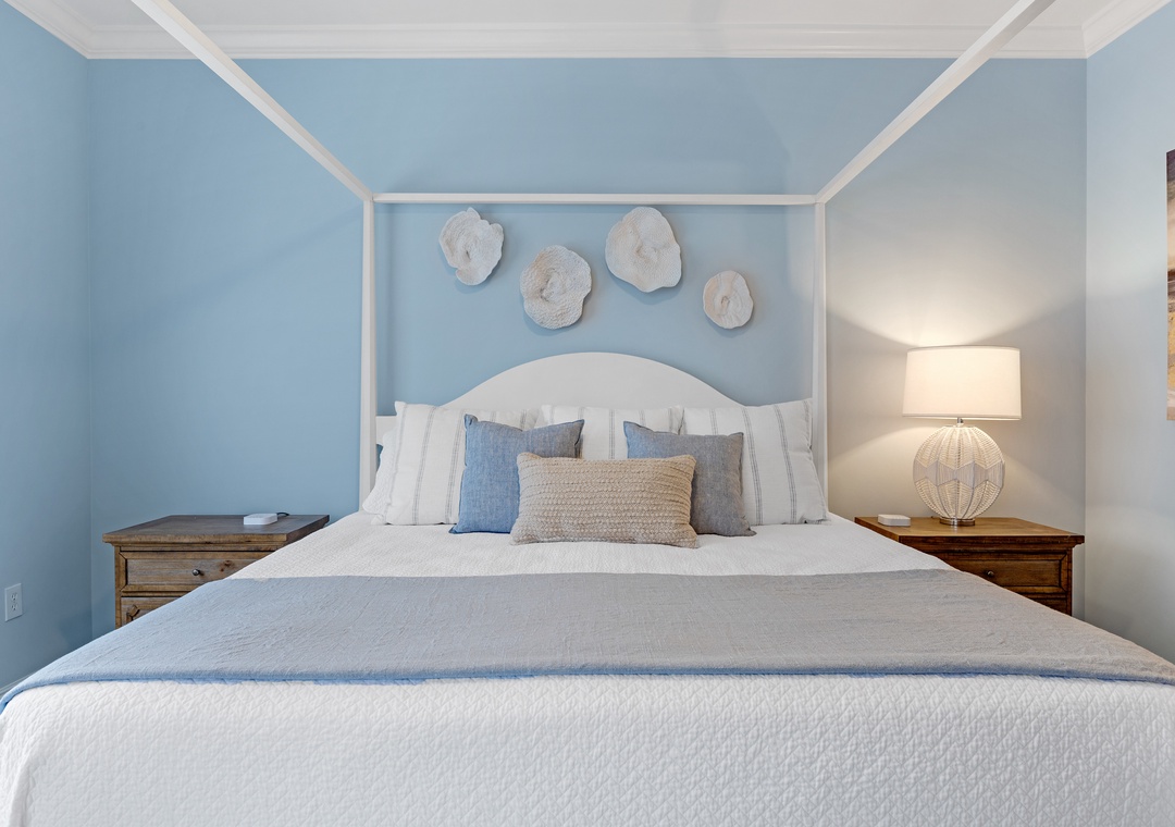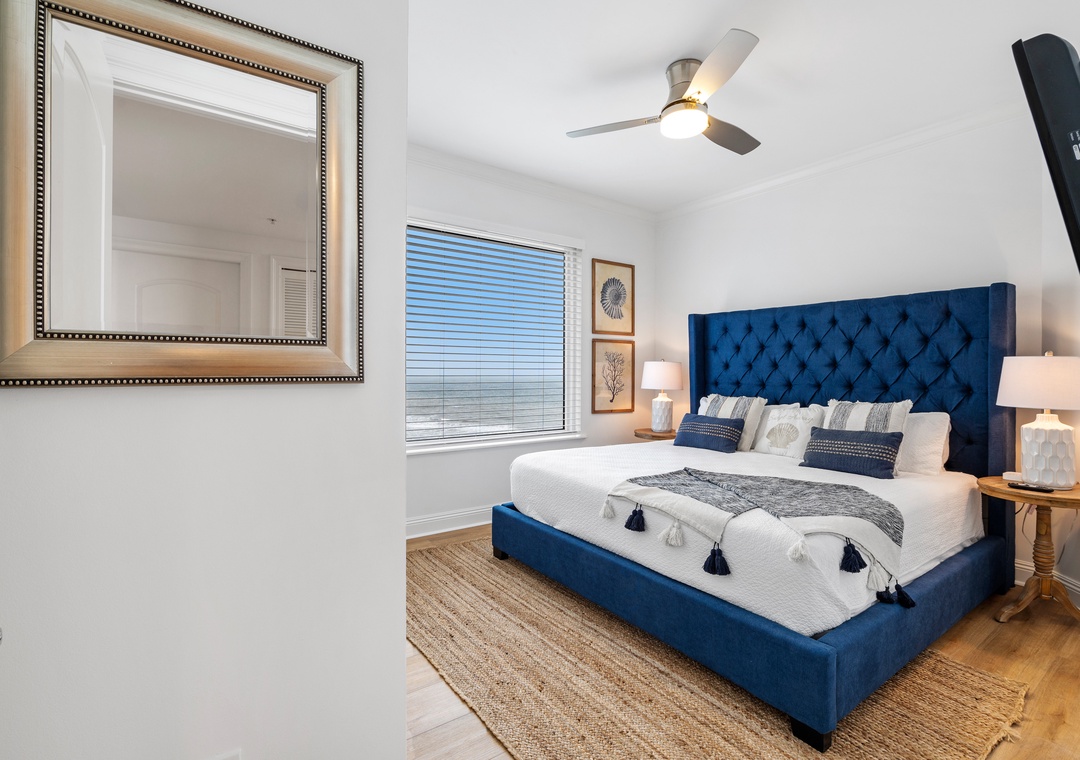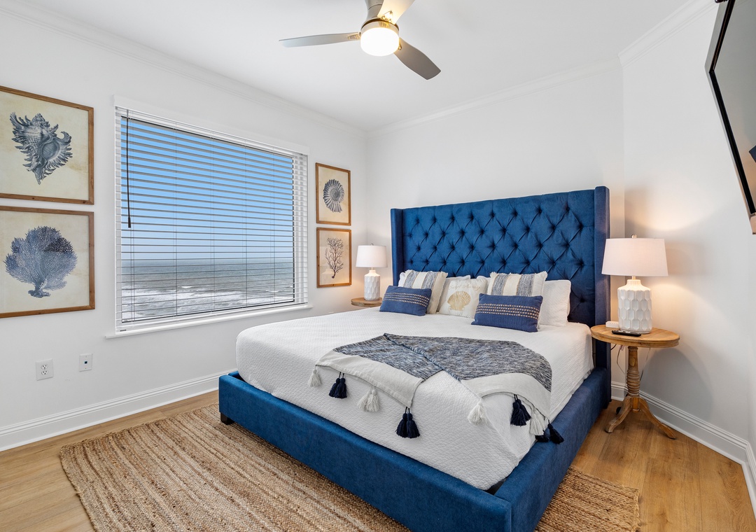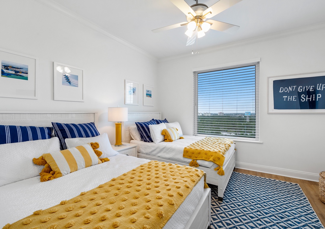 The master suite is a sanctuary of relaxation, featuring a king canopy bed, deluxe bedding, a large picture window, and direct balcony access. The ensuite bathroom boasts a walk-in shower, oversized jetted tub, and dual vanities. A second master offers a king bed with a full ensuite bathroom, while the third bedroom, decorated in rich indigo and rustic tones, also features a king bed and nearby full bath. The fourth bedroom is a tribute to the local Blue Angels, with vibrant yellow and indigo accents, and offers two full beds and an attached bathroom. With its fresh, updated interior and serene coastal charm, Indigo 1101 West is the perfect place to make lasting memories with family and friends.