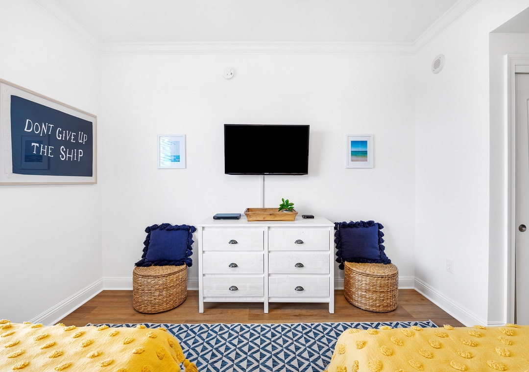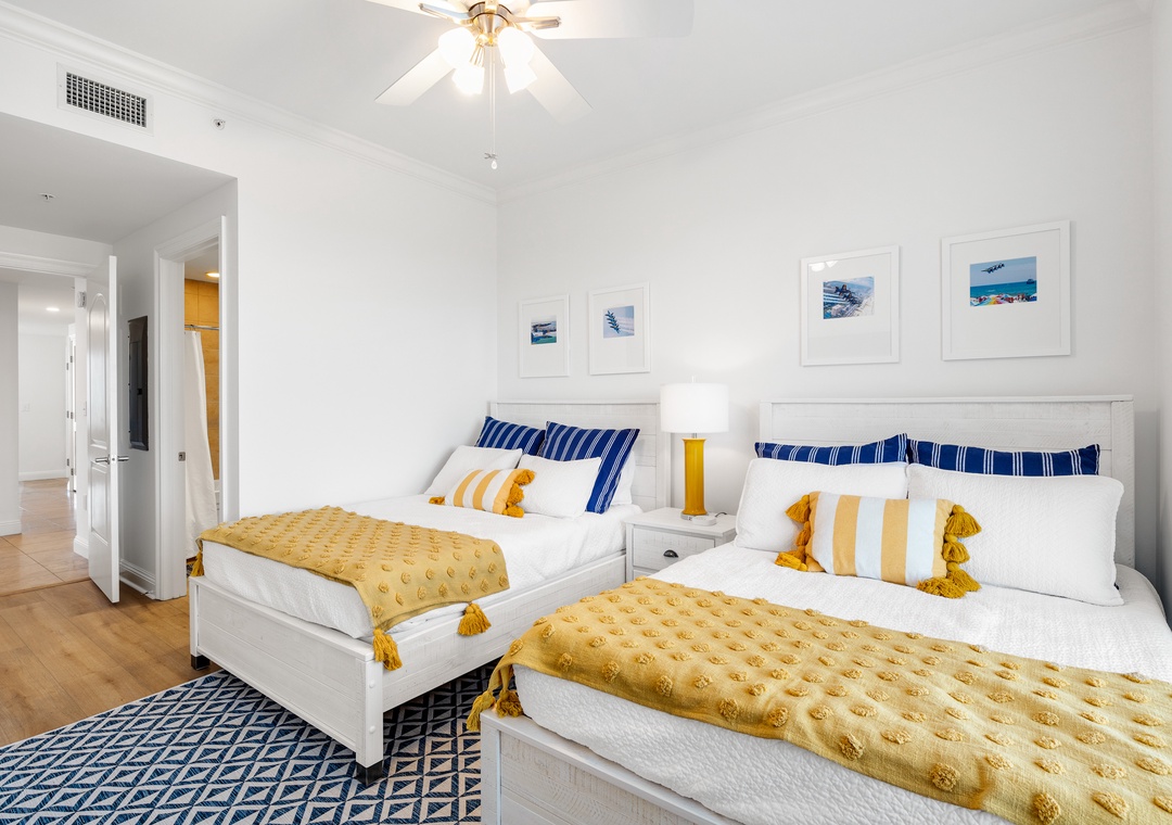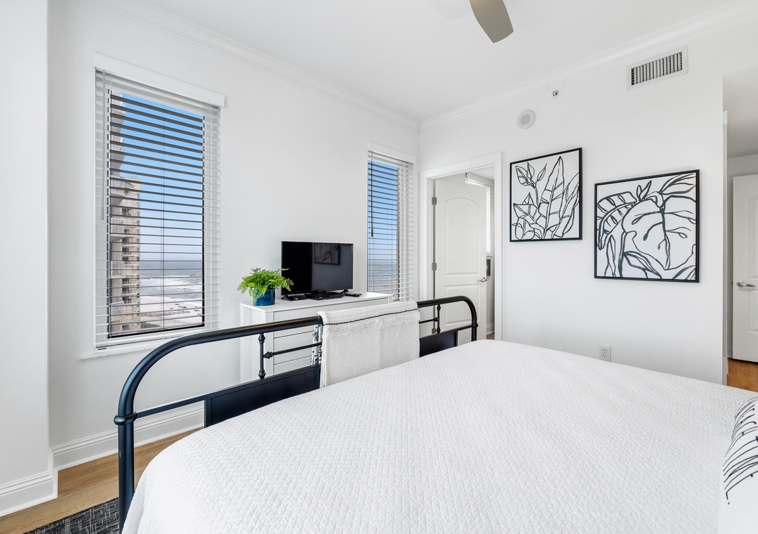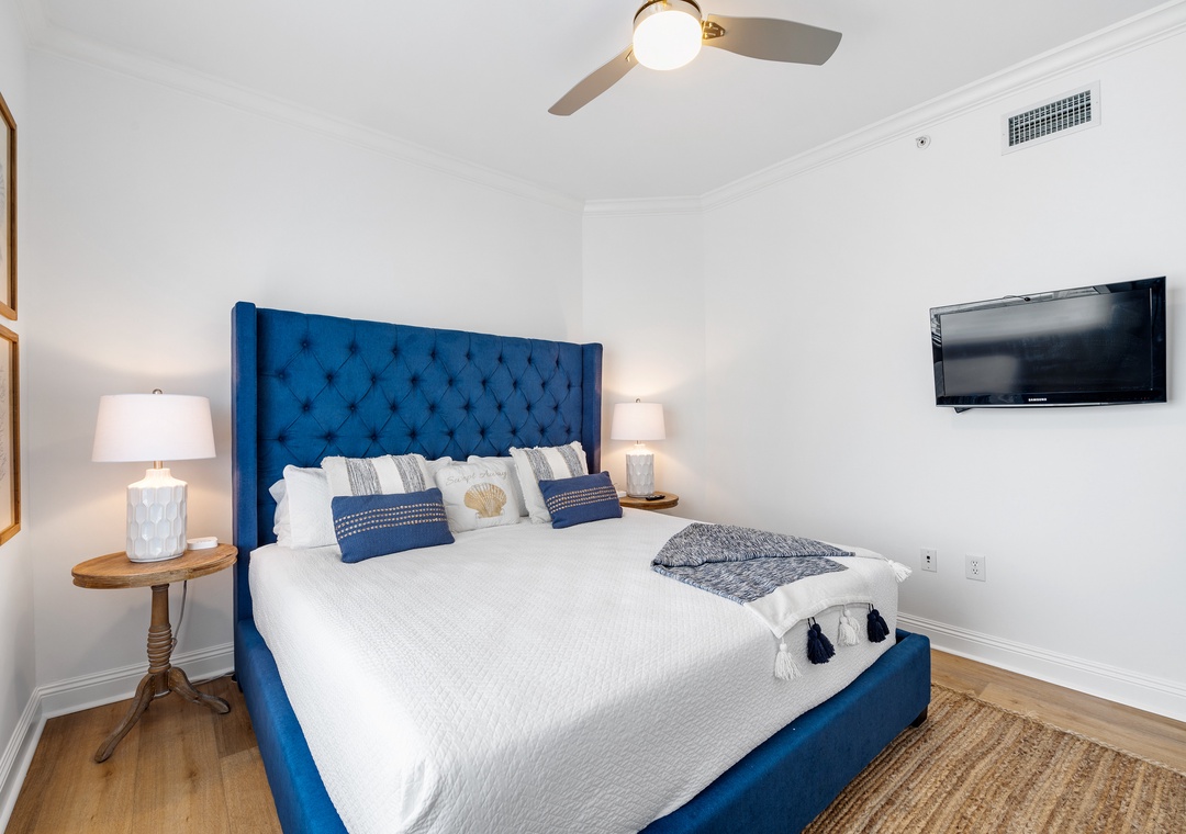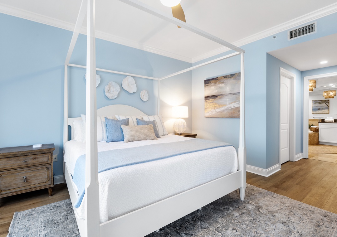 The master suite is a sanctuary of relaxation, featuring a king canopy bed, deluxe bedding, a large picture window, and direct balcony access. The ensuite bathroom boasts a walk-in shower, oversized jetted tub, and dual vanities. A second master offers a king bed with a full ensuite bathroom, while the third bedroom, decorated in rich indigo and rustic tones, also features a king bed and nearby full bath. The fourth bedroom is a tribute to the local Blue Angels, with vibrant yellow and indigo accents, and offers two full beds and an attached bathroom. With its fresh, updated interior and serene coastal charm, Indigo 1101 West is the perfect place to make lasting memories with family and friends.