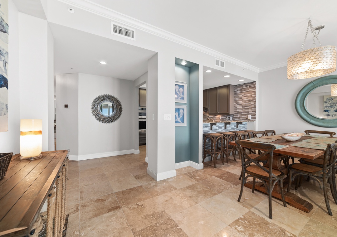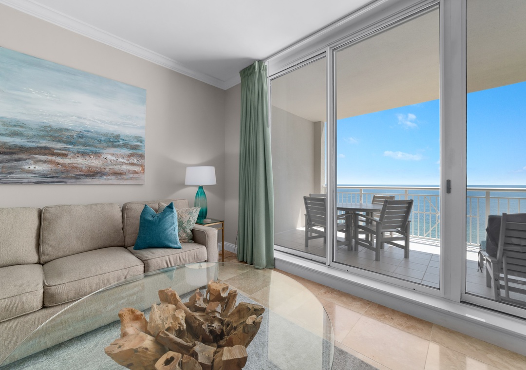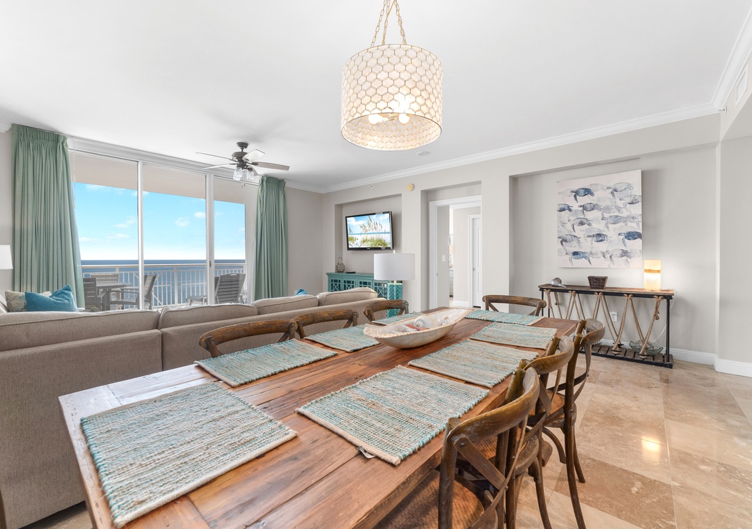 Indulge in a luxurious beachfront escape at this stunning 14th-floor, 3-bedroom, 3-bath condo at Indigo Resort in Perdido Key, Florida. Nestled on the pristine shores of Perdido Key’s east end, Indigo offers the perfect blend of island tranquility and nearby recreation. This beach-chic unit exudes modern elegance, featuring calming shades of turquoise, aqua, and sea-glass green paired with soothing neutrals and distressed finishes. The spacious living area is perfect for family gatherings, with a large L-shaped sectional, wall-mounted smart TV, and direct access to the beachfront balcony. Step outside to your covered terrace and enjoy breathtaking views of the Gulf of Mexico’s emerald waters and soft, quartz sands, whether sipping morning coffee or watching the sun set over the horizon.