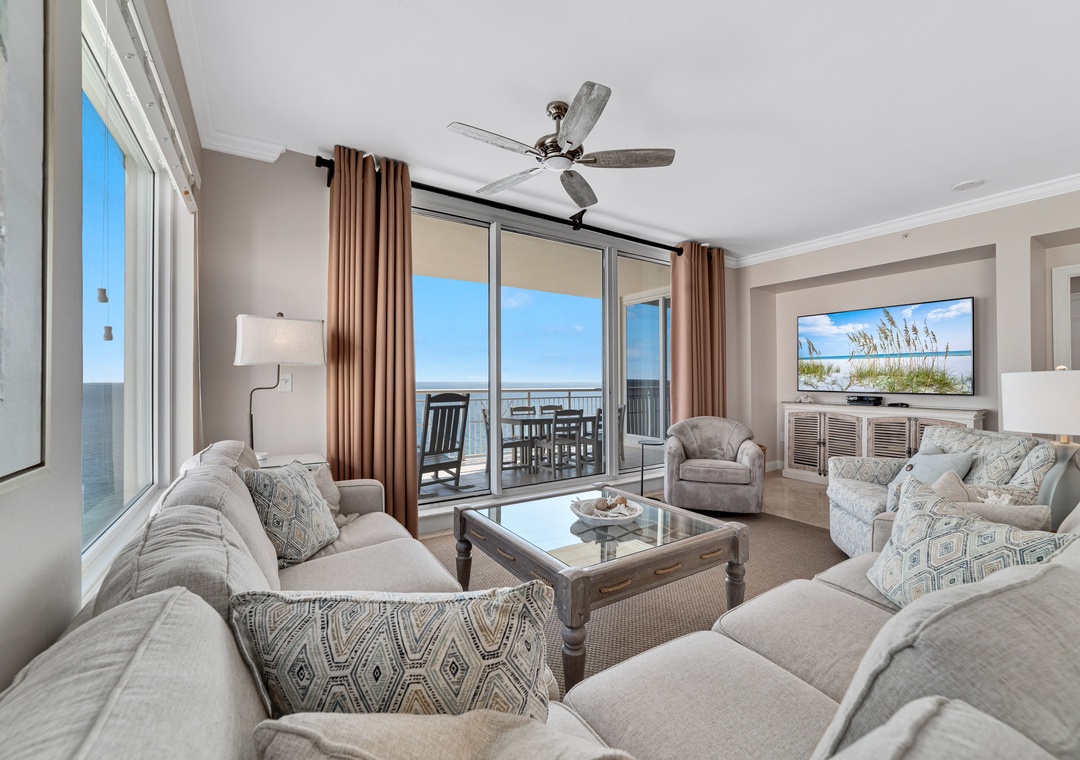 Beautiful condo with perfect lounging couch for all 6 of us to be comfortable for the week. Easy access to the pool and beach.- Posted: 8/9/2025