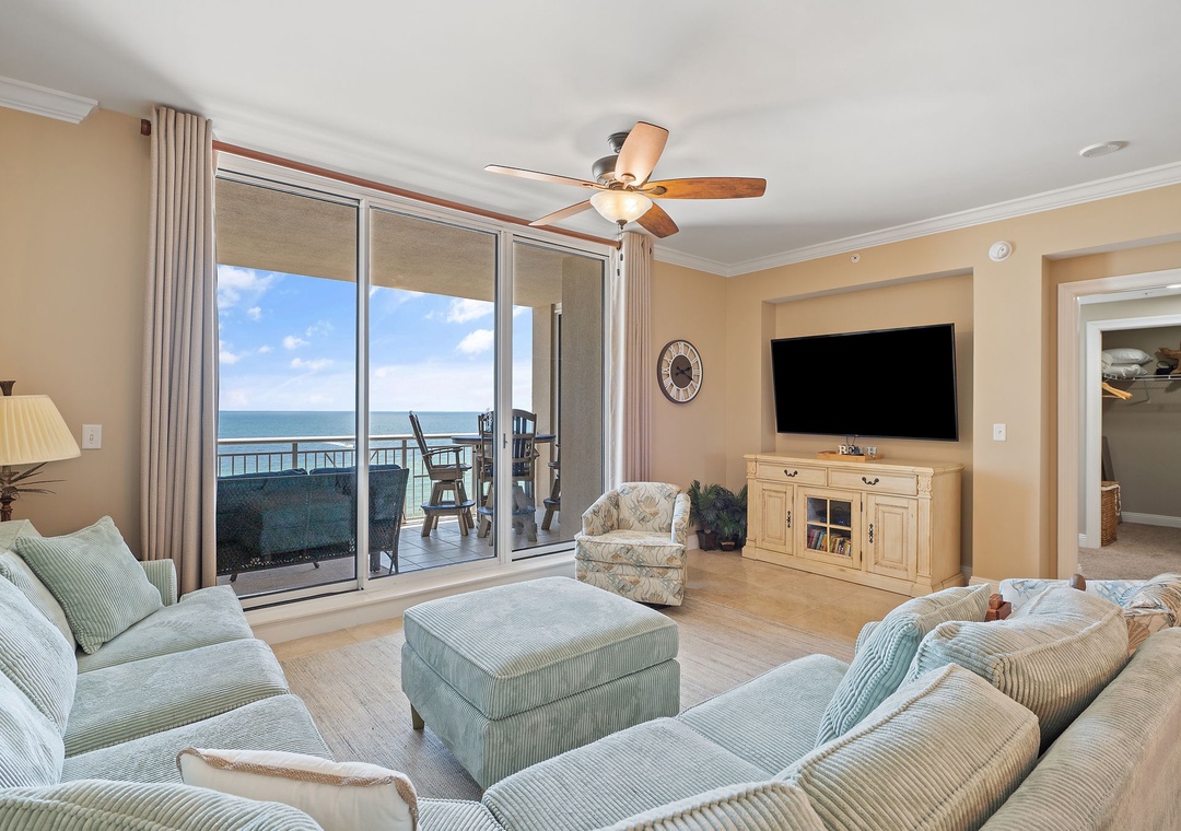 This stunning 7th-floor condo, located on a pristine stretch of the Gulf Coast, offers a perfect blend of luxury and comfort. The open floor plan features elegant furnishings, while floor-to-ceiling sliding glass doors lead to a spacious beachfront terrace. With ample seating, the covered balcony is ideal for enjoying a meal or your favorite drink while taking in breathtaking panoramic views of the Gulf's sparkling turquoise waters. The living area is bathed in natural light, thanks to the expansive glass doors that bring the beauty of the coast right inside.