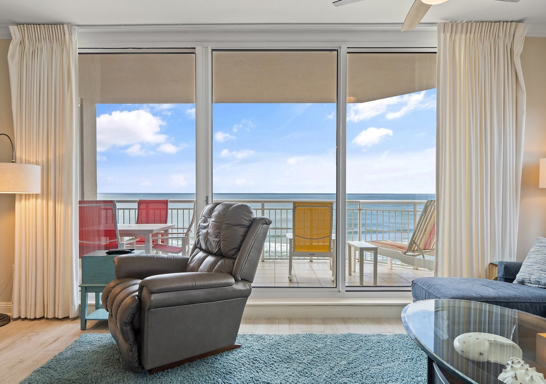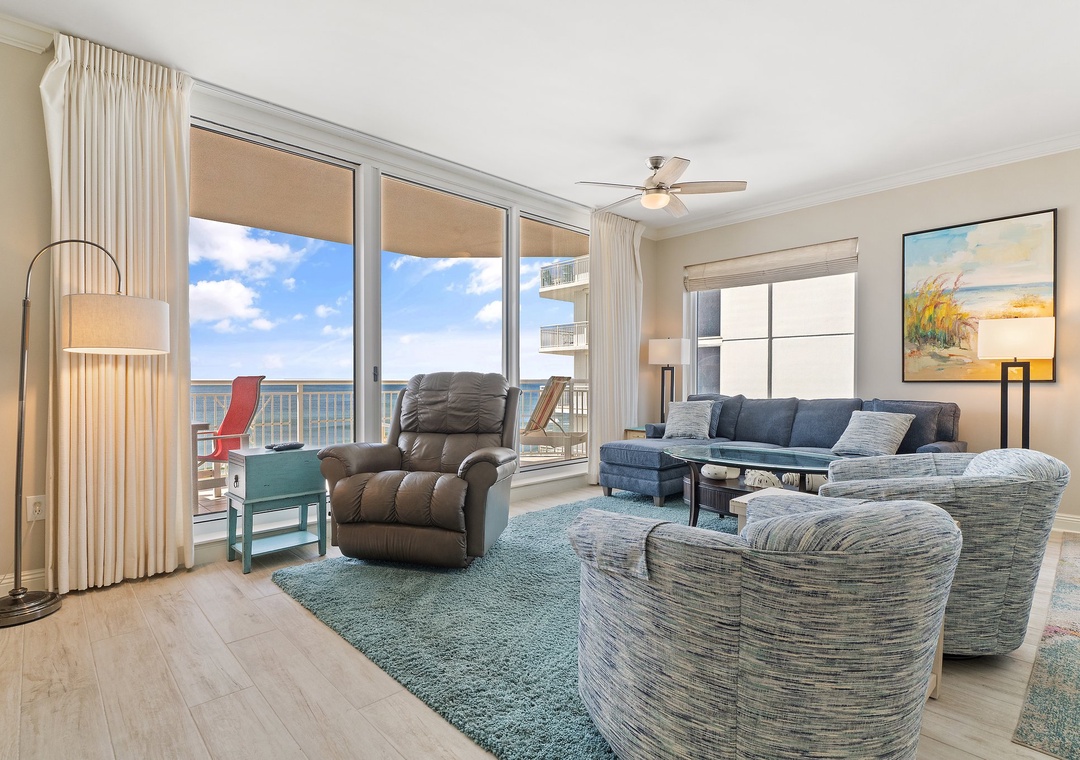 Indulge in the vacation of a lifetime at this stunning 8th-floor, 3-bedroom plus den, 3.5-bath unit at Indigo Resort. Nestled along the pristine Gulf Coast, Indigo offers seven acres of beachfront luxury, combining elegance, comfort, and unmatched amenities. The sugar-white sands and sparkling emerald waters create a breathtaking backdrop for your getaway. Step into the spacious living room, where floor-to-ceiling glass doors open to a private Gulf-front terrace. Let the soft sea breeze and sweeping ocean views transport you to a state of relaxation as you take in the beauty of the coast.
