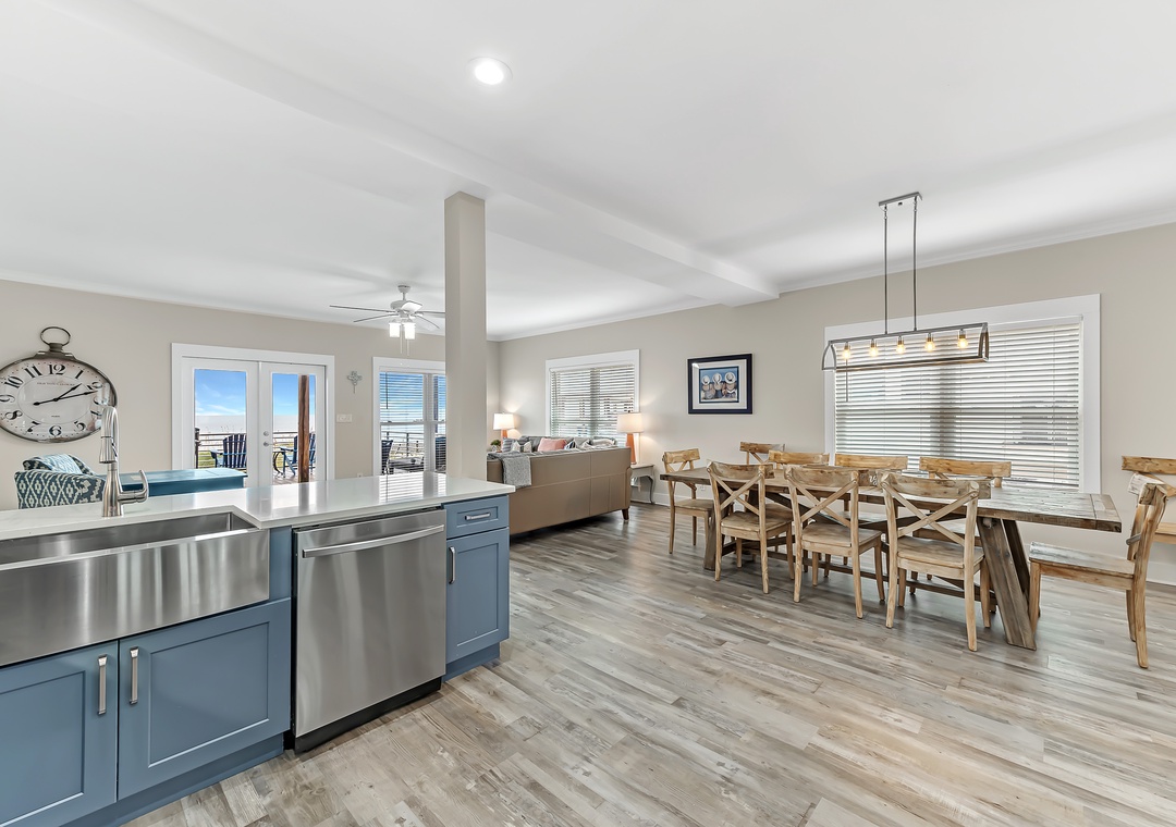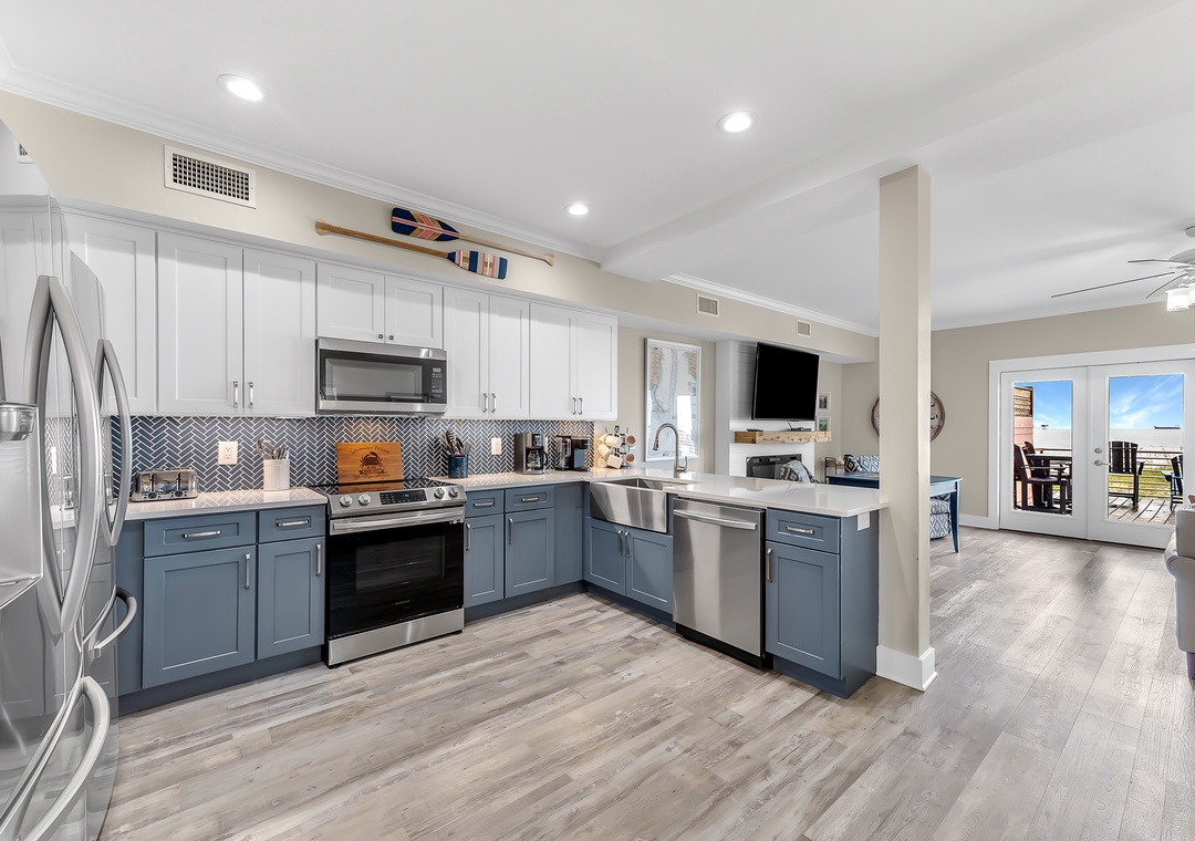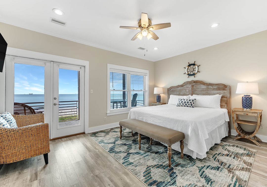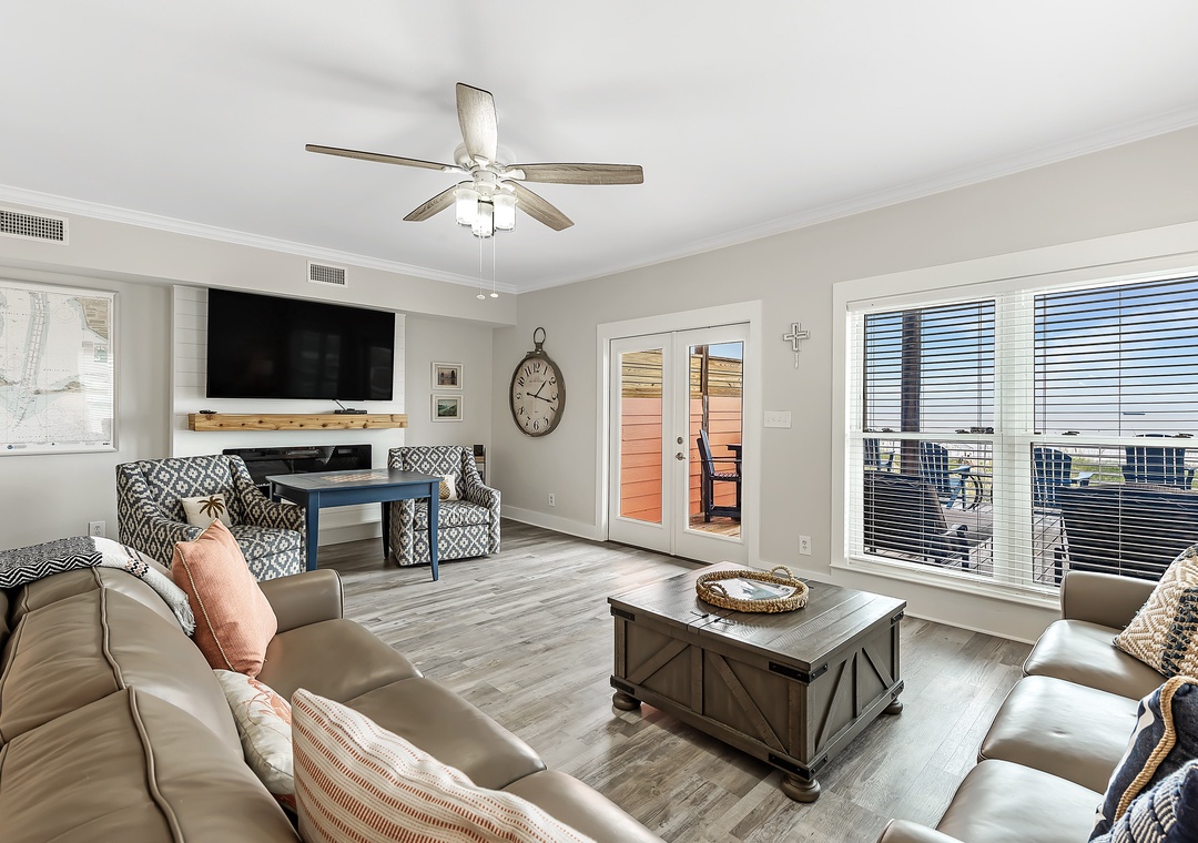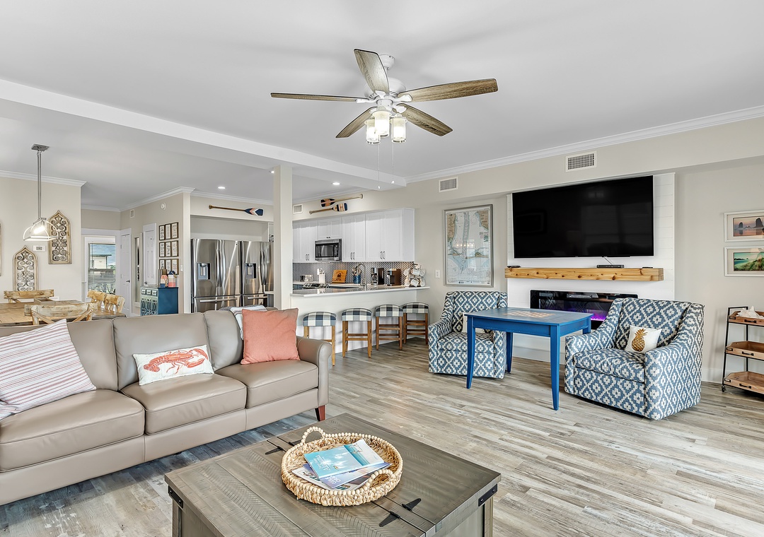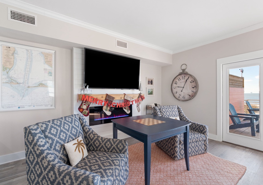Gather in the open living area, where wide windows frame the Gulf and doors lead out to spacious decks with plenty of seating. Fully renovated in 2022, the home features a modern kitchen, updated bathrooms, fresh flooring, and all-new furnishings. The kitchen is well-equipped with two refrigerators and ample ice, making it easy to enjoy meals together. Evenings bring the choice of movies on Smart TVs, games by the fire, or simply lingering over conversation with the sound of the waves nearby.