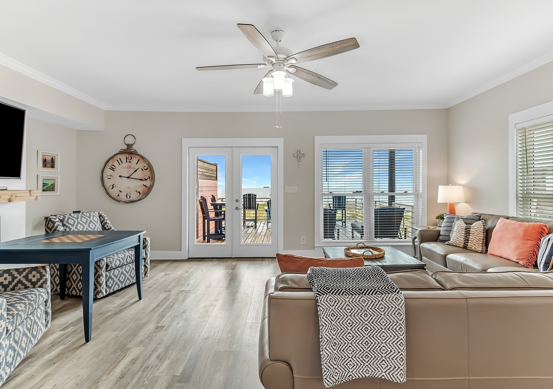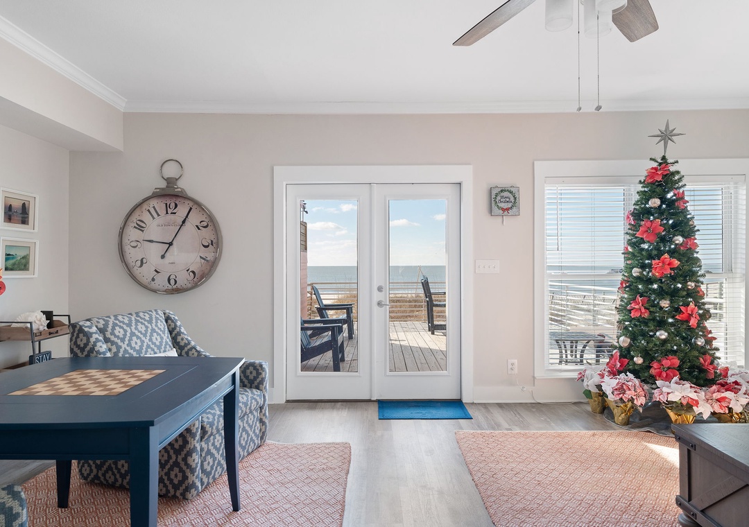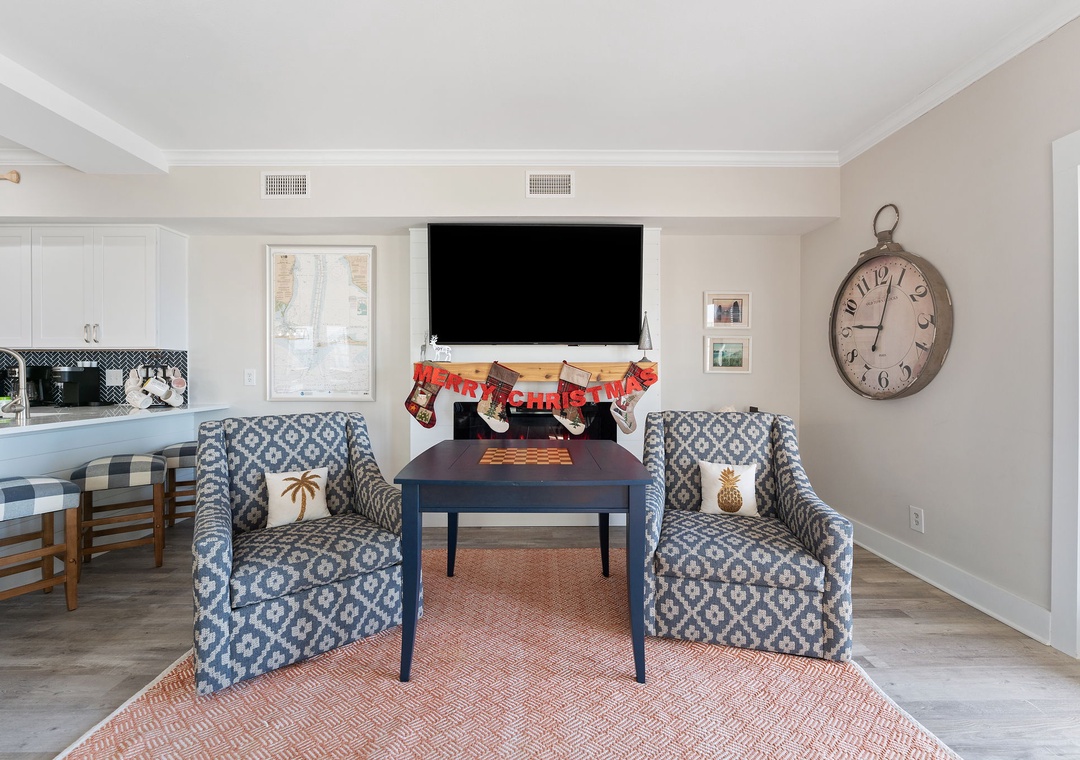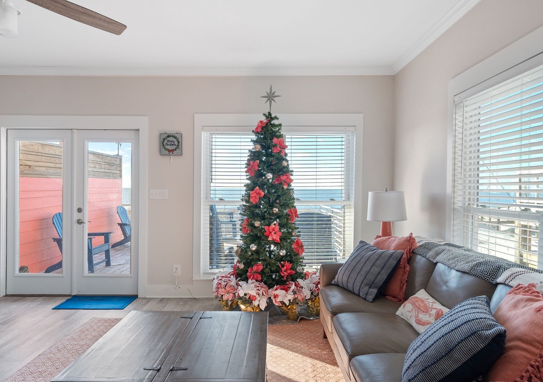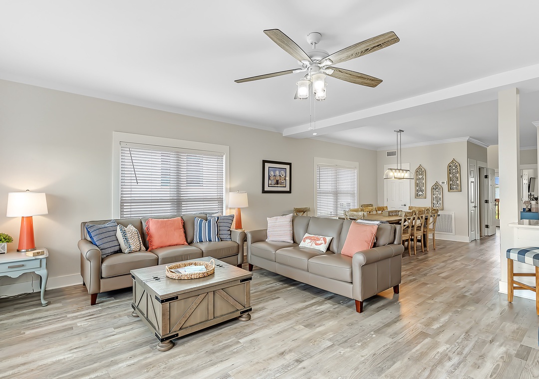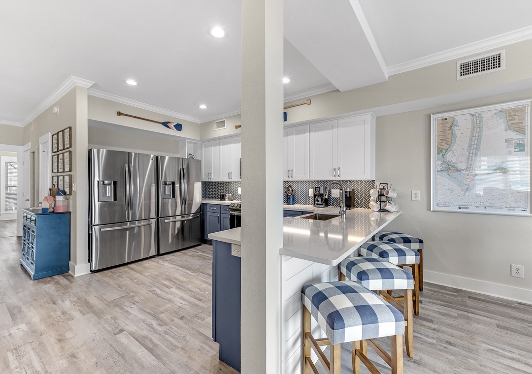 Gather in the open living area, where wide windows frame the Gulf and doors lead out to spacious decks with plenty of seating. Fully renovated in 2022, the home features a modern kitchen, updated bathrooms, fresh flooring, and all-new furnishings. The kitchen is well-equipped with two refrigerators and ample ice, making it easy to enjoy meals together. Evenings bring the choice of movies on Smart TVs, games by the fire, or simply lingering over conversation with the sound of the waves nearby.