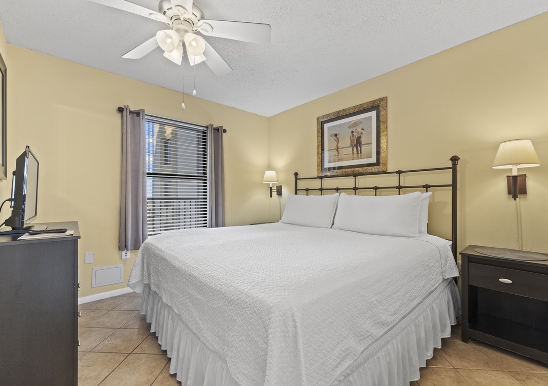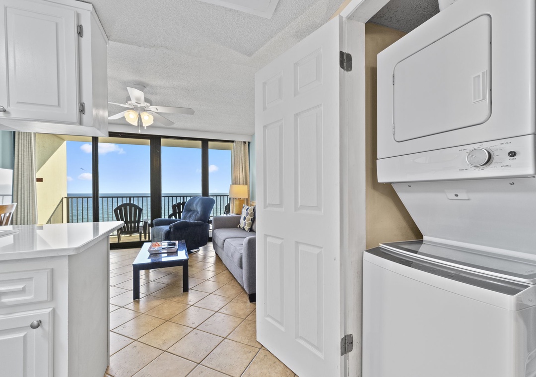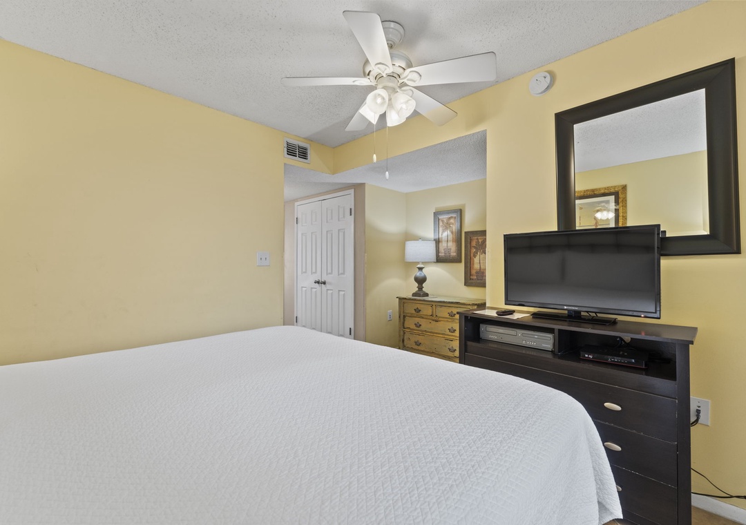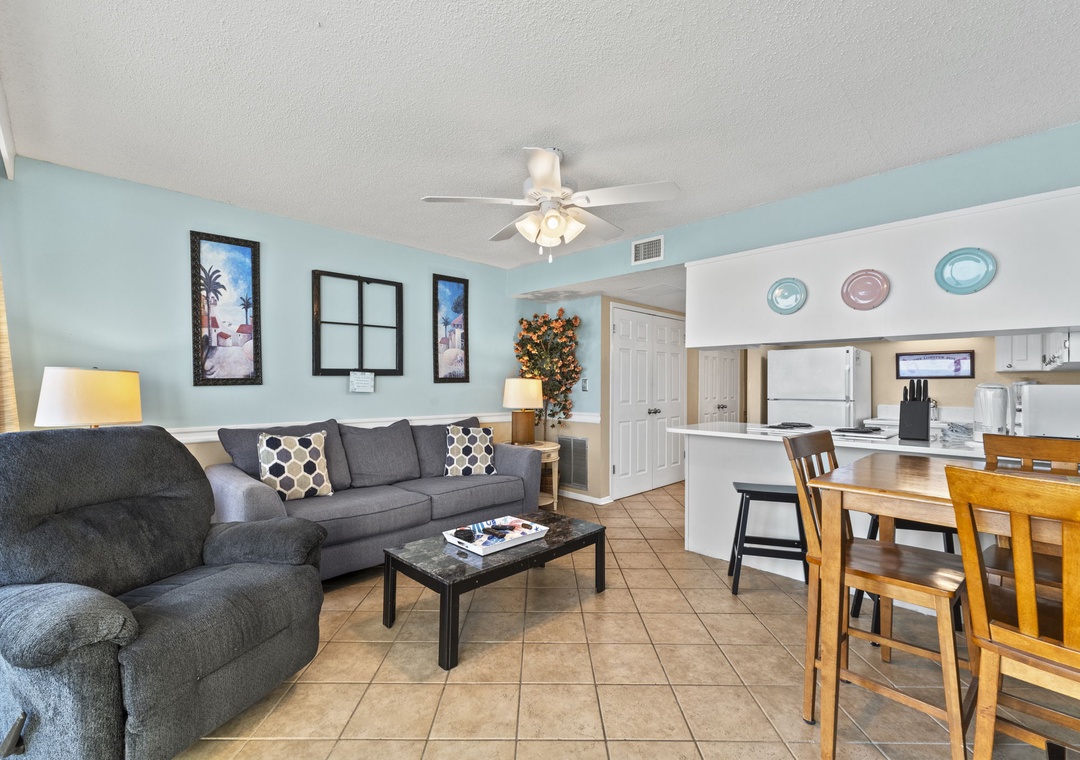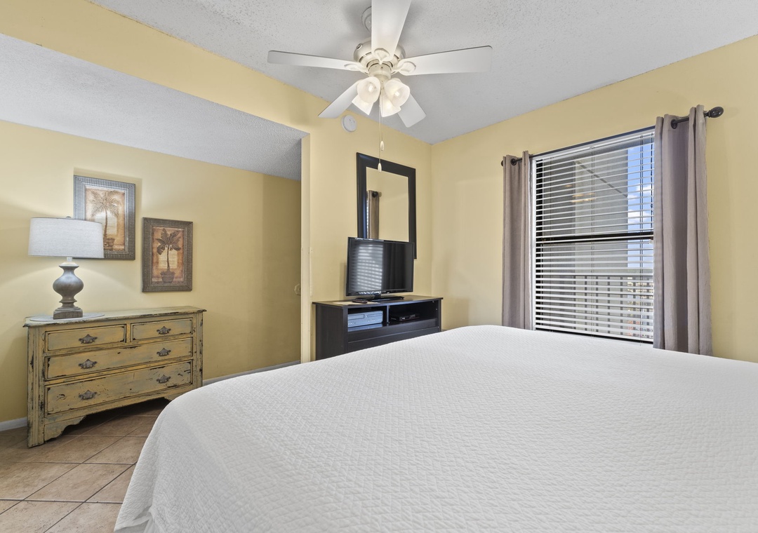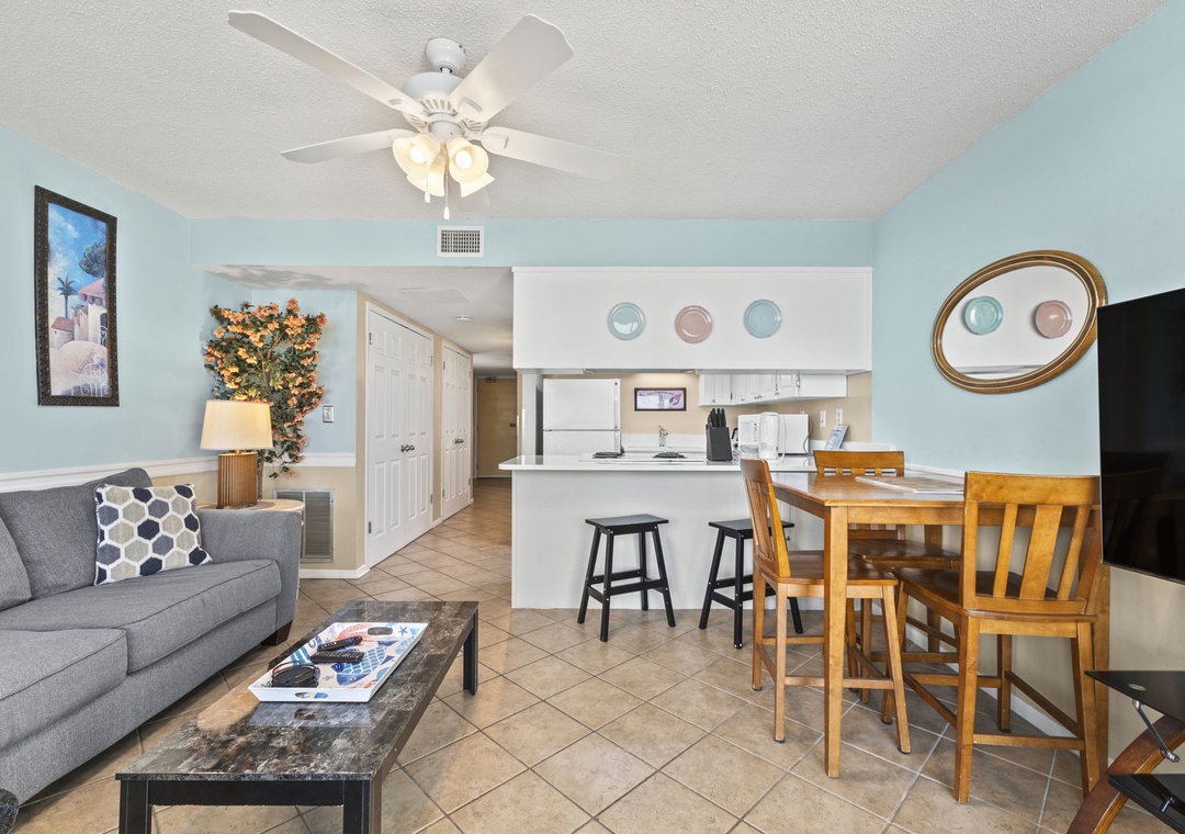 Upon entering, you’ll immediately notice the beach-inspired décor that creates a relaxed and inviting atmosphere. The soothing colors and coastal accents will transport you to a beachfront paradise. Imagine waking up to the sound of gentle waves and having the Gulf Coast at your doorstep. The bedroom features a spacious king-size bed. Maintaining an open and airy feel throughout the condo, please be aware that the master bedroom does not have a privacy door. Additional accommodations are provided with a comfortable queen-size sofa sleeper in the living room, perfect for extra guests or family members.
