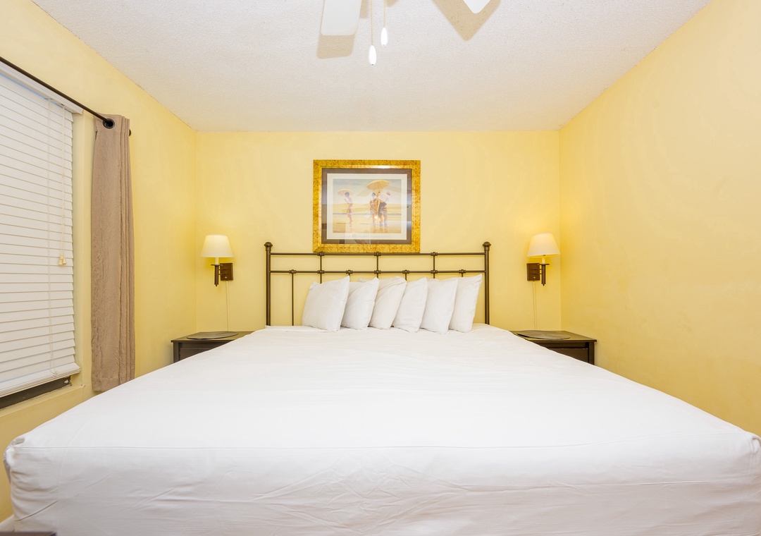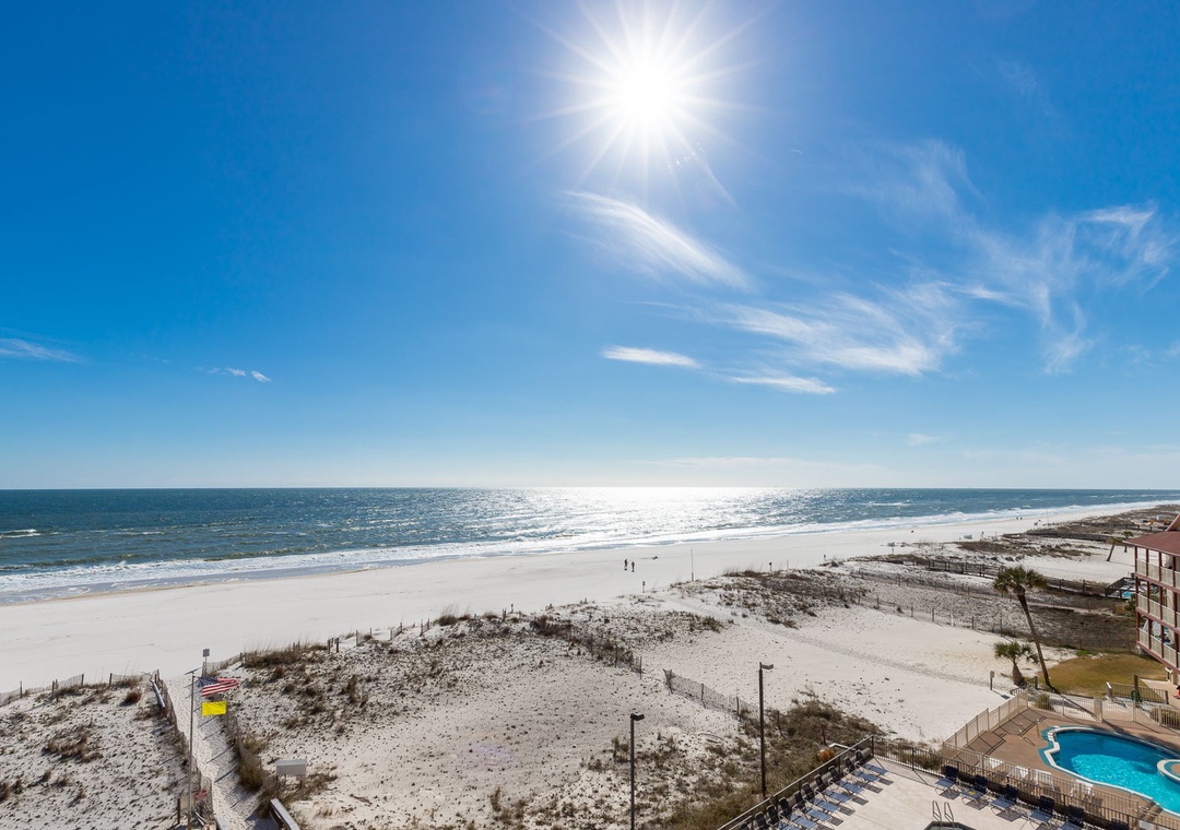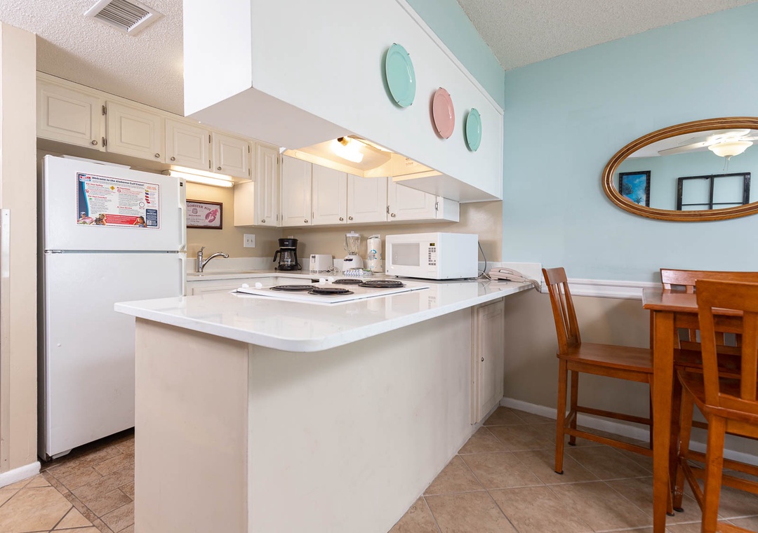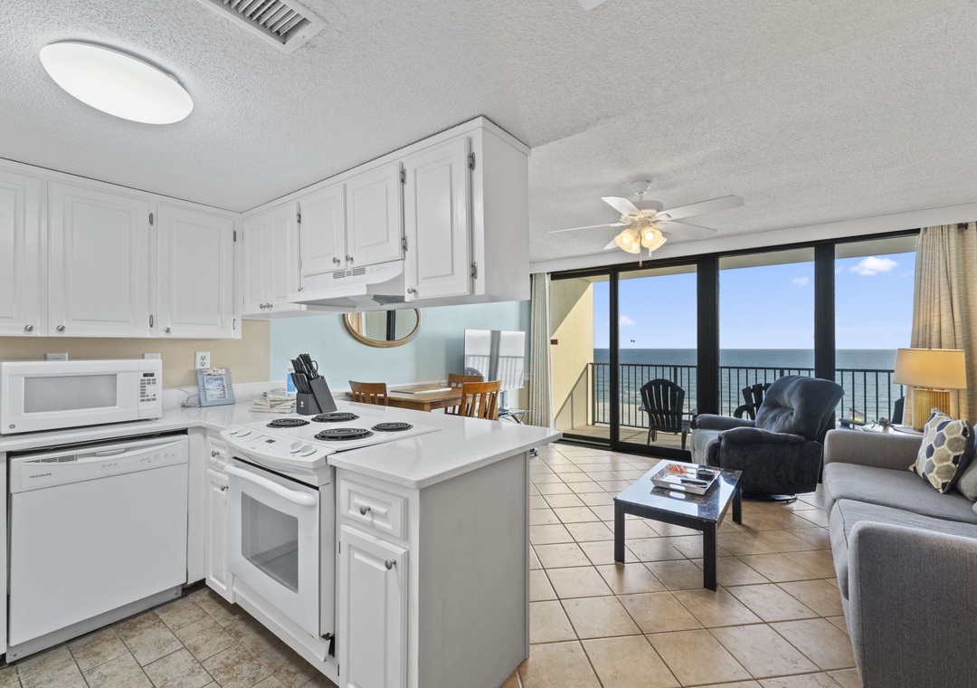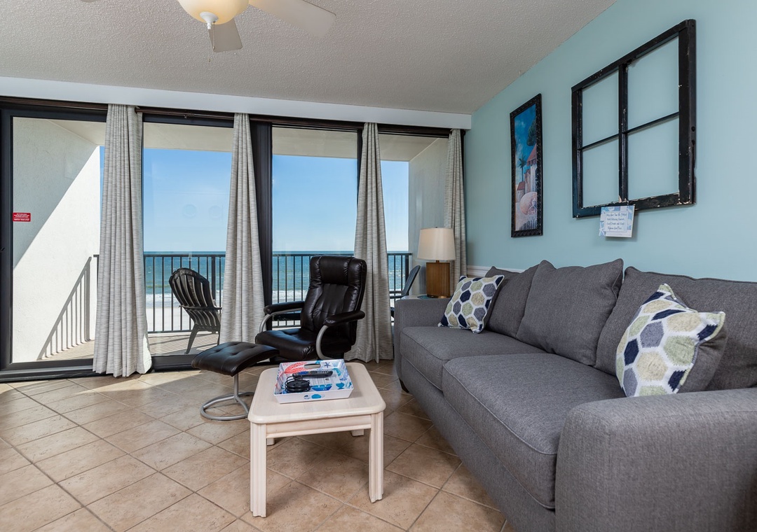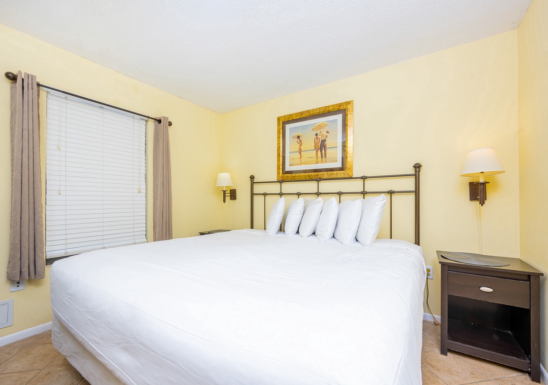 Upon entering, you’ll immediately notice the beach-inspired décor that creates a relaxed and inviting atmosphere. The soothing colors and coastal accents will transport you to a beachfront paradise. Imagine waking up to the sound of gentle waves and having the Gulf Coast at your doorstep. The bedroom features a spacious king-size bed. Maintaining an open and airy feel throughout the condo, please be aware that the master bedroom does not have a privacy door. Additional accommodations are provided with a comfortable queen-size sofa sleeper in the living room, perfect for extra guests or family members.