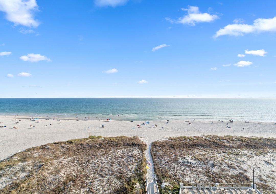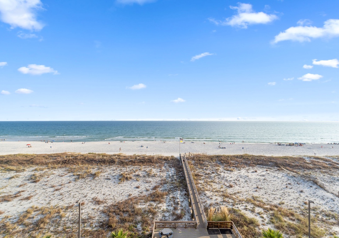 As you relax in the cozy living area, you’ll be treated to beautiful Gulf views through the large windows, creating a picturesque backdrop for your stay. Curl up on the comfortable furnishings or step out onto the first-floor patio to breath in the salty breeze and savor the stunning vistas.
