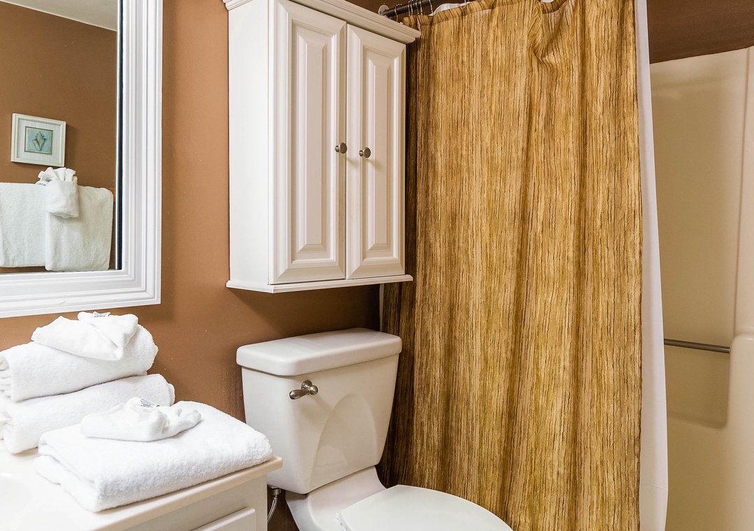 The guest bedroom has two full beds, a 32 inch flat screen television with satellite reception, and a DVD player. The guest bathroom has a solid surface vanity top and a tub and shower