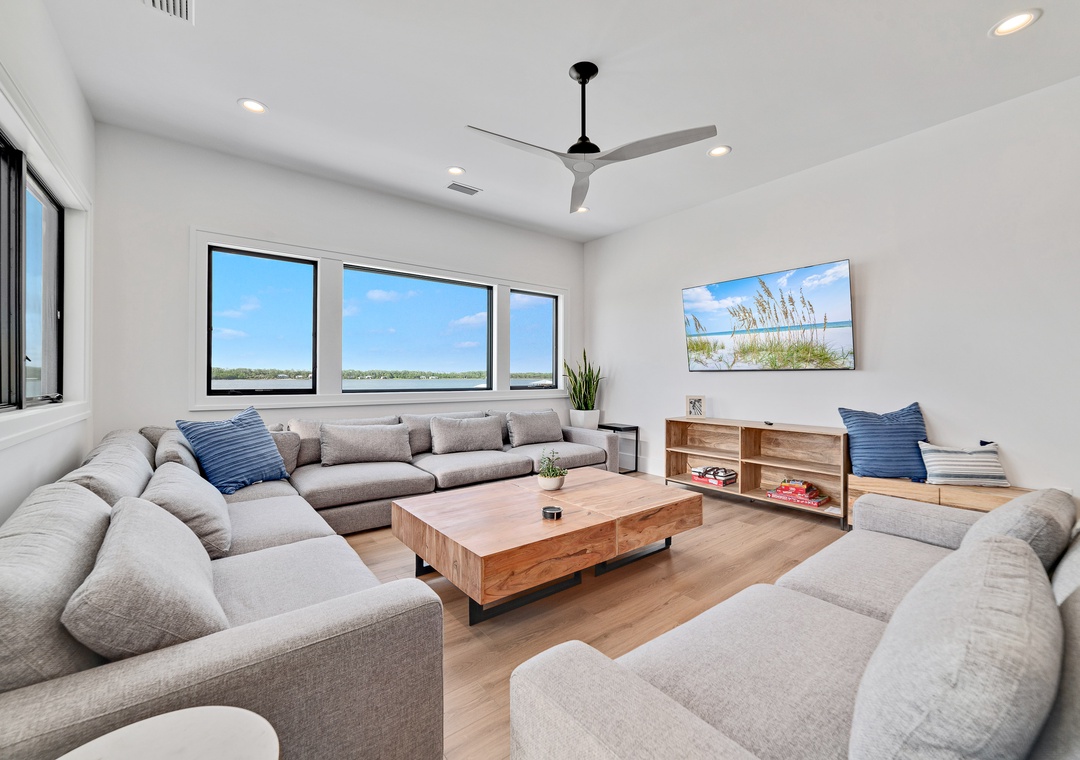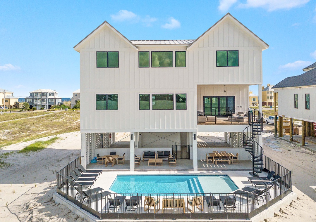 Nestled on the tranquil waters of Little Lagoon and just 1.5 miles from the beach, Keepin’ It Reel is a luxury coastal escape built for large groups, families, and anglers alike. The interior features a modern coastal design with custom furnishings, warm wood tones, and natural light throughout. The open-concept main floor includes a spacious living area, chef’s kitchen, and custom cypress dining tables that seat the entire group, all with views of the water. This level also includes two king bedrooms with ensuite bathrooms, a powder room, full laundry room, and balcony access with spiral stairs leading down to the pool.