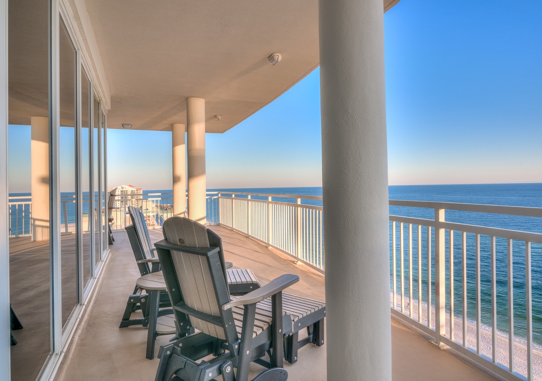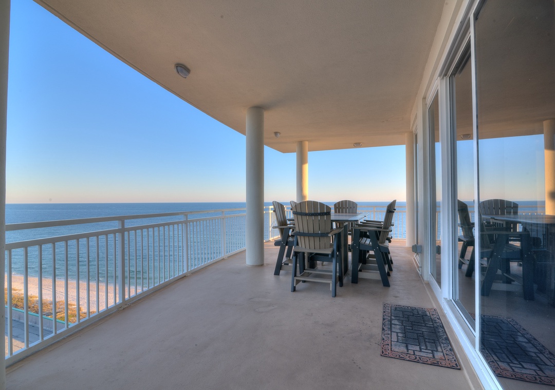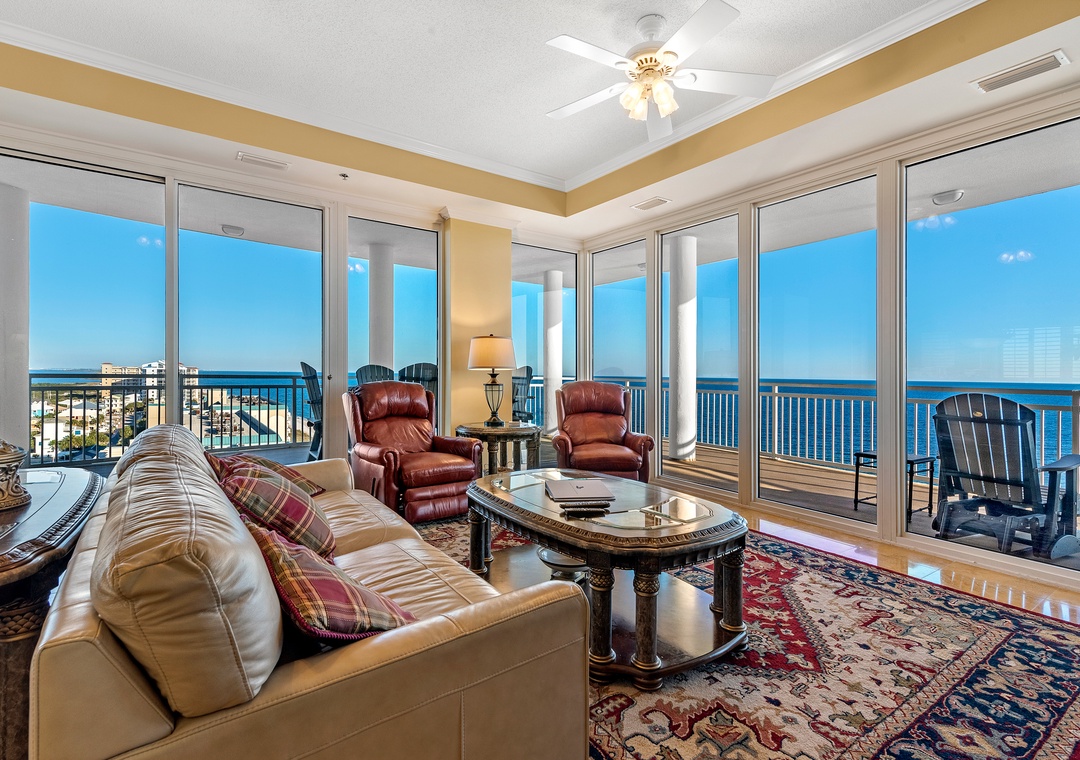 Experience nothing but luxury and opulence on your next vacation when you stay in this 10th floor unit at the La Playa Resort! Featuring an abundance of customized living space and countless upgrades, this lovely property. This stunning 3 bedroom, 3.5 bath home offers every luxury imaginable, making it the perfect destination for a retreat that you’ll never forget. Because it’s an exclusive corner unit, you’ll enjoy the wrap-around balcony and additional floor-to-ceiling windows affording picturesque vistas of Perdido Key’s immaculate beaches! Custom 10' coffered ceilings, moldings and architectural columns in the main living area and designer furnishings, luxury finishes and beautiful accents throughout give the space a distinguished feel. The living area affords plenty of seating, featuring a plush leather sofa and two leather recliners. Kick back and watch the game or a movie with the family on the large LCD television, or open the doors to the 850 square foot beachfront balcony!