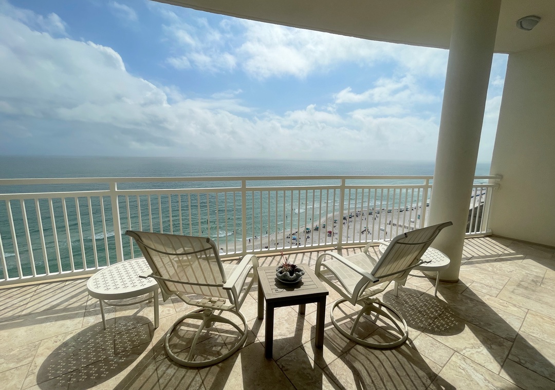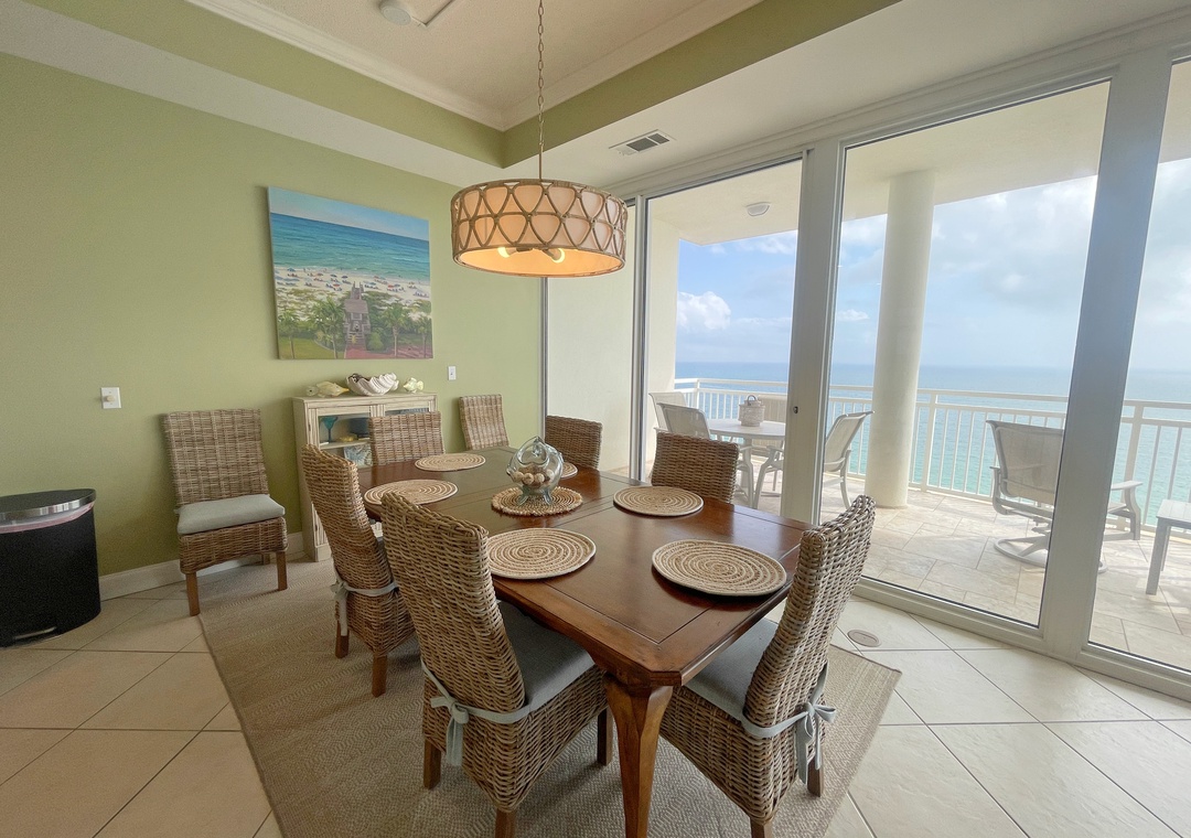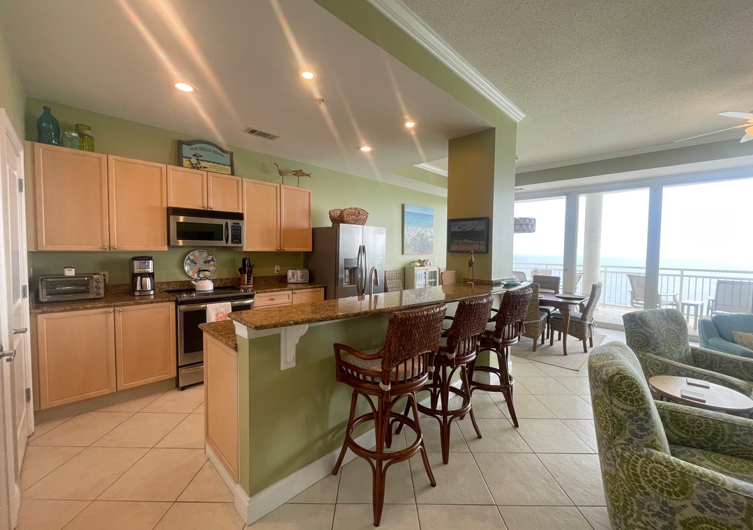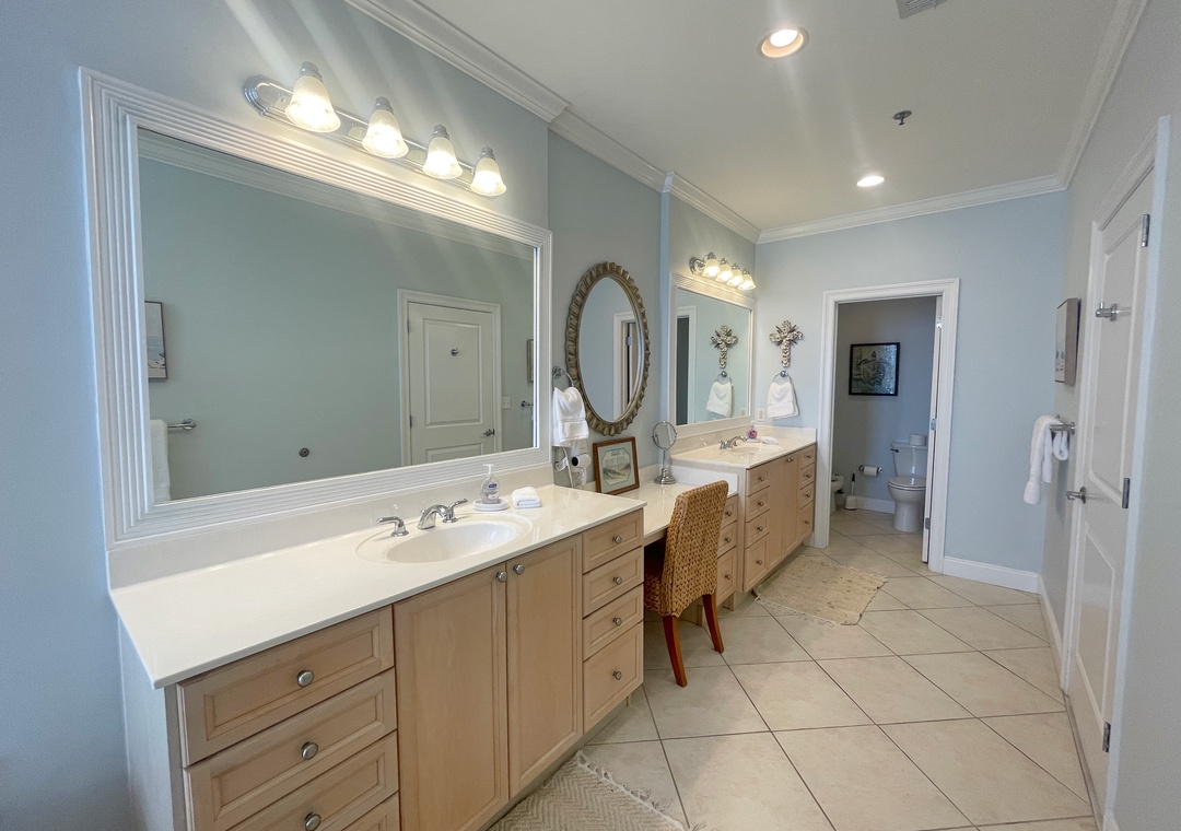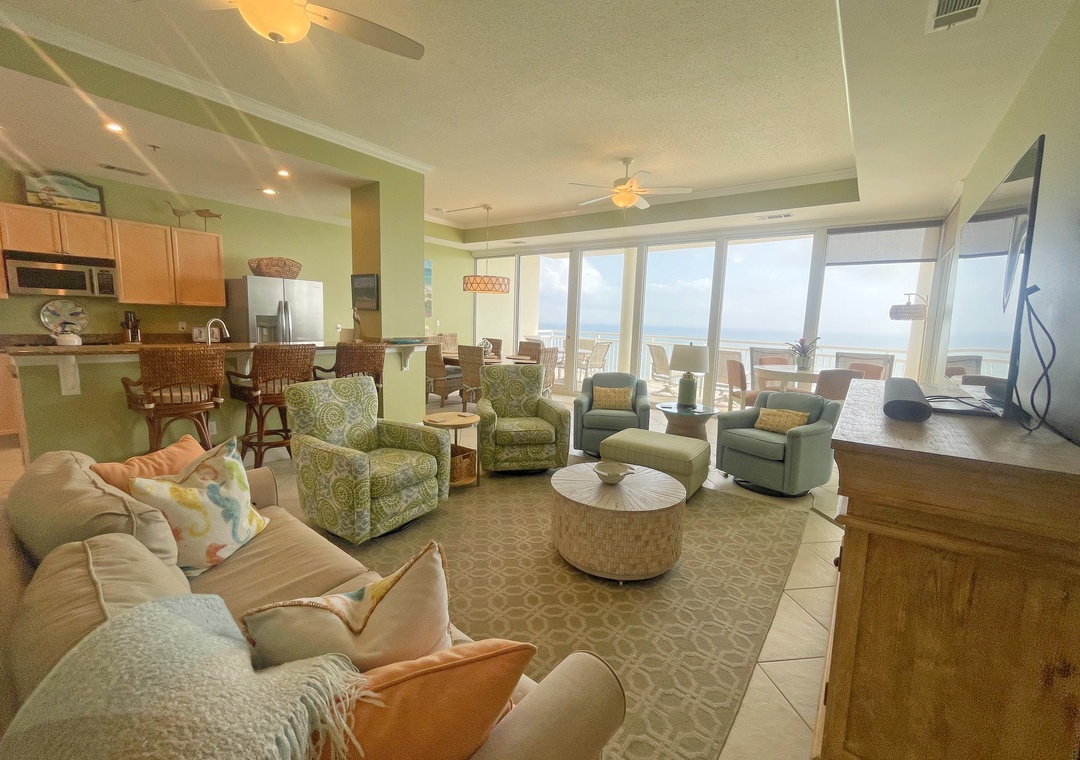 This stunning 10th floor beachfront retreat boasts a spacious open-concept layout, perfect for gathering and enjoying company. The living area is the ultimate lounge space, offering a sofa, 4 cushioned chairs, a large HDTV and beachfront balcony access! The gourmet kitchen offers everything needed to inspire your inner-chef. The dining area offers a beautiful table seating for 6, with additional seating for 3 at the expansive breakfast bar. The primary suite includes a cozy king bed topped with luxury linens, a large LCD television, walk in closet and beachfront terrace access. The ensuite master bath is equally impressive, featuring a huge 2-person jetted tub, separate glass shower, double vanities and even a bidet! The 2nd and 3rd bedrooms are equally accommodating, each hosting premium mattresses, soft linens, flat screen TVs and private baths, plus northerly views of the Key highlighting the Intercoastal Waterway and Old River.