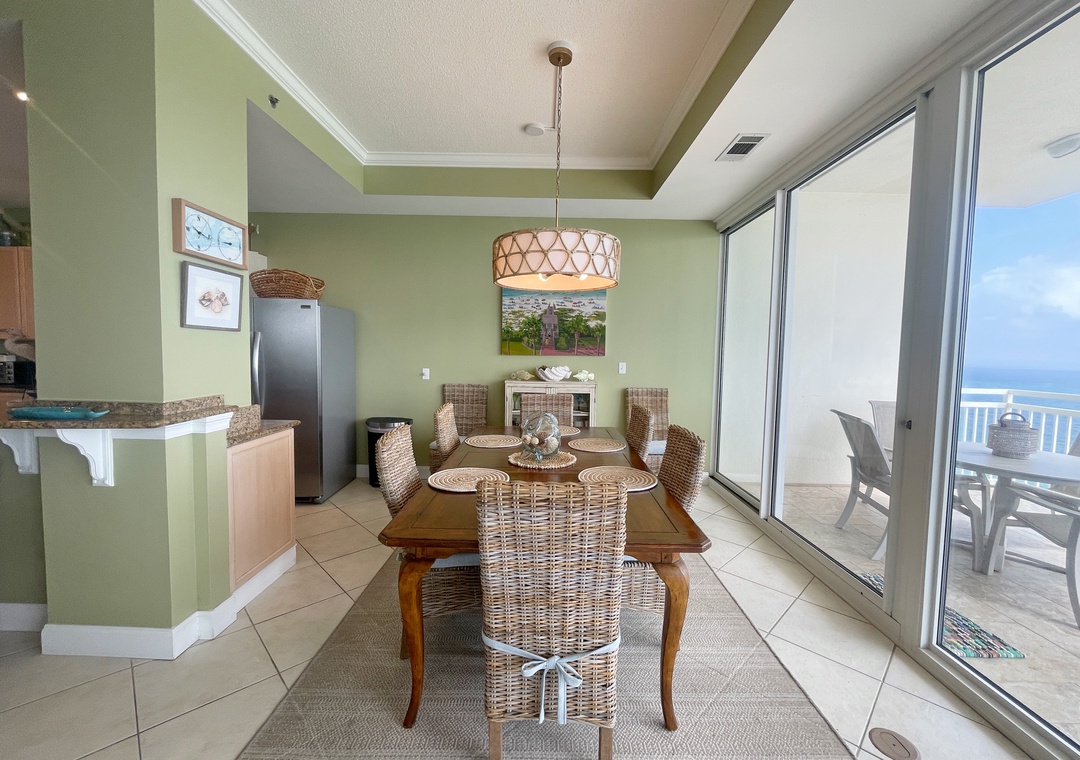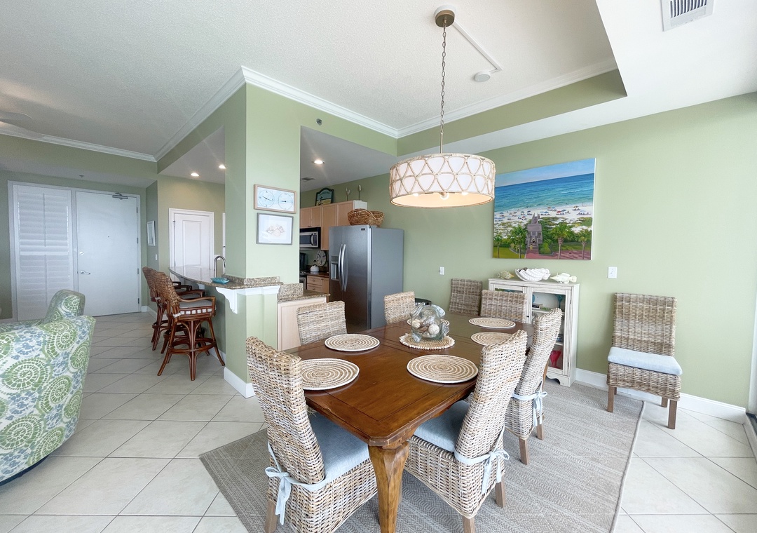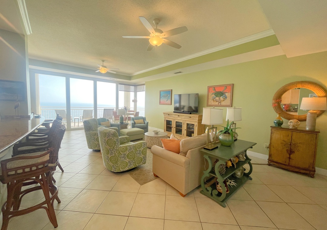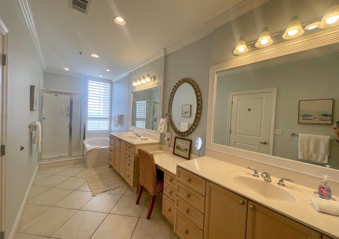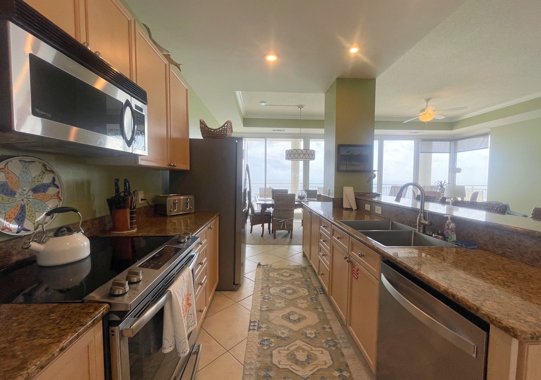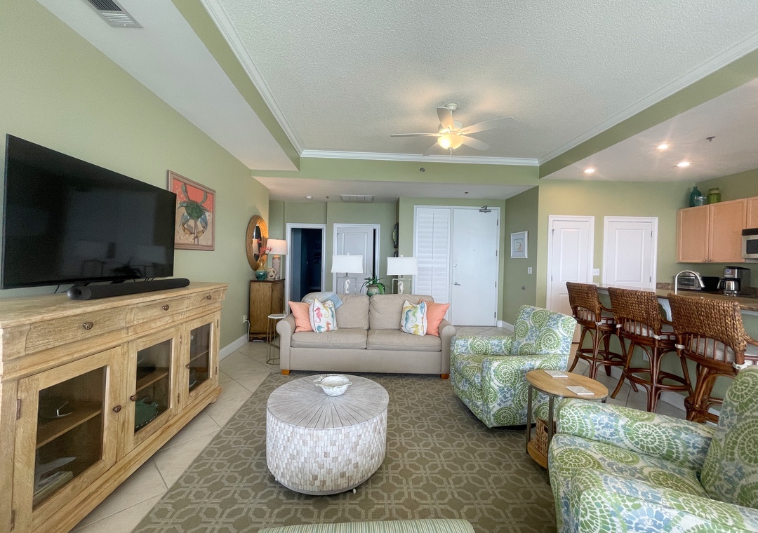 This stunning 10th floor beachfront retreat boasts a spacious open-concept layout, perfect for gathering and enjoying company. The living area is the ultimate lounge space, offering a sofa, 4 cushioned chairs, a large HDTV and beachfront balcony access! The gourmet kitchen offers everything needed to inspire your inner-chef. The dining area offers a beautiful table seating for 6, with additional seating for 3 at the expansive breakfast bar. The primary suite includes a cozy king bed topped with luxury linens, a large LCD television, walk in closet and beachfront terrace access. The ensuite master bath is equally impressive, featuring a huge 2-person jetted tub, separate glass shower, double vanities and even a bidet! The 2nd and 3rd bedrooms are equally accommodating, each hosting premium mattresses, soft linens, flat screen TVs and private baths, plus northerly views of the Key highlighting the Intercoastal Waterway and Old River.