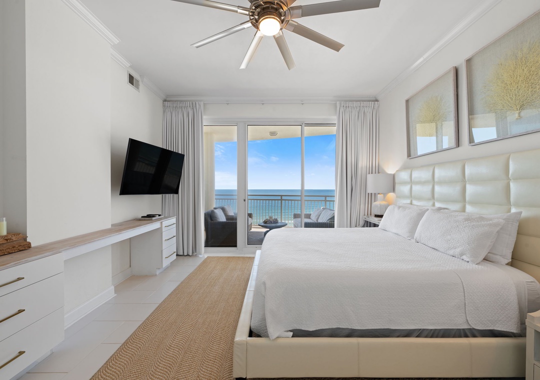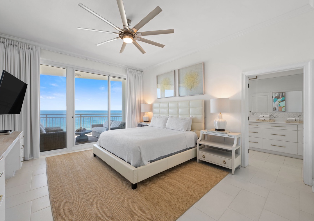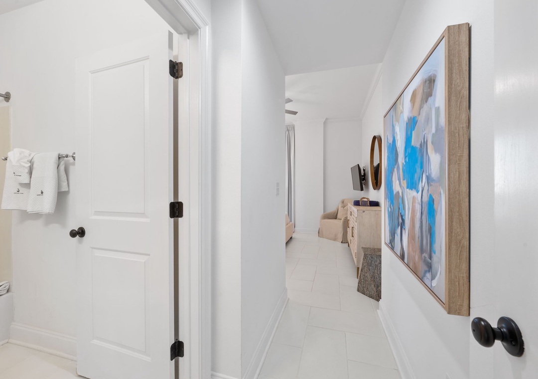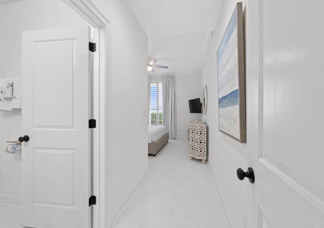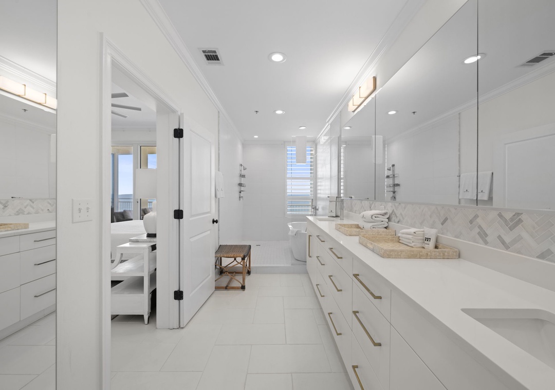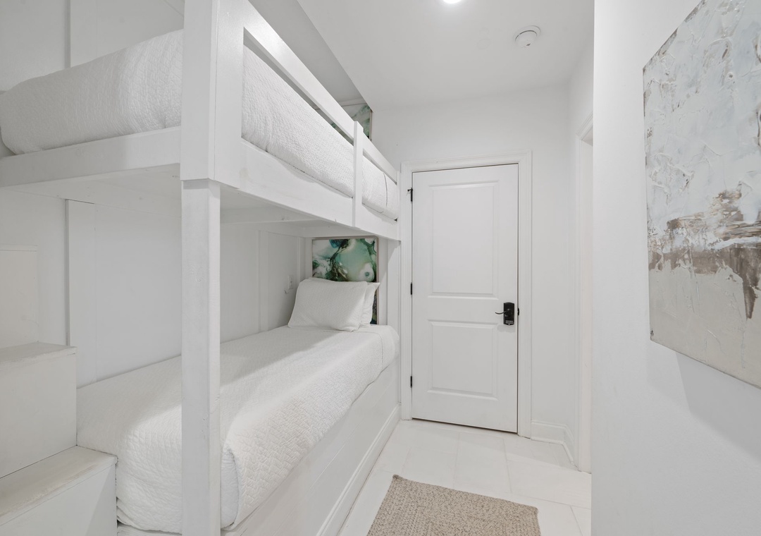 The gorgeous master suite includes a cozy king bed topped with luxury linens and posh bedding. You’ll also enjoy a large LCD television, walk in closet and beachfront terrace access. The ensuite master bath is equally impressive, featuring a 2-person jetted tub, huge separate glass shower and double vanities. The second and third bedrooms serve as bonus masters, each offering a king bed as well! There is also a with a bunk bed featuring 2 twins in the hall.