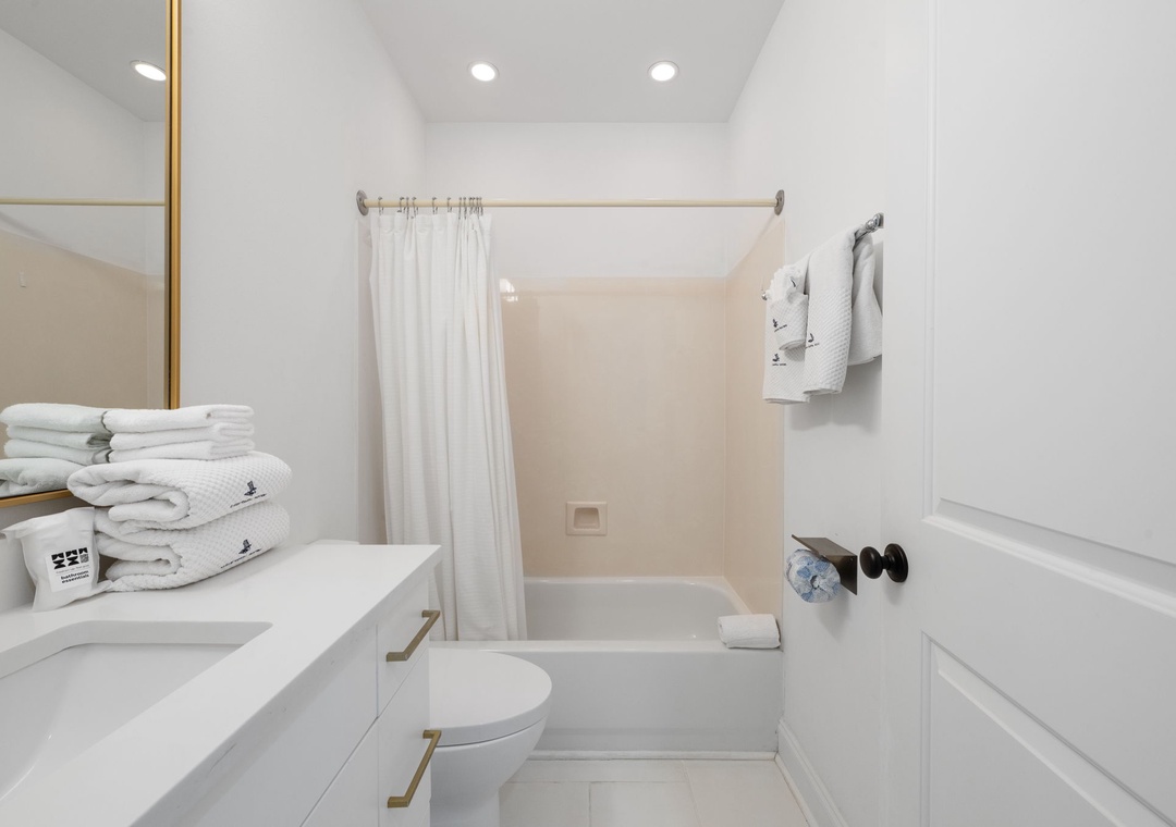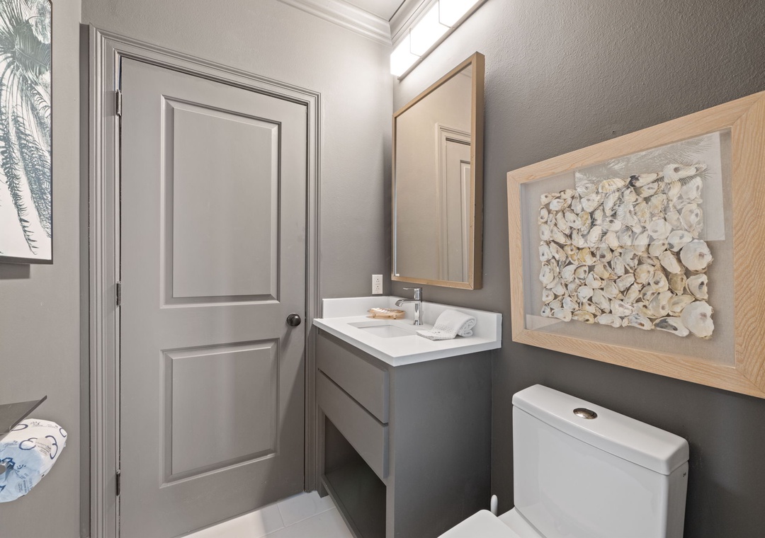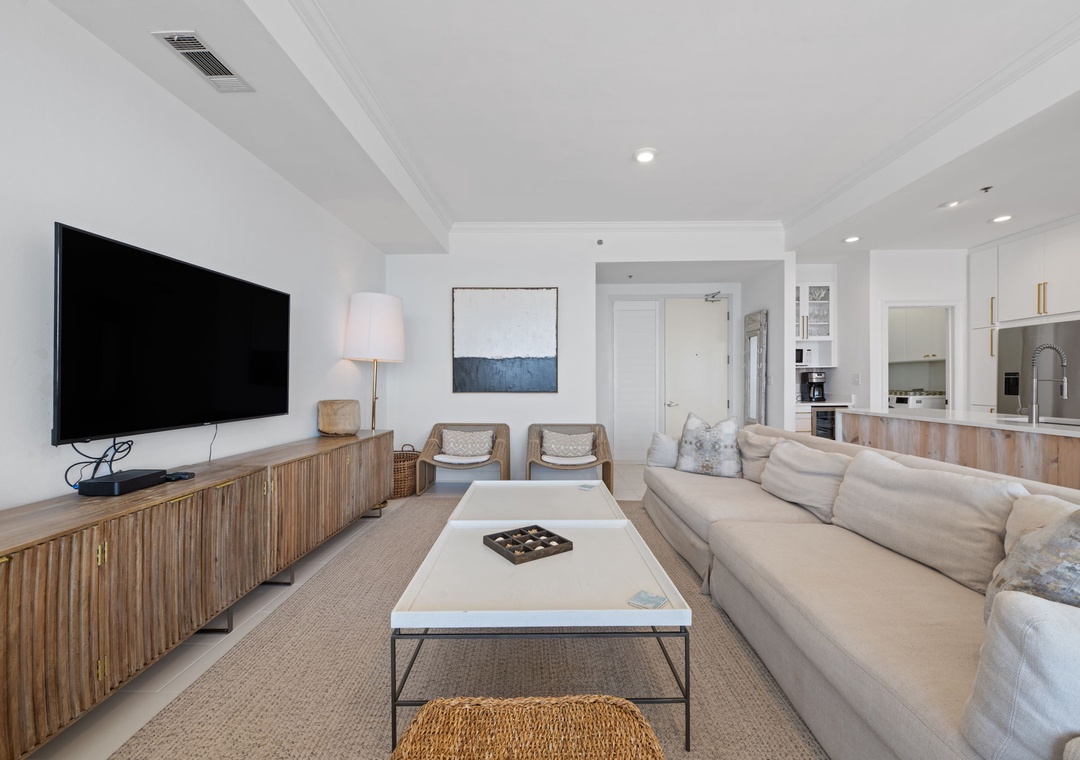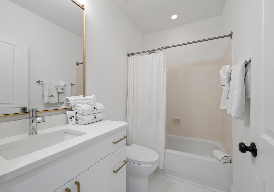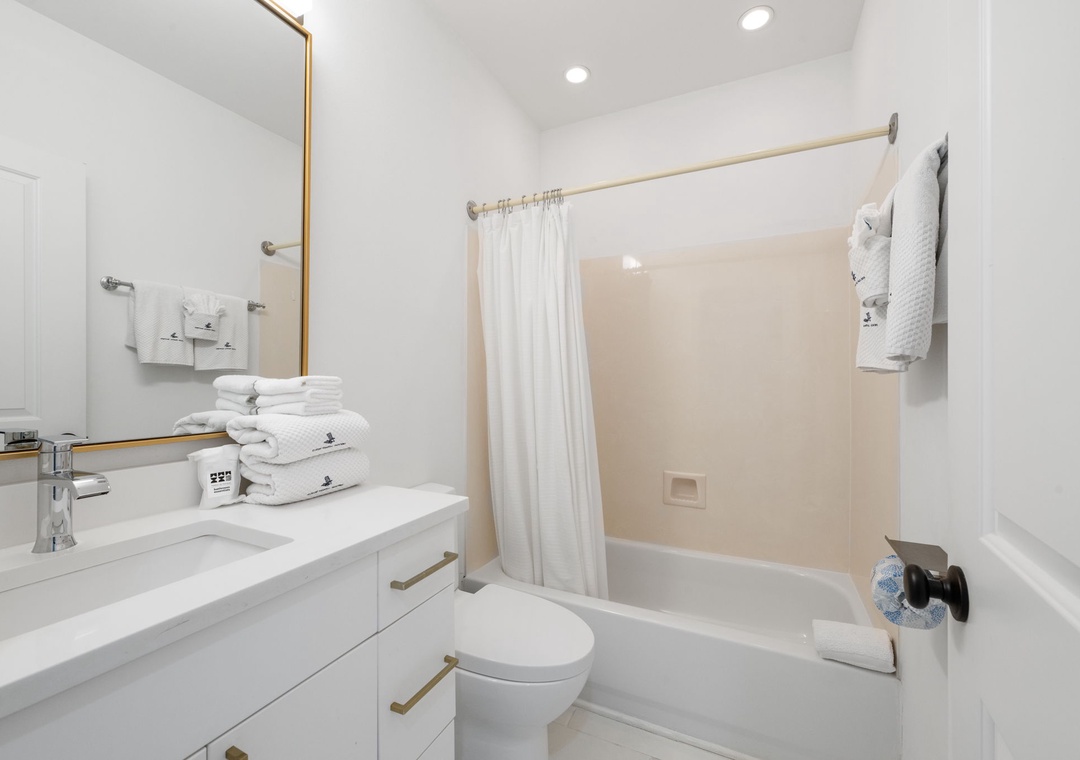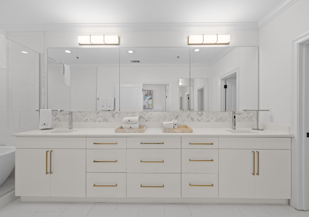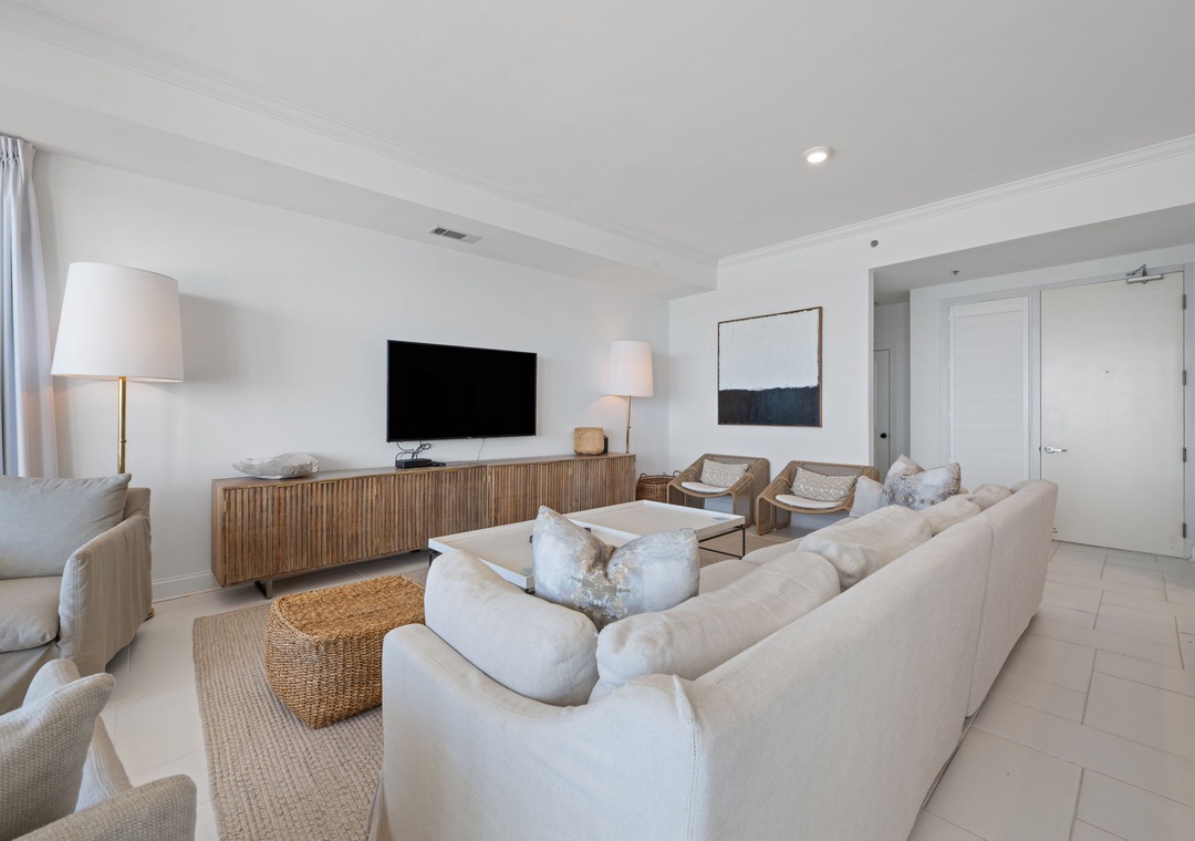 The gorgeous master suite includes a cozy king bed topped with luxury linens and posh bedding. You’ll also enjoy a large LCD television, walk in closet and beachfront terrace access. The ensuite master bath is equally impressive, featuring a 2-person jetted tub, huge separate glass shower and double vanities. The second and third bedrooms serve as bonus masters, each offering a king bed as well! There is also a with a bunk bed featuring 2 twins in the hall.