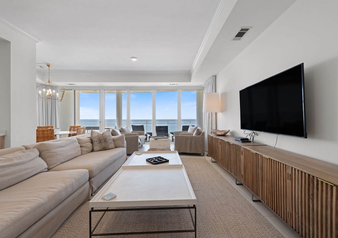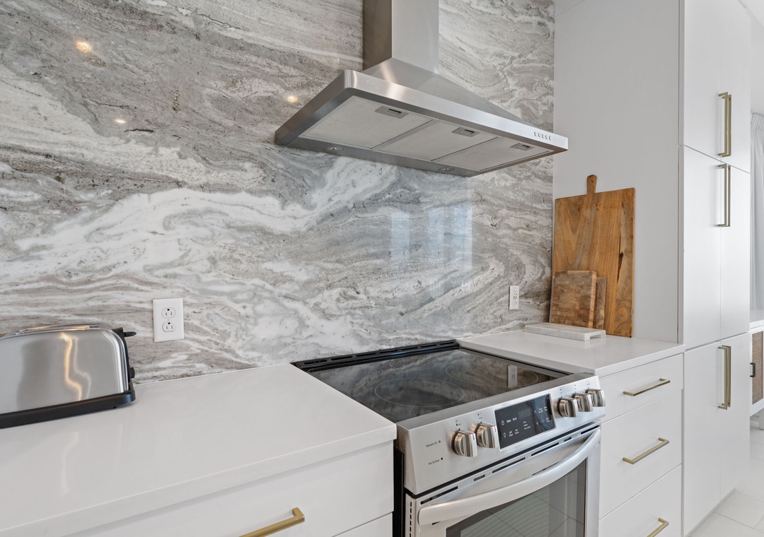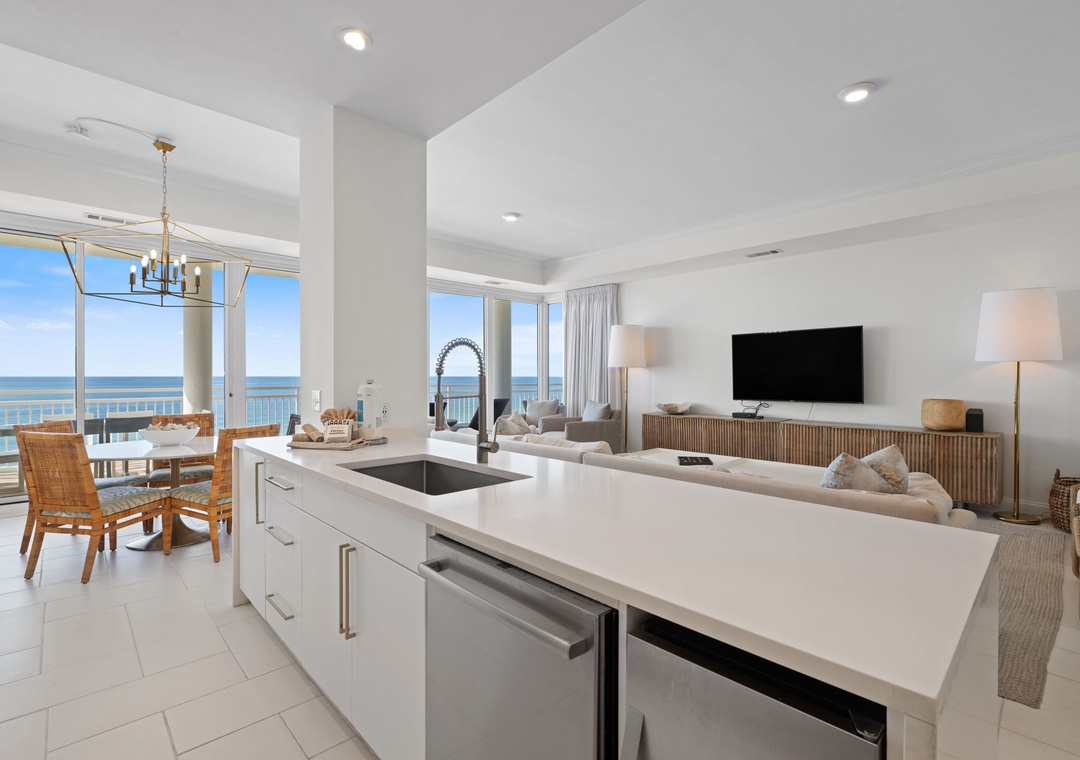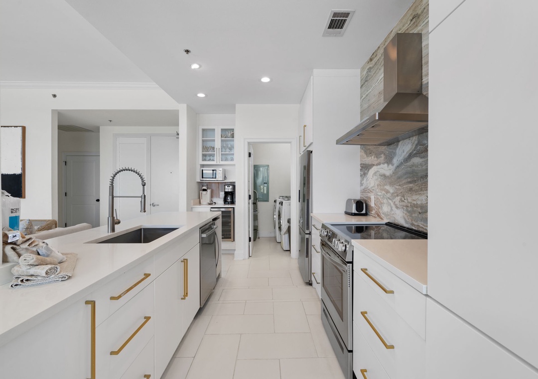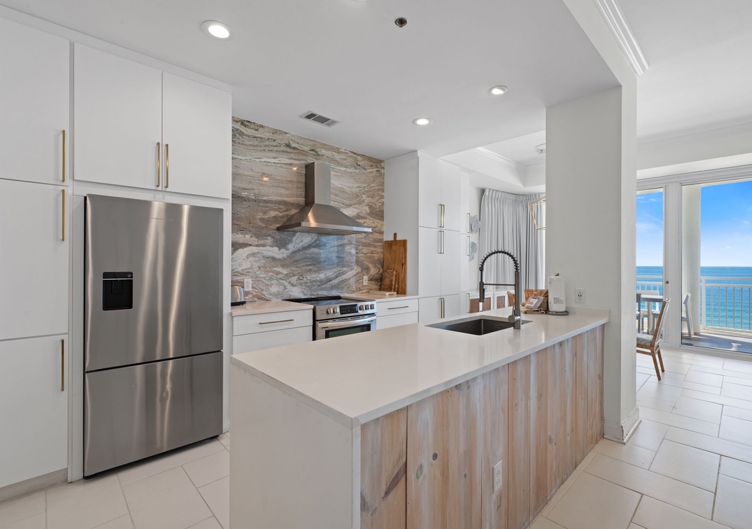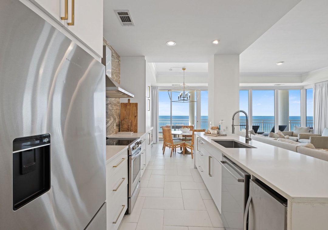 The uber modern living room boasts floor-to-ceiling windows with tons of natural light and an expansive ocean view. With all new plush seating there is plenty of room to hang out and watch the view or catch a game on the large flat screen TV! The expansive terrace is your comfortably-furnished outdoor living room. The dining room seats 4 at the coastal chic table, with additional seating at the breakfast bar. The fully equipped updated gourmet kitchen features stainless appliances, granite counters, modern custom cabinetry,and plentiful storage space. Whether you love to cook or prefer eating out, you’ll enjoy preparing your favorite meal in this gourmet kitchen!