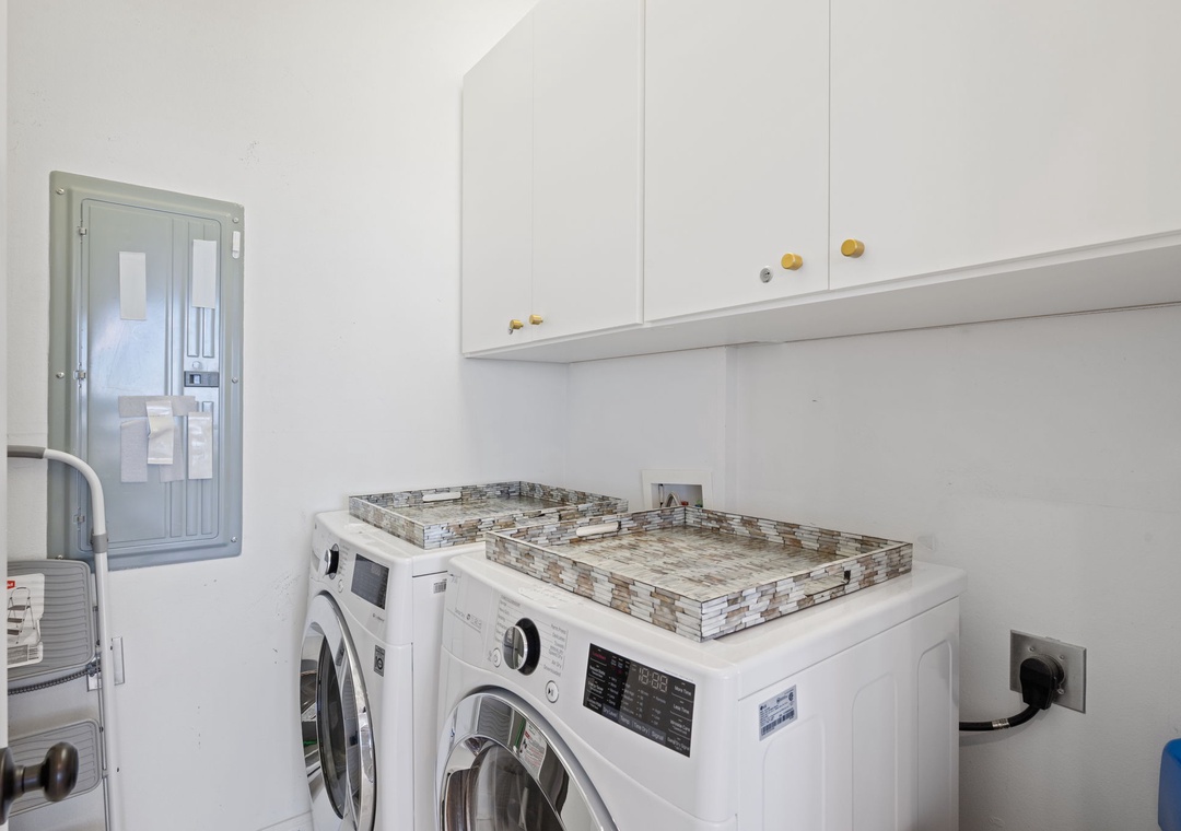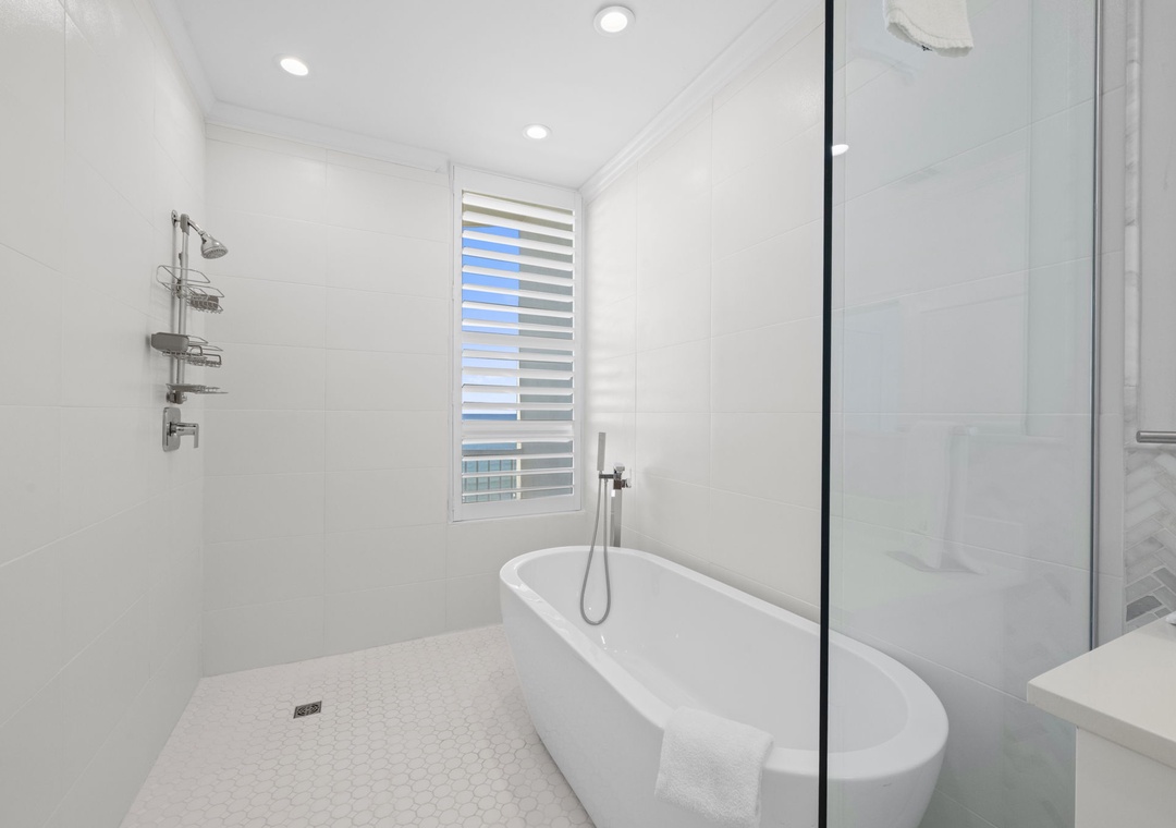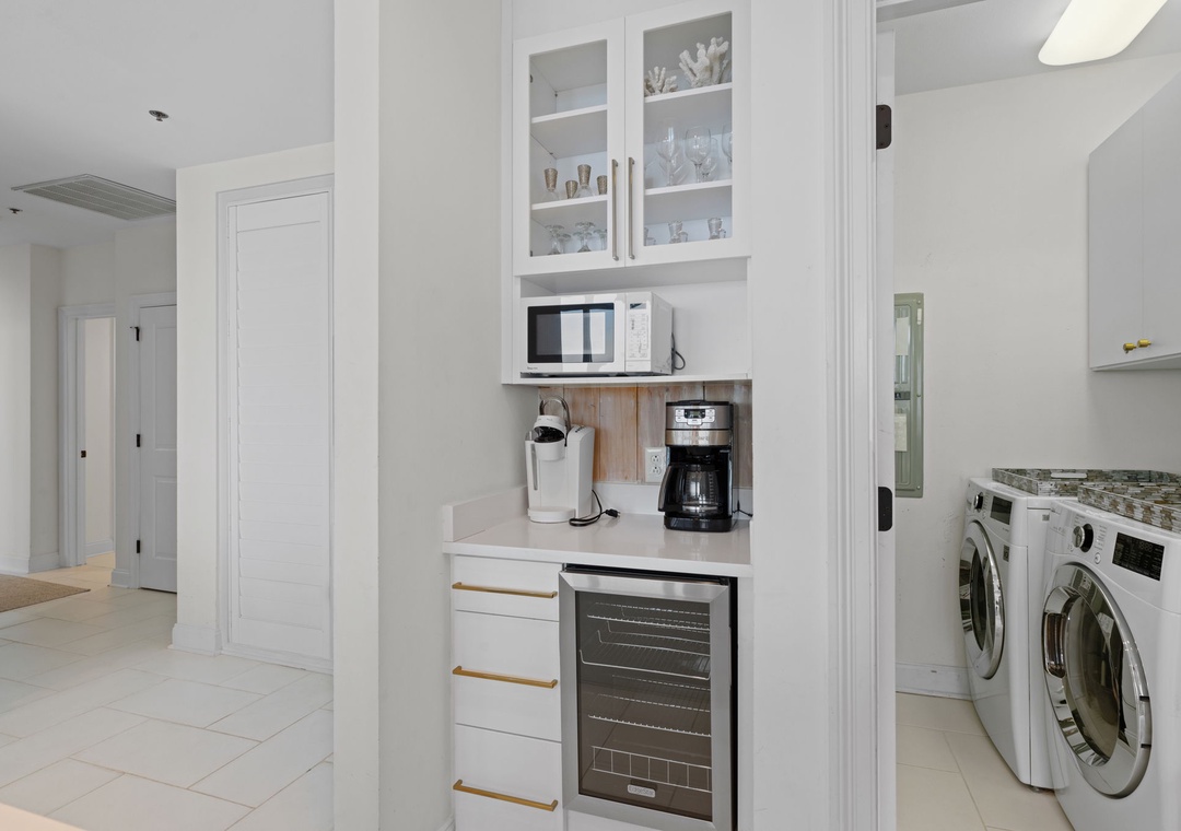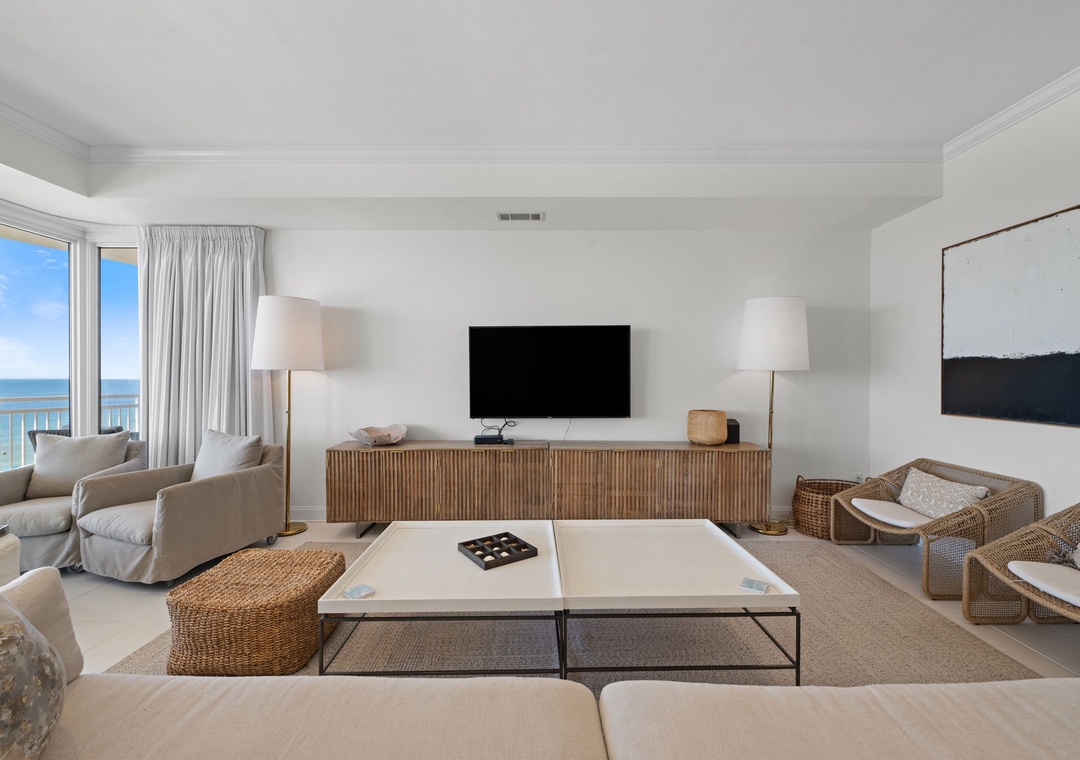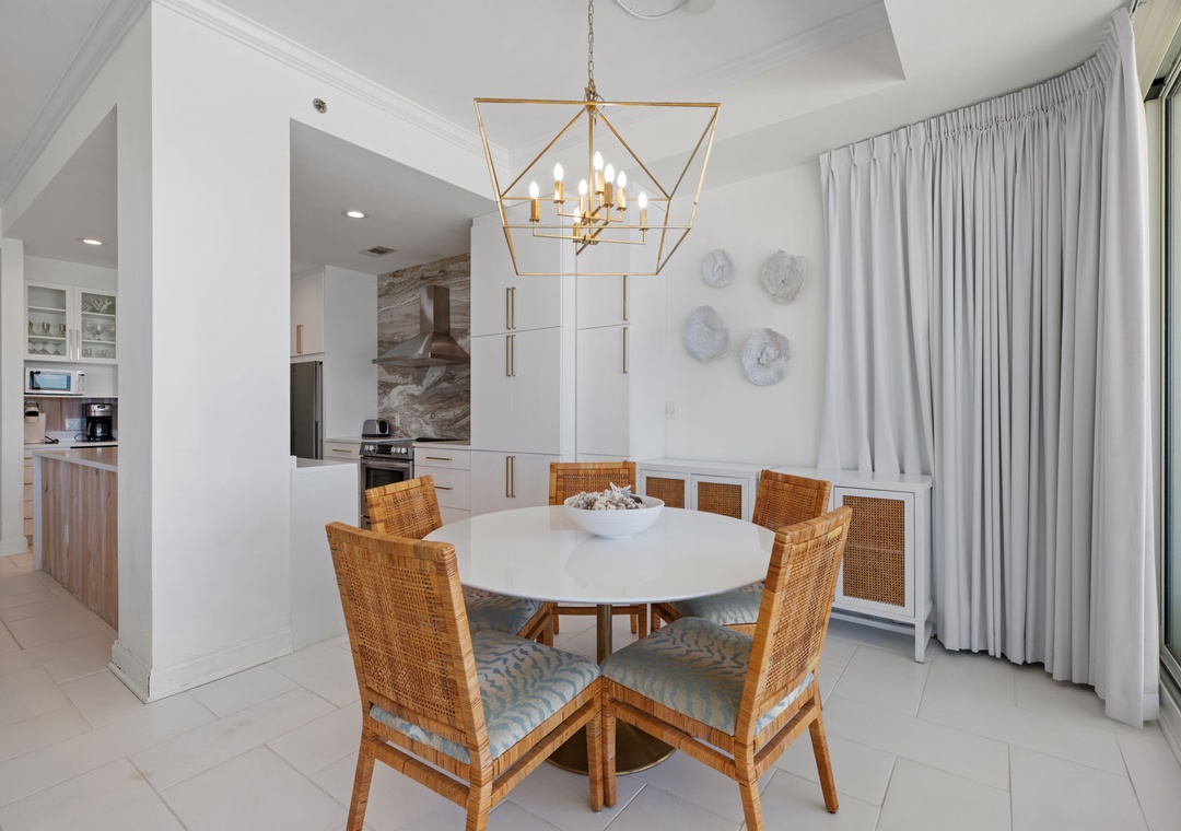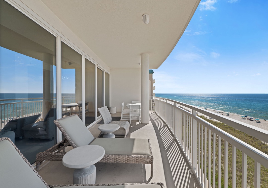 The uber modern living room boasts floor-to-ceiling windows with tons of natural light and an expansive ocean view. With all new plush seating there is plenty of room to hang out and watch the view or catch a game on the large flat screen TV! The expansive terrace is your comfortably-furnished outdoor living room. The dining room seats 4 at the coastal chic table, with additional seating at the breakfast bar. The fully equipped updated gourmet kitchen features stainless appliances, granite counters, modern custom cabinetry,and plentiful storage space. Whether you love to cook or prefer eating out, you’ll enjoy preparing your favorite meal in this gourmet kitchen!