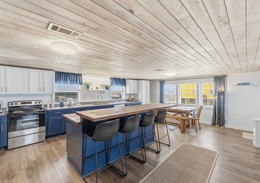 Bright and airy, the open-concept living area is lined with windows that flood the space with natural light and breathtaking water views. A comfy sectional invites you to kick back with a movie on the large flat-screen TV, while the dining area and breakfast bar together seat 9. The fully equipped kitchen, with two refrigerators, makes meal prep a breeze.