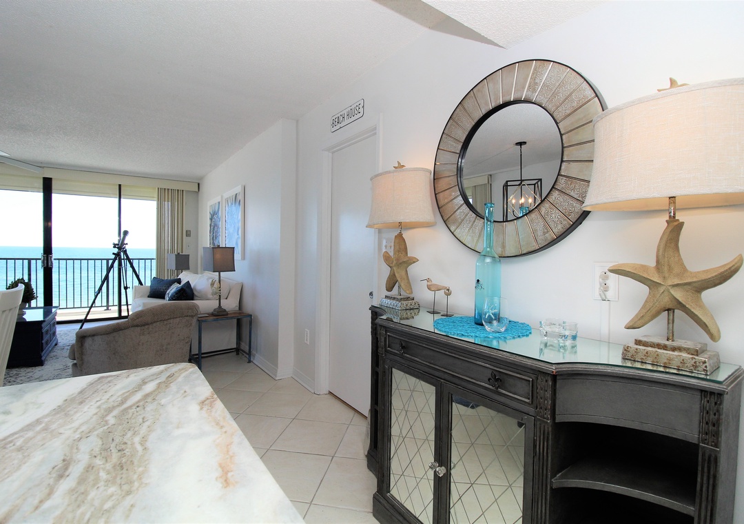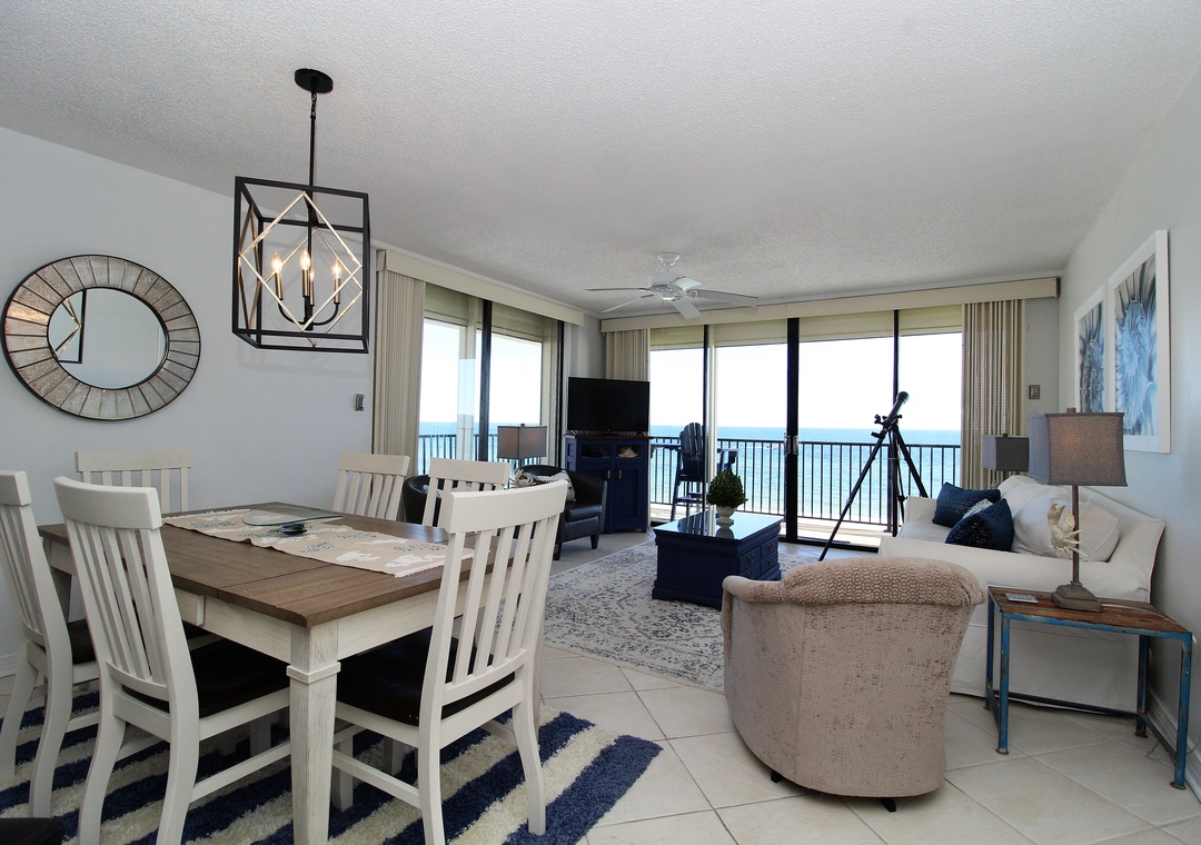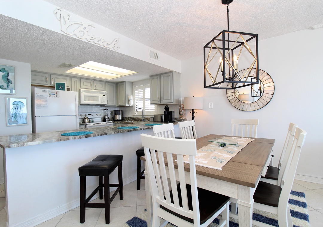 This new coastal chic condo offers astounding views of the gulf due to its floor-to-ceiling glass windows that surround the living area. The dining area hosts seating for 6 at the table and an additional 3 at the bar. The spacious kitchen is a chef's dream, with ample counter space and plenty of cookware to create a wonderful meal.