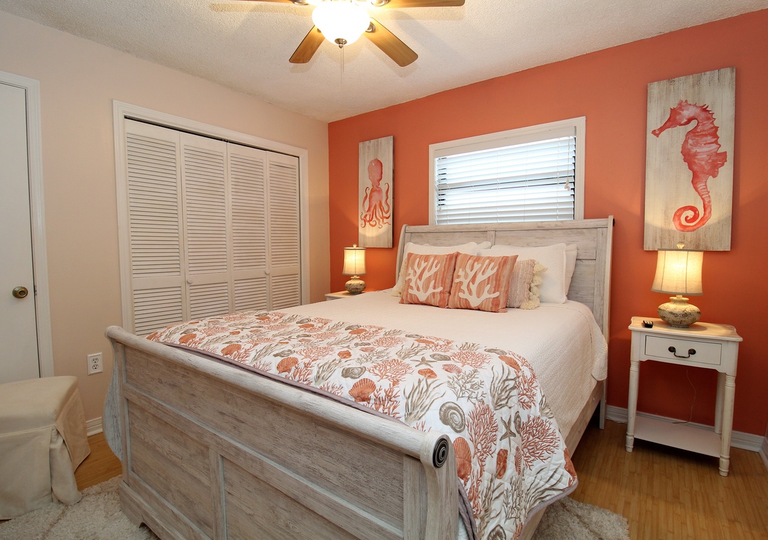 The master bedroom offers a king bed with direct gulf views and an ensuite bathroom that is perfect for a relaxing soak. The second bedroom has a queen bed with an attached bath, while the third hosts two full beds.