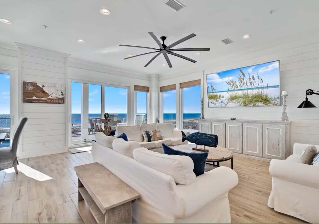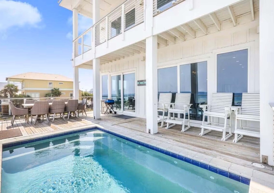 Lil Tip Sea, Gulf Shores On the main level of the home guests will enjoy a large, open-concept kitchen, living and dining area with 180-degree beach views, a half-bath, two queen bedrooms, each with their private bath, an expansive beachfront balcony with a private pool (pool can be heated for an extra fee), and beach boardwalk. The dining table will seat eight guests, the kitchen island will seat five guests, and the outdoor dining table will seat 8. The beautifully decorated living area features an 85” TV, shiplap walls, and comfortable seating for 12. The well-appointed kitchen is stocked with ample dishes, cookware, and utensils. It features two sets of stainless appliances (two ovens, two side-by-side refrigerators, two dishwashers), granite counters, and an icemaker. Just off the kitchen is a laundry area, a half-bath, and two queen guest rooms, each with private baths.