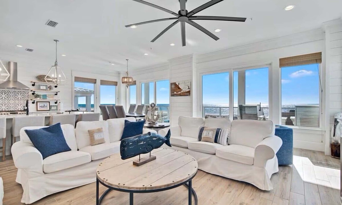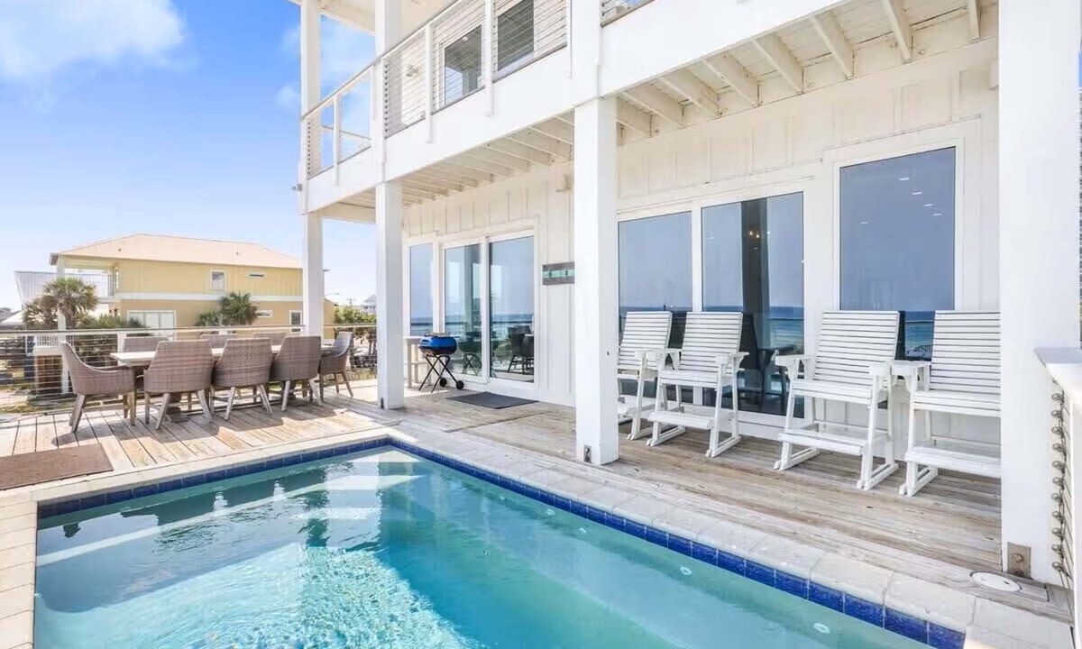 This fantastic 8-bedroom, 8.5-bath home is located directly on West Beach in Gulf Shores, AL. Built in 2021 and professionally decorated in a coastal-elegant décor, this home sleeps 16 guests on three levels, making it ideal for a family gathering or corporate retreat. It has a private pool, a beach-boardwalk, two laundry areas, a large “kid’s den” or “secondary den” on the second level, and a large living/dining/kitchen area on the main level. Combine these luxuries with covered parking, a BBQ area under the home, an outdoor shower, and unparalleled views from one of five private balconies, and you have a beach home that dreams are made of.