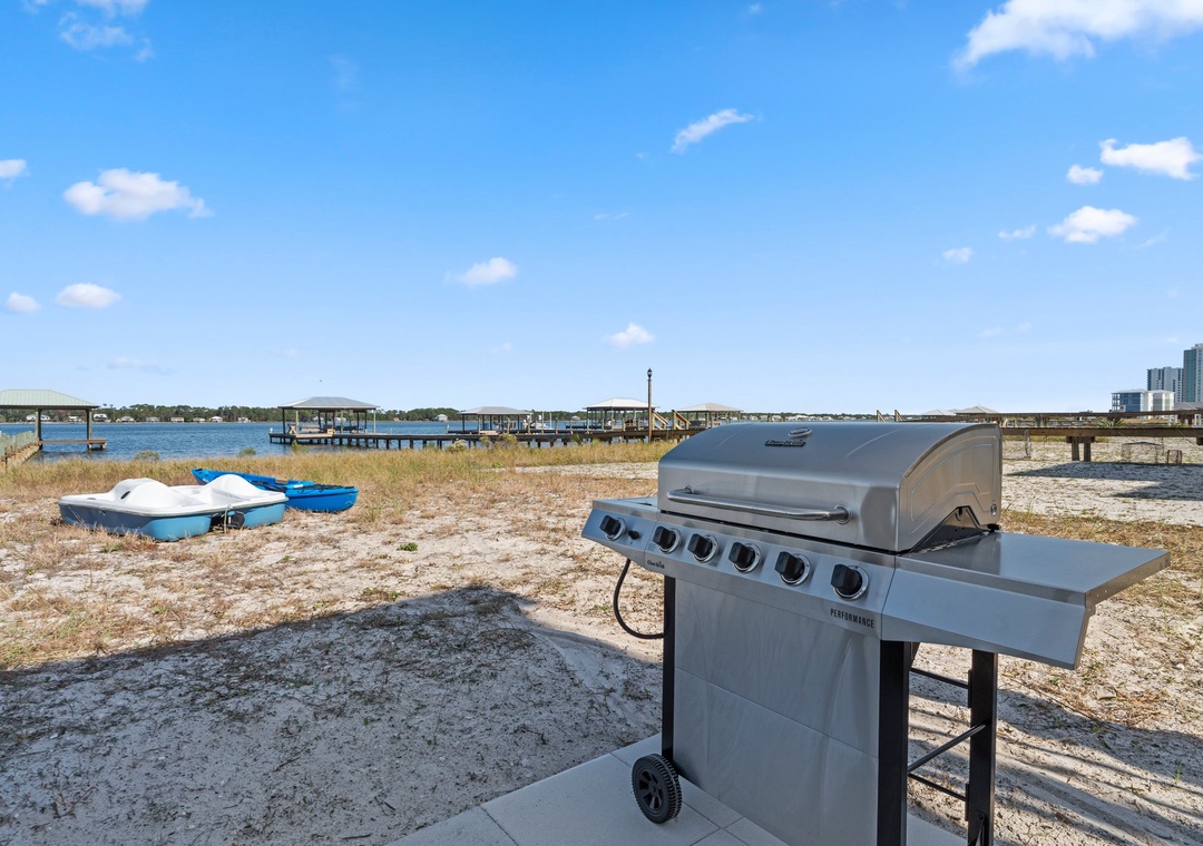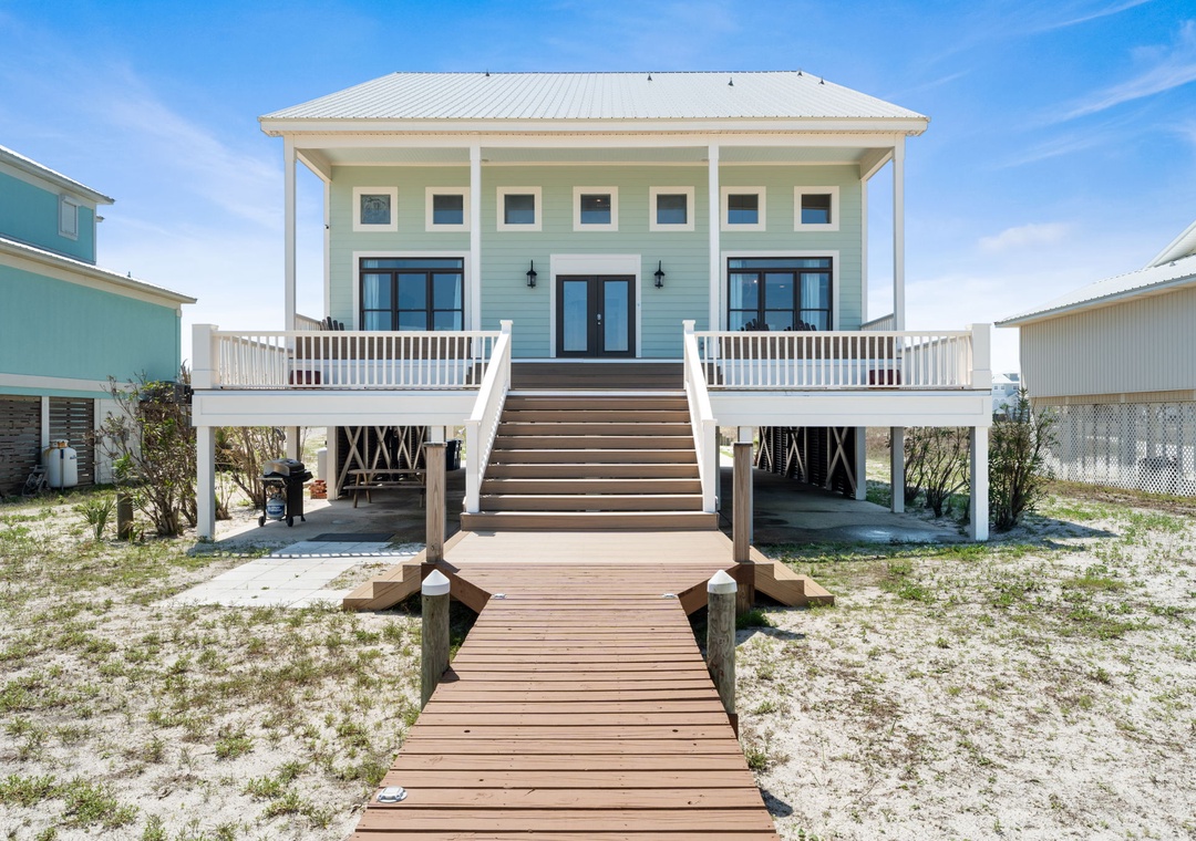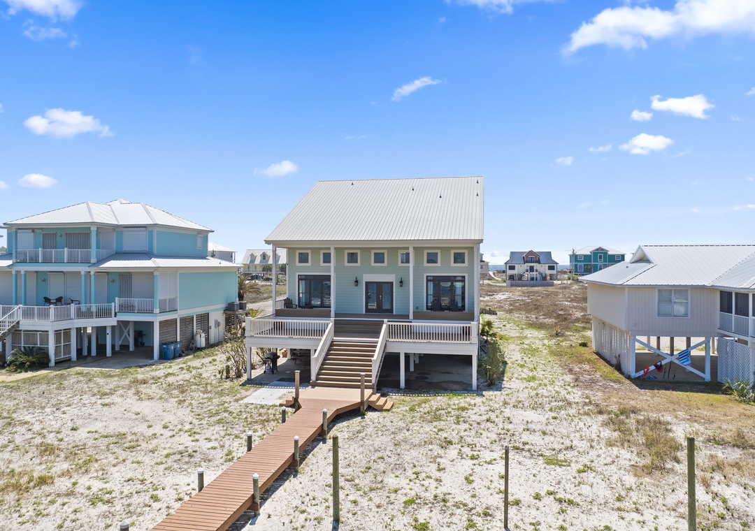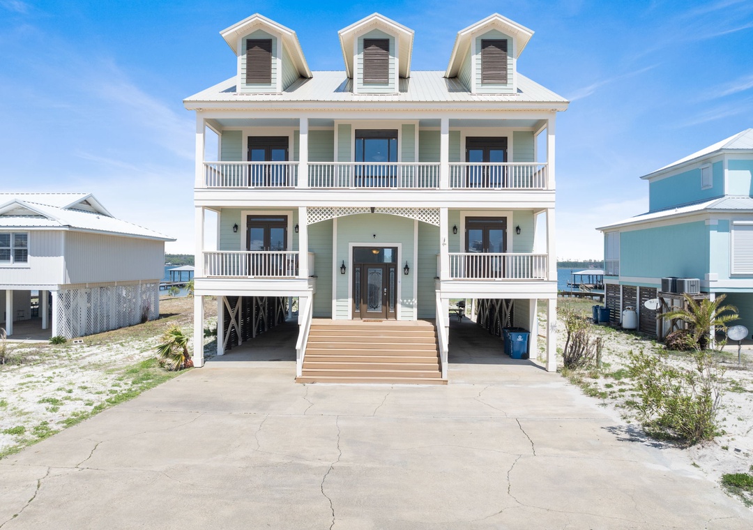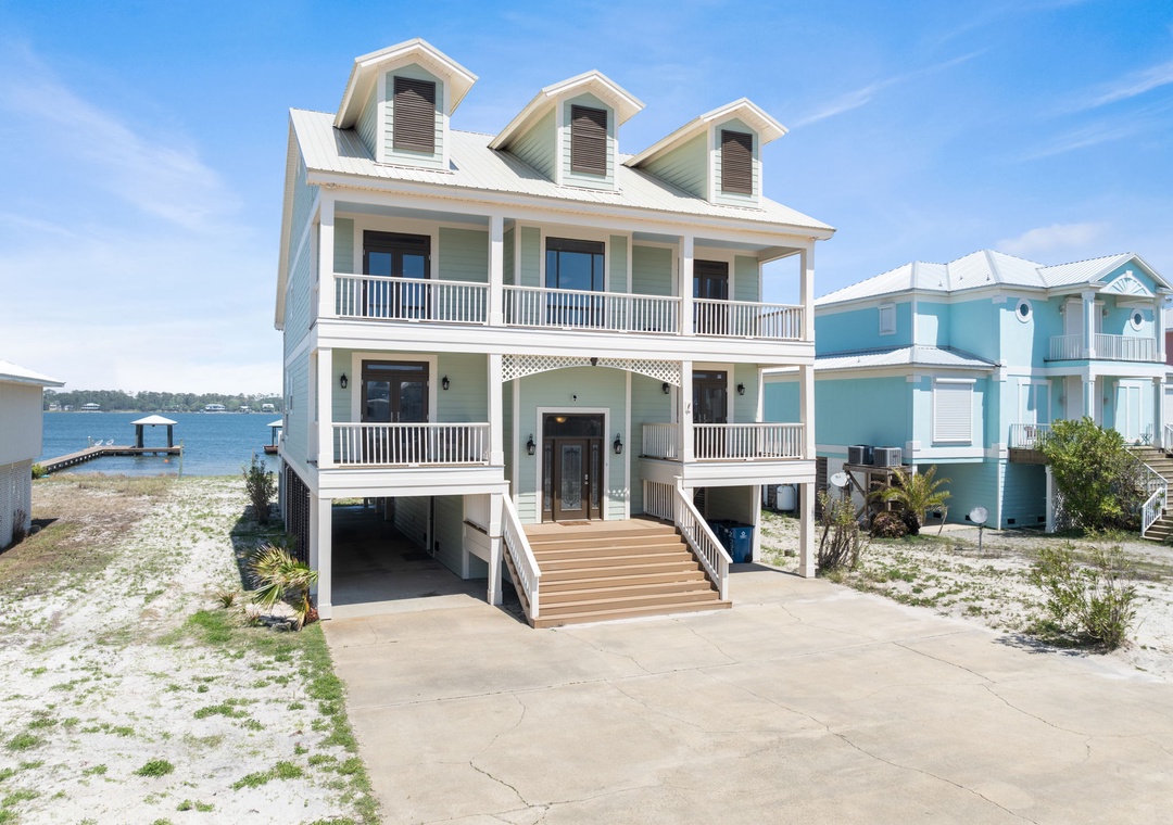 As you step inside, the open-concept living space on the first floor provides a bright and spacious atmosphere with large windows offering breathtaking views of Little Lagoon. Get cozy in front of the fireplace during the winter months. The top floor features two king bedrooms with ensuite bathrooms and private balconies facing the pristine beach just across the street. A main floor king bedroom and a bunk room with two twin over full bunk beds, each with its own ensuite bathroom, offer comfortable accommodations for all. Outside, a gas grill and picnic table invite you to savor outdoor meals and moments.