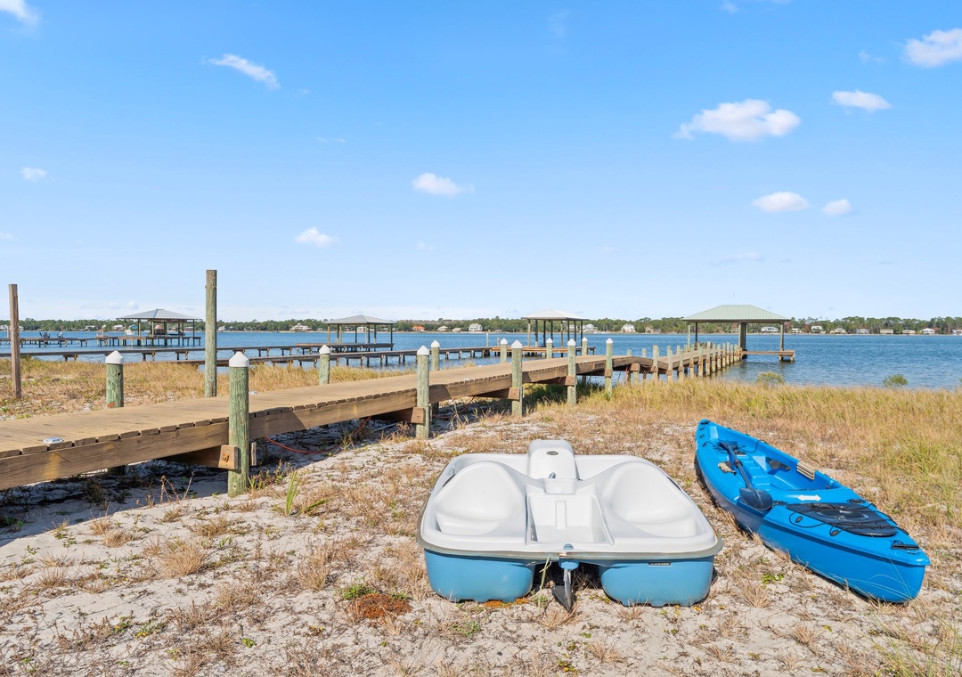 "Lime in the Coconut" is a stunning 4-bedroom, 4-bathroom coastal retreat nestled in the serene West Beach neighborhood of Gulf Shores. This luxurious home offers a one and a half mile walk or a short drive distance to the Lagoon Pass Park or West Beach Access, making it an ideal getaway for water enthusiasts. Enjoy the convenience of a private pier and boat dock, along with a beach cart stocked with boogie boards, floats, beach toys, and more for your seaside adventures. Additionally, take advantage of the paddle boat and kayak provided for a delightful aquatic experience.