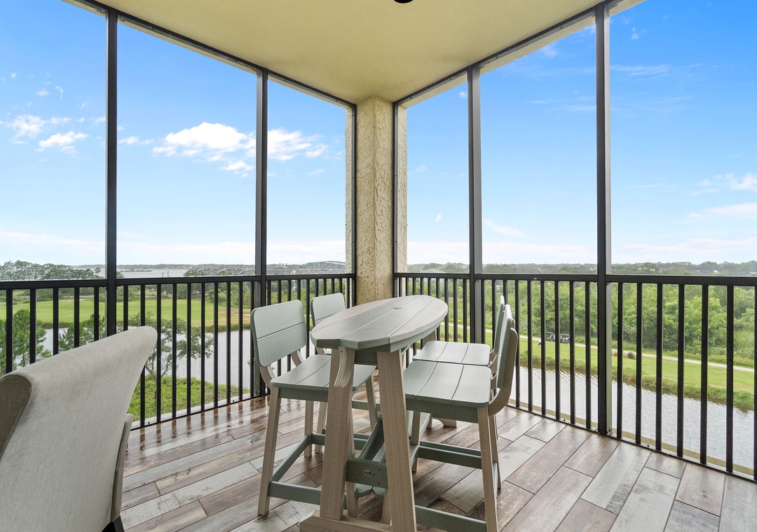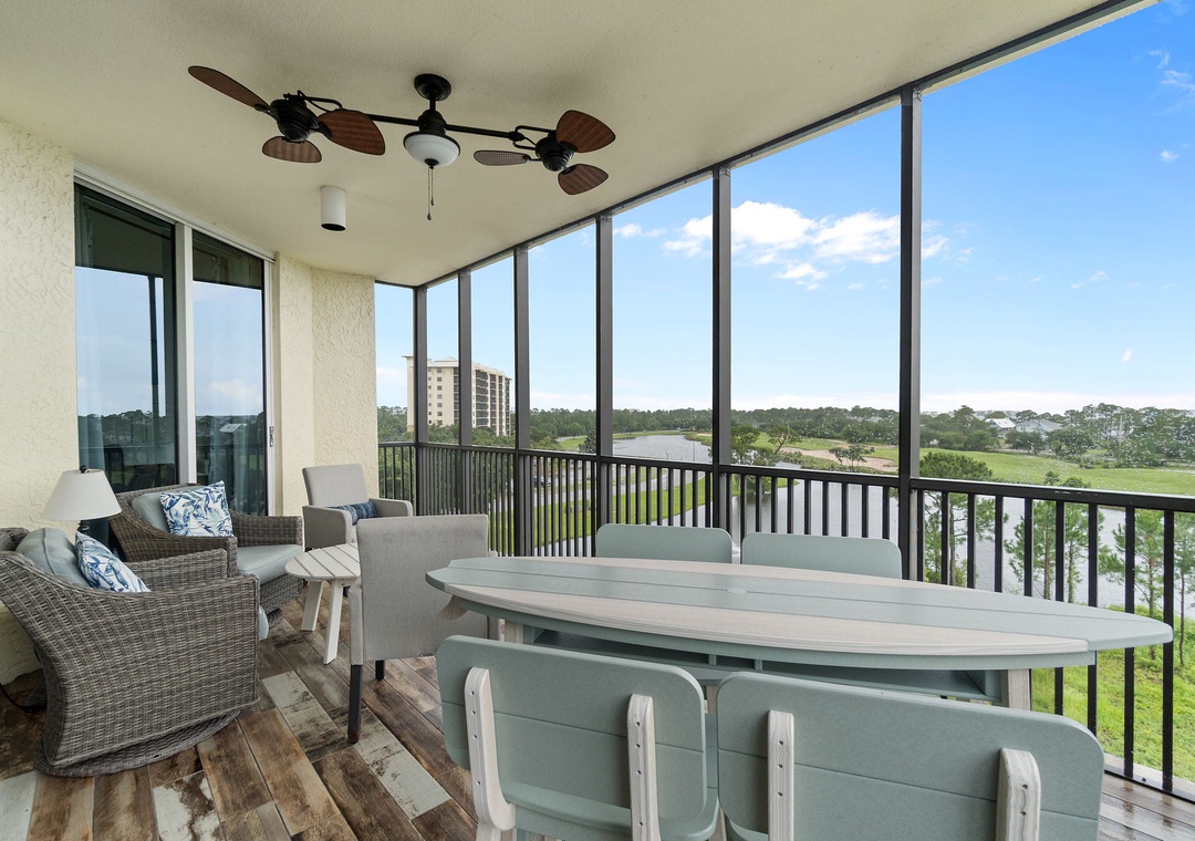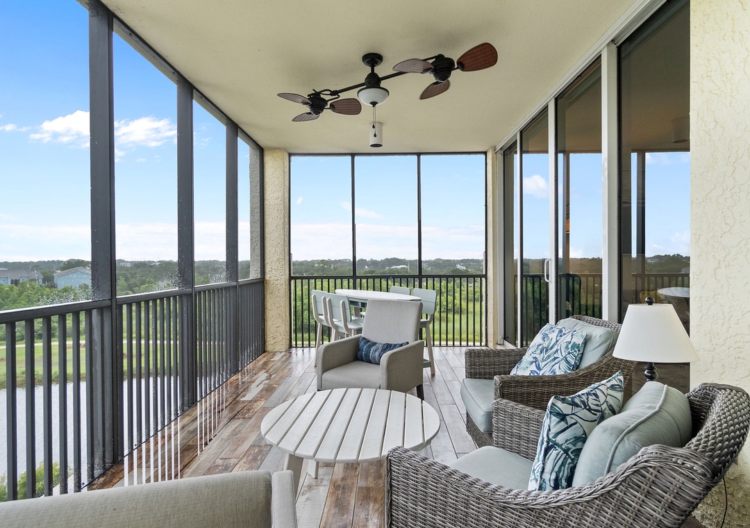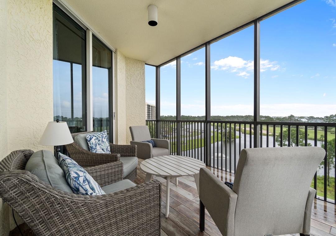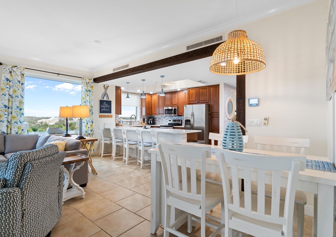This well-appointed 3-bedroom unit features a spacious open concept layout, updated electronics and beautiful décor throughout! Lounge with the family for movie night in the living area, complete with a huge curved sectional sofa with built in recliner, a large flat screen HDTV, and balcony access! The sliding glass doors open to your screened in terrace, where you can sit and enjoy the lush views of the Lost Key Golf Course. With plenty of seating you can even enjoy a delicious dinner alfresco. The gourmet kitchen offers everything needed to inspire your inner-chef. The dining area offers a high top table with additional seating at the breakfast bar.