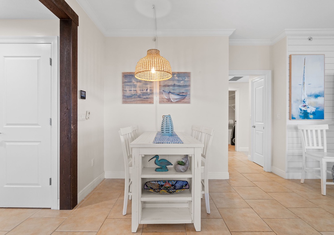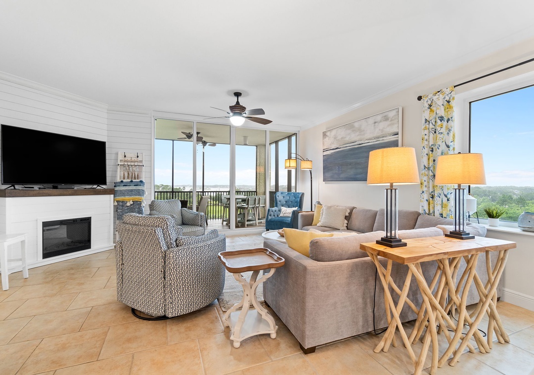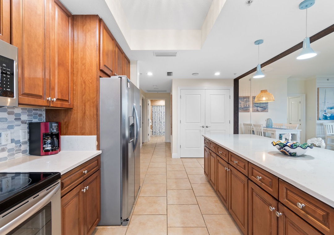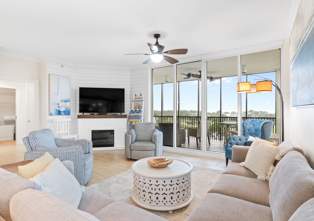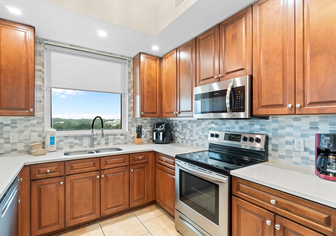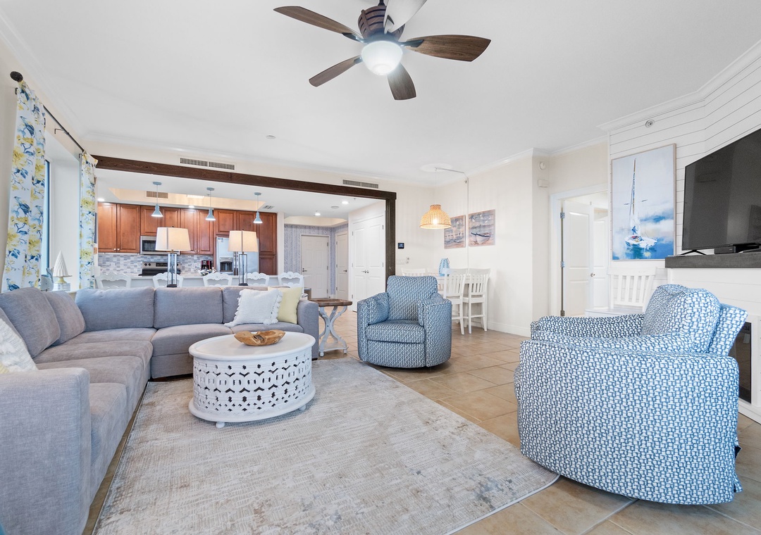 This well-appointed 3-bedroom unit features a spacious open concept layout, updated electronics and beautiful décor throughout! Lounge with the family for movie night in the living area, complete with a huge curved sectional sofa with built in recliner, a large flat screen HDTV, and balcony access! The sliding glass doors open to your screened in terrace, where you can sit and enjoy the lush views of the Lost Key Golf Course. With plenty of seating you can even enjoy a delicious dinner alfresco. The gourmet kitchen offers everything needed to inspire your inner-chef. The dining area offers a high top table with additional seating at the breakfast bar.