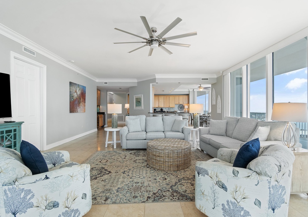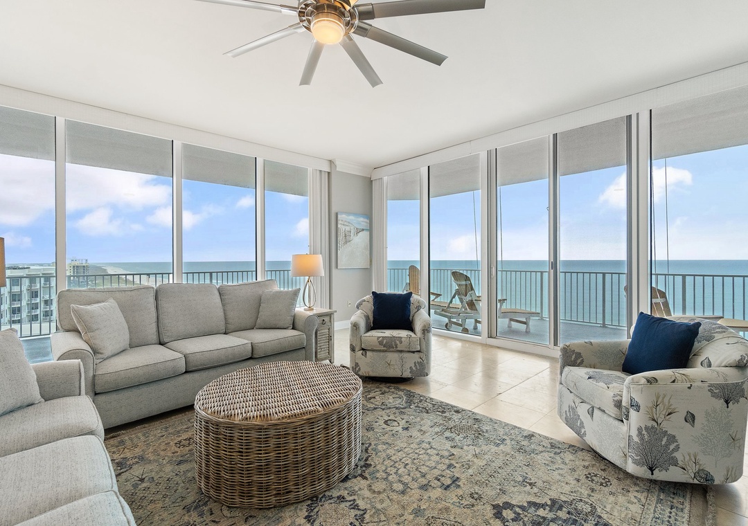 Floor-to-ceiling sliding glass doors open to the expansive covered terrace, and with comfortable furniture for the whole group to enjoy their favorite beverage and even savor a delicious meal while delighting in panoramic vistas of the sparkling Gulf Coast.