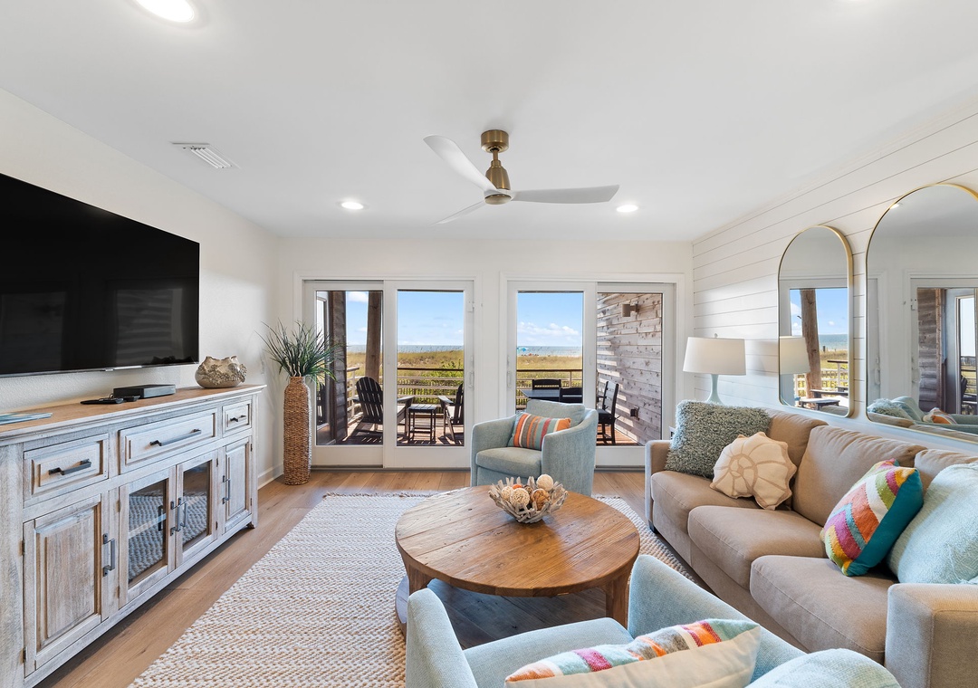 This charming and chic 2 bedroom retreat boasts a living area featuring plush sofa and cushioned chairs, large LCD TV, bright windows and access to a spacious waterfront patio with sensational views of the Gulf of Mexico! This floor plan affords plenty of outdoor seating, offering one of the best sunset views on the island. The kitchen is fully equipped with everything you'll need to create delicious meals, including upgraded appliances and counter tops, a smooth cook top, and all the small appliances and utensils necessary to ignite your inner-chef!