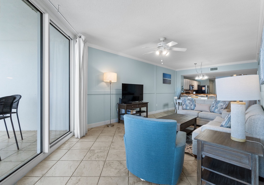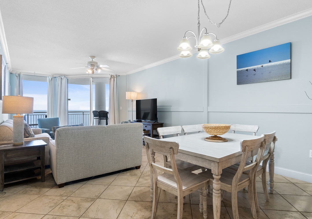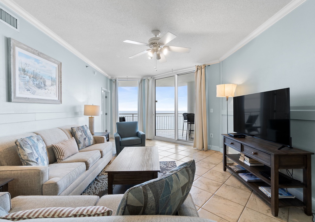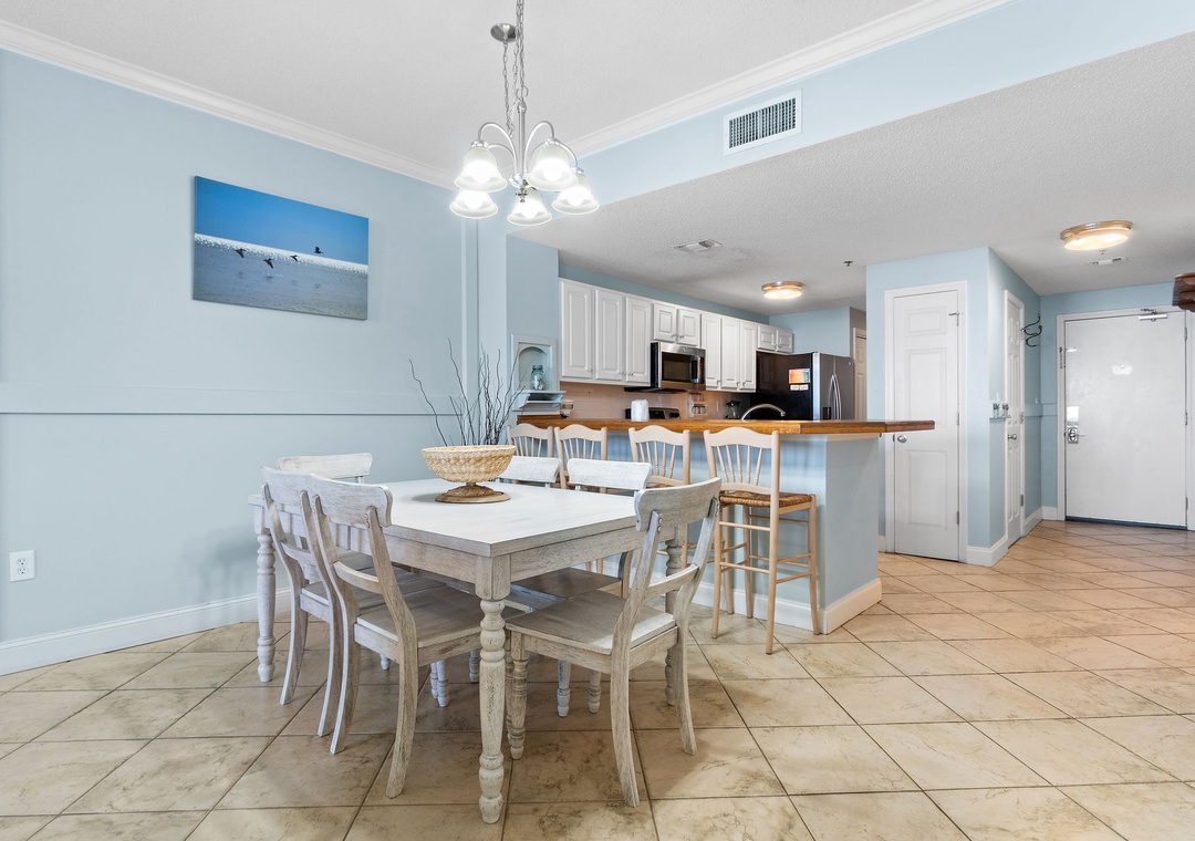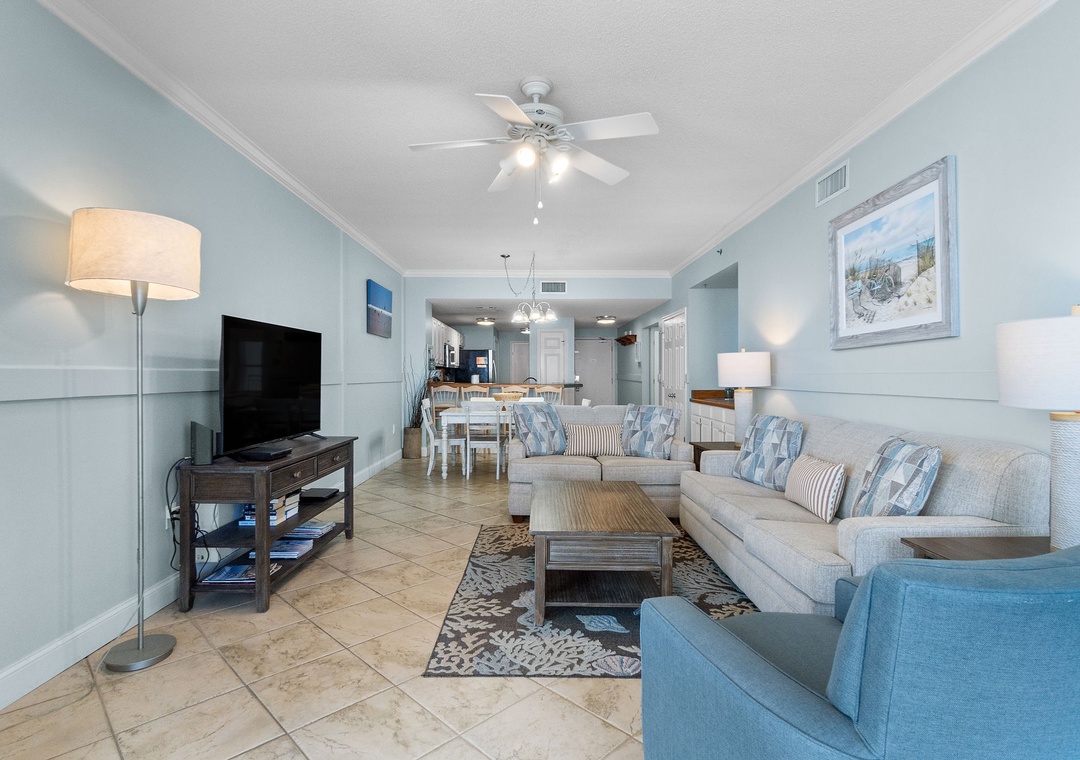 After a day of seaside fun, retreat to one of two beautifully appointed bedrooms, each designed for ultimate rest and relaxation. Sink into premium mattresses topped with high-thread-count linens, plush bedding, and enjoy your favorite shows on flat-screen TVs. The master suite and guest bedroom both offer luxurious king beds, while the queen sleeper sofa in the living room brings the total capacity to six guests in supreme comfort.