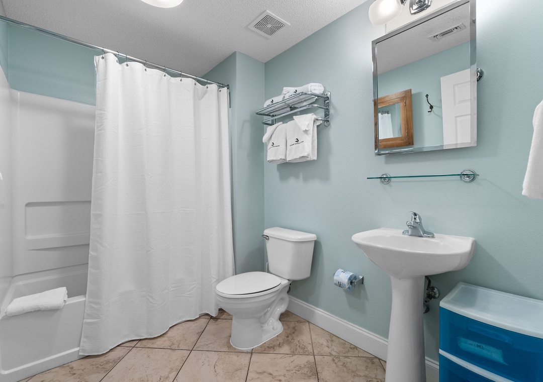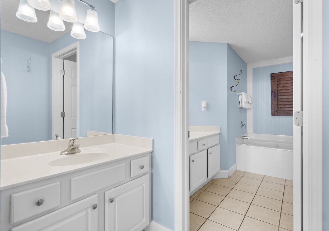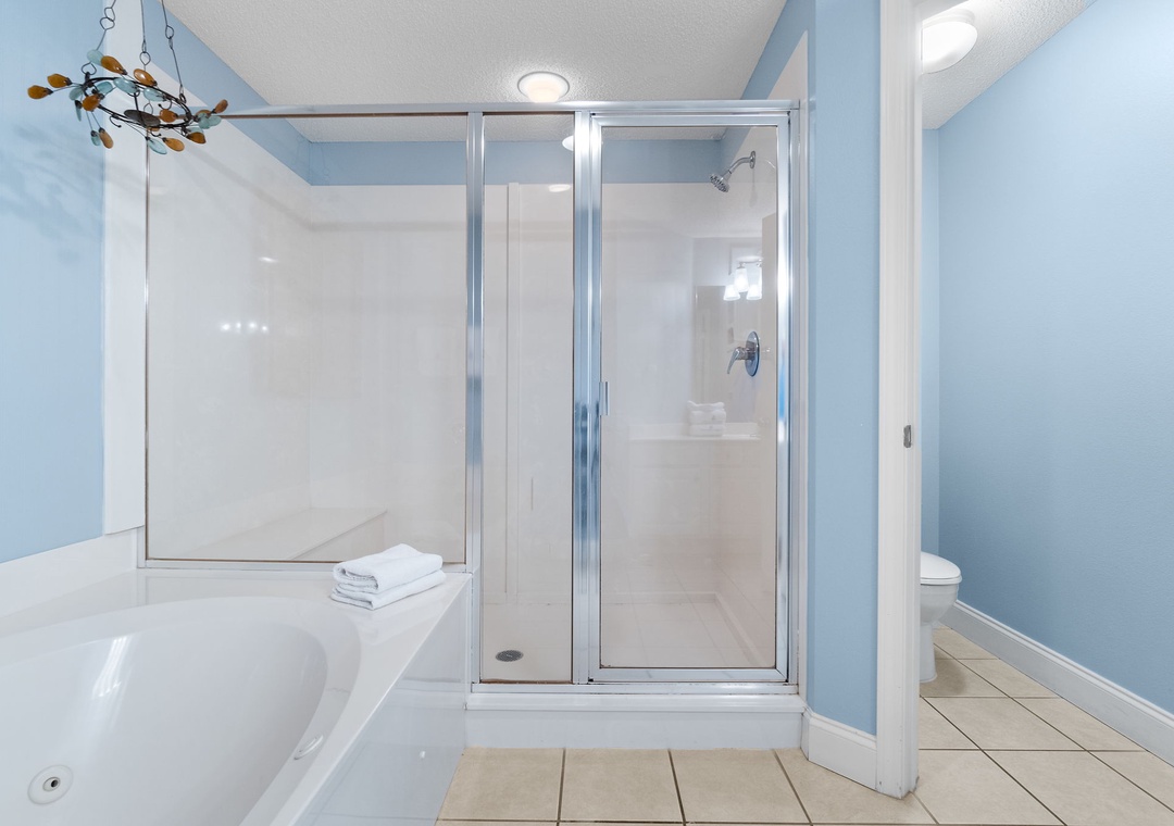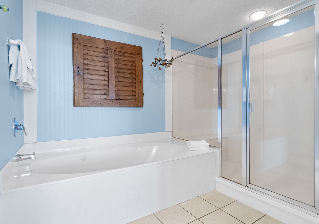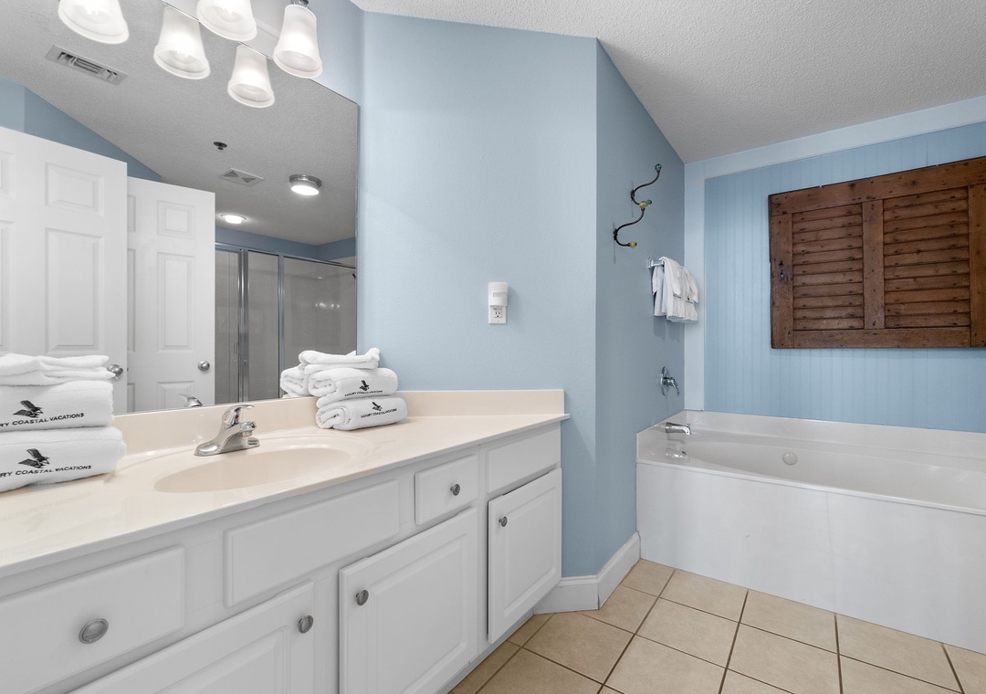 Treat yourself in the lavish master bathroom, featuring a spa-style two-person jetted tub, a spacious walk-in shower, abundant vanity space, and fluffy oversized 100% cotton bath towels—perfect for unwinding after a sun-soaked day on the beach.