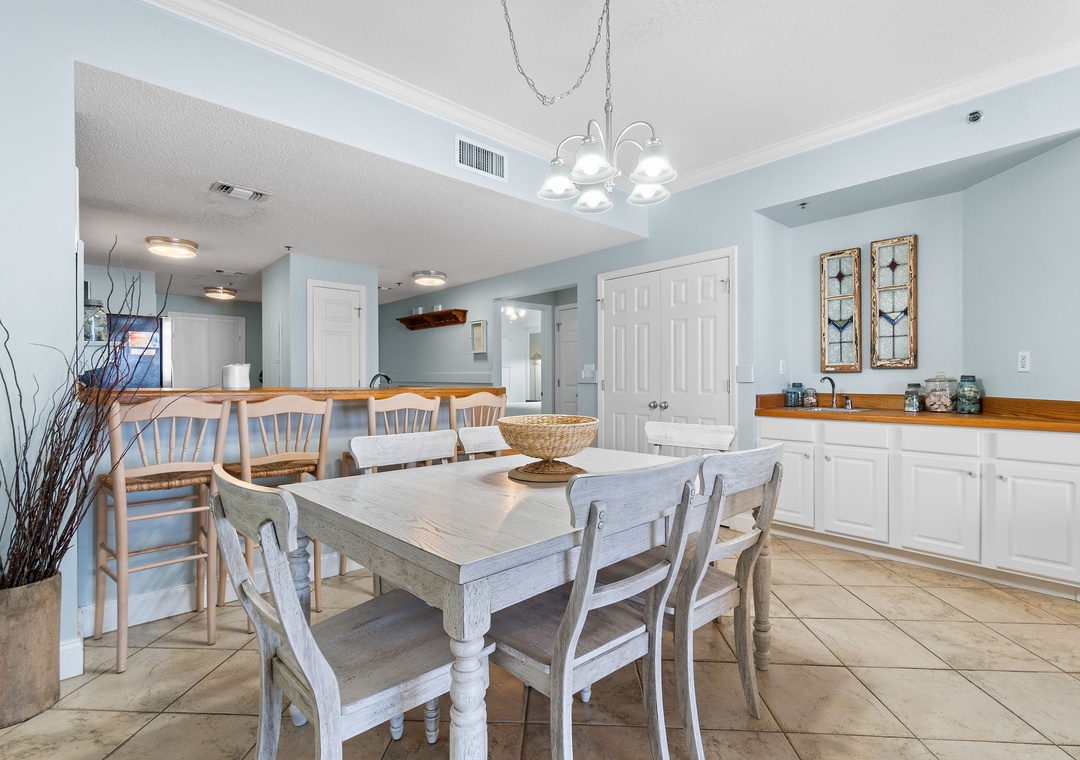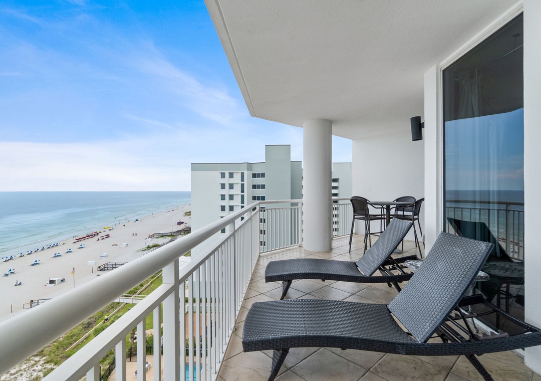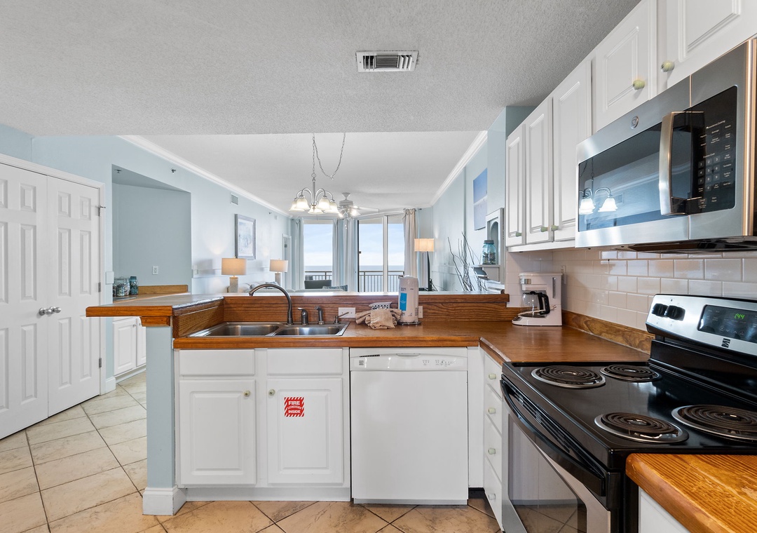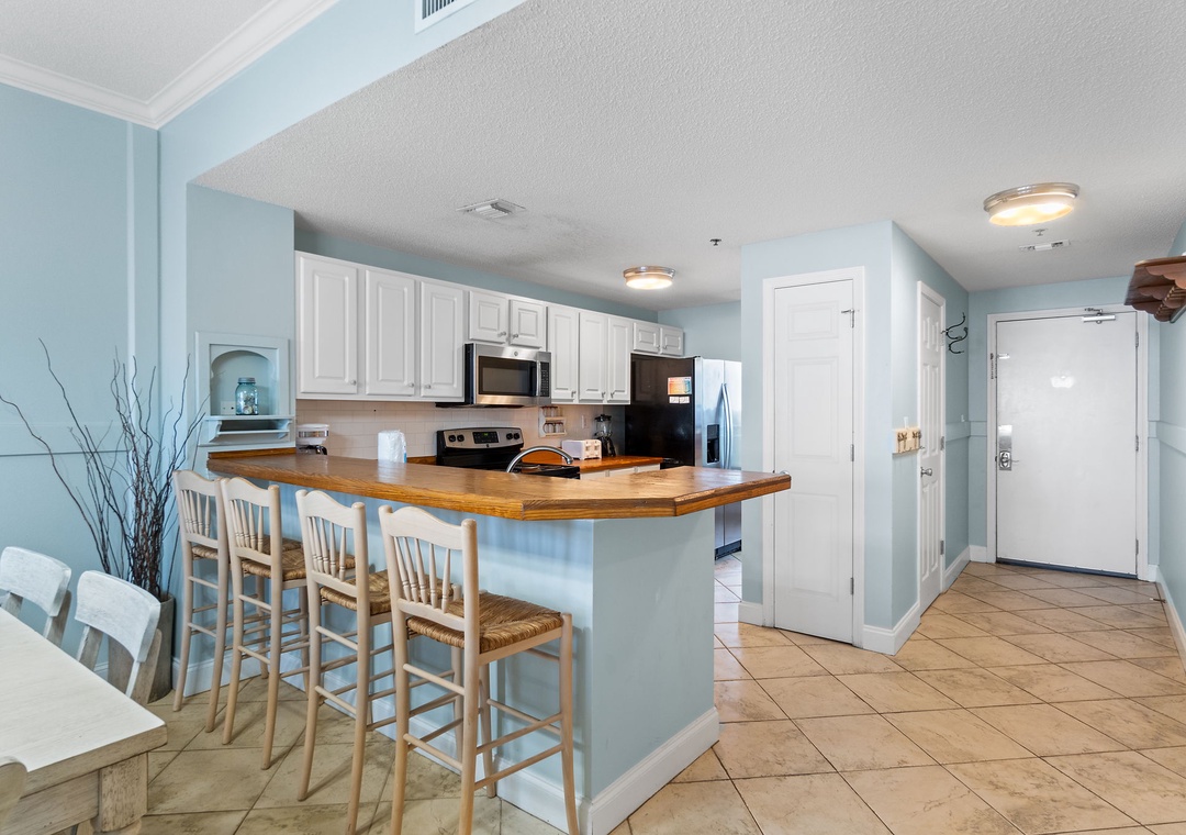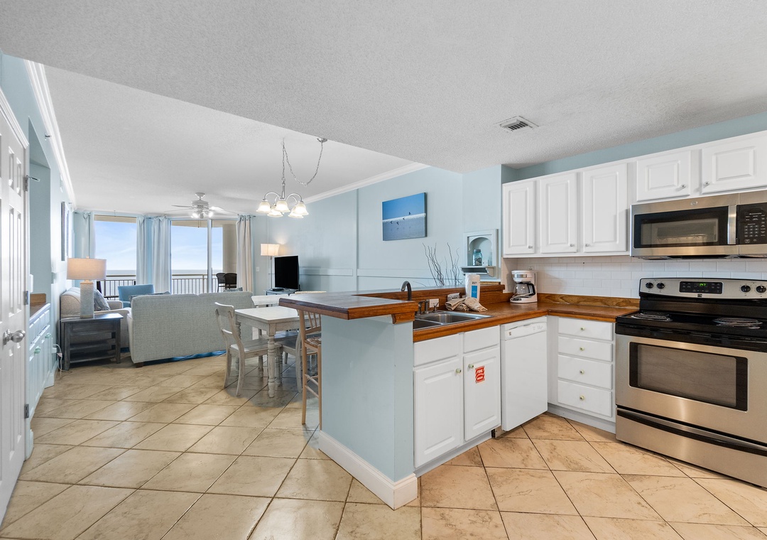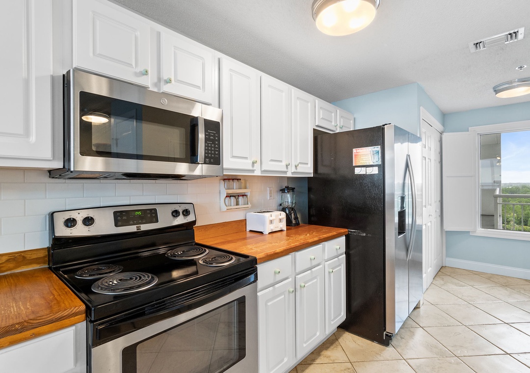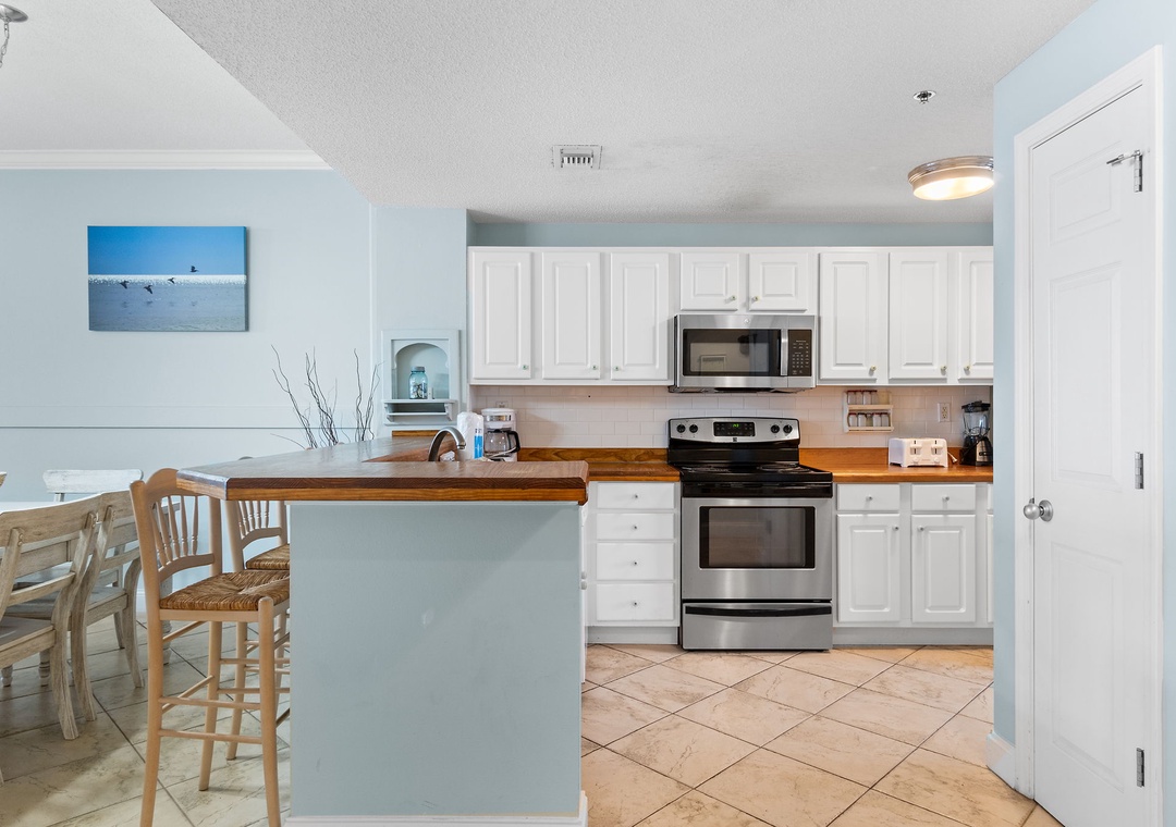 Start your mornings with a warm cup of coffee or unwind at sunset with a chilled cocktail on the expansive balcony, where panoramic Gulf views stretch as far as the eye can see. Inside, the gourmet kitchen is a chef’s dream—featuring sleek butcher block countertops, modern appliances, and a full stock of cookware, utensils, and small appliances. Whether you're crafting a quick breakfast or a full-course dinner, you'll have everything you need to impress family and friends with your culinary flair.