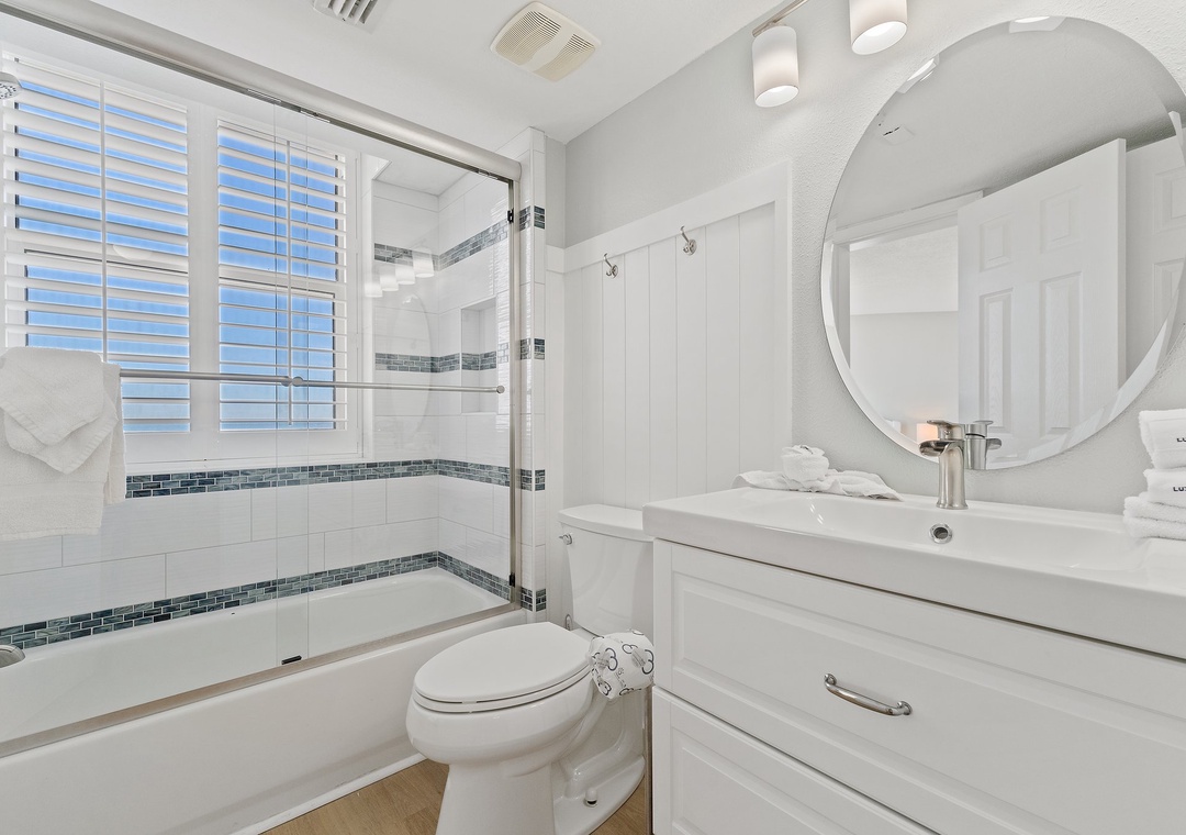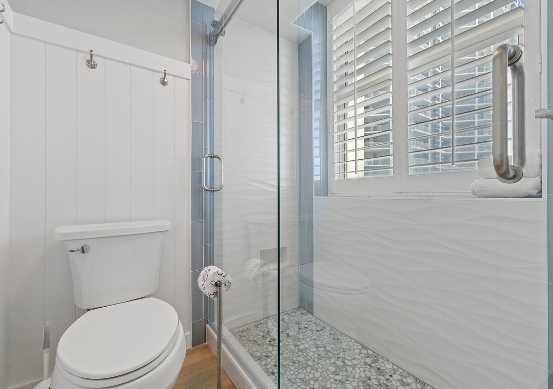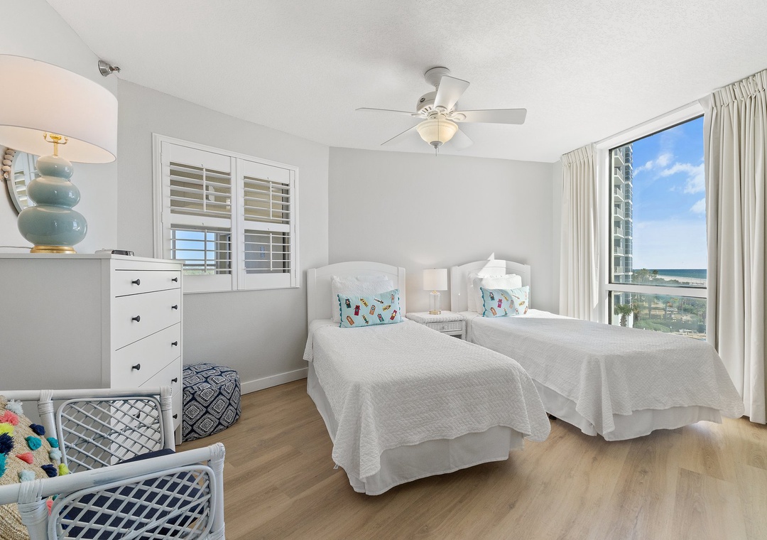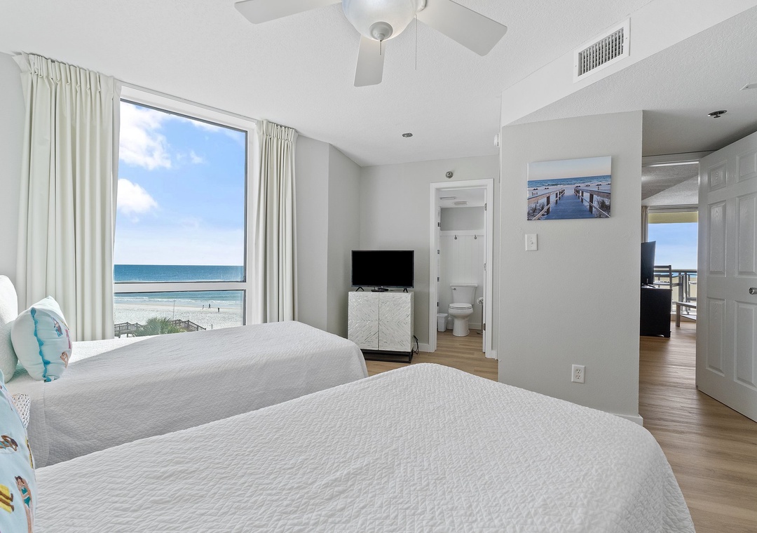 The master suite affords every detail to ensure complete relaxation, offering a comfortable king bed, flat screen TV, stylish modern furnishings, and large windows with Gulf views! The master bath includes a separate washroom with a door for privacy. The second bedroom is equally spacious, featuring a set of twin beds, a flat-screen TV, an attached bath, and an expansive window with an Eastward view.