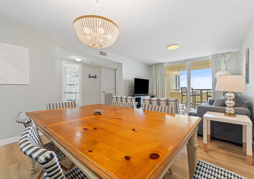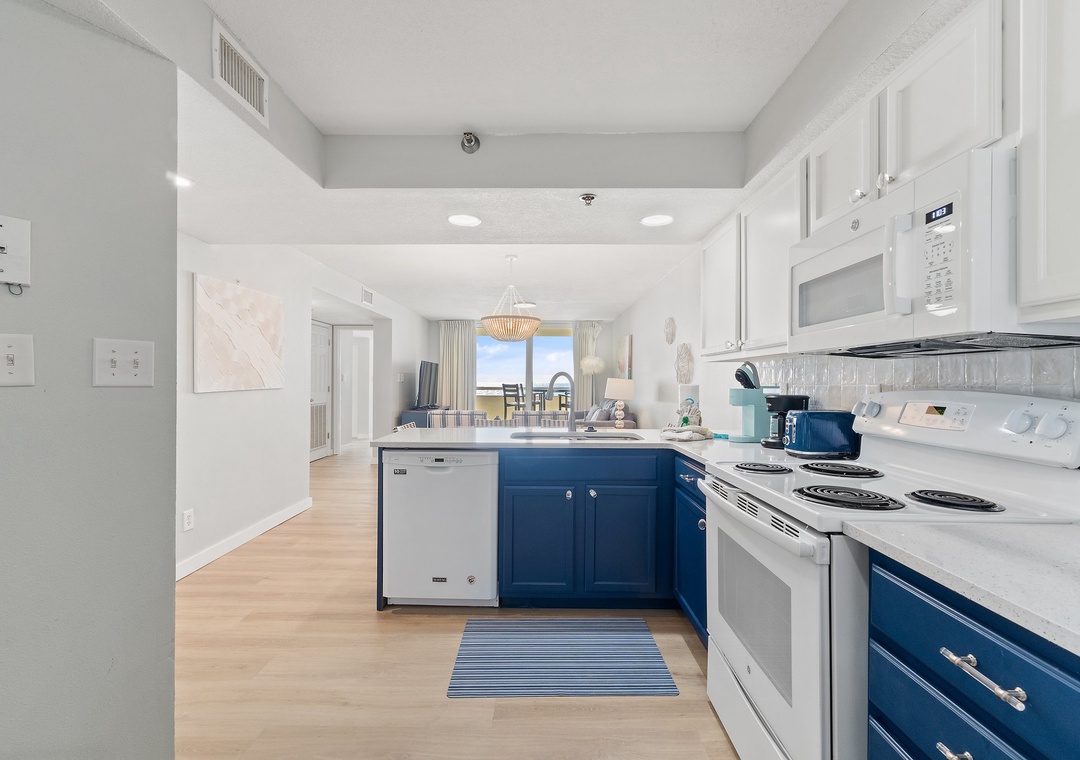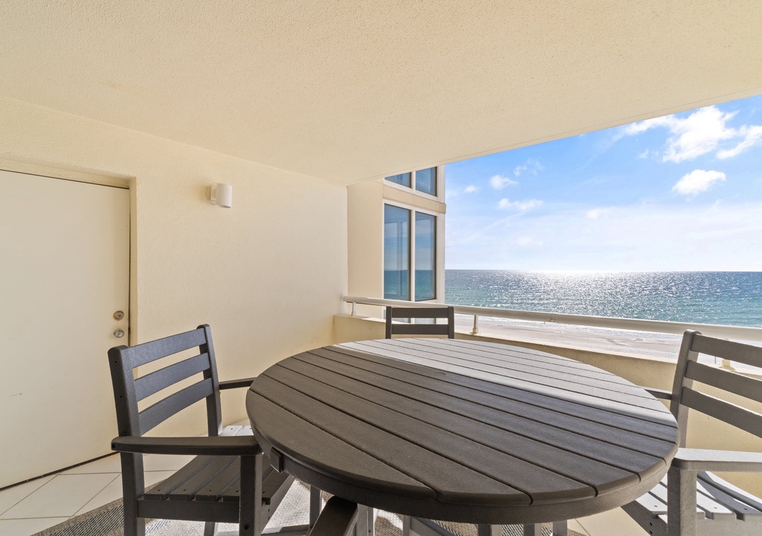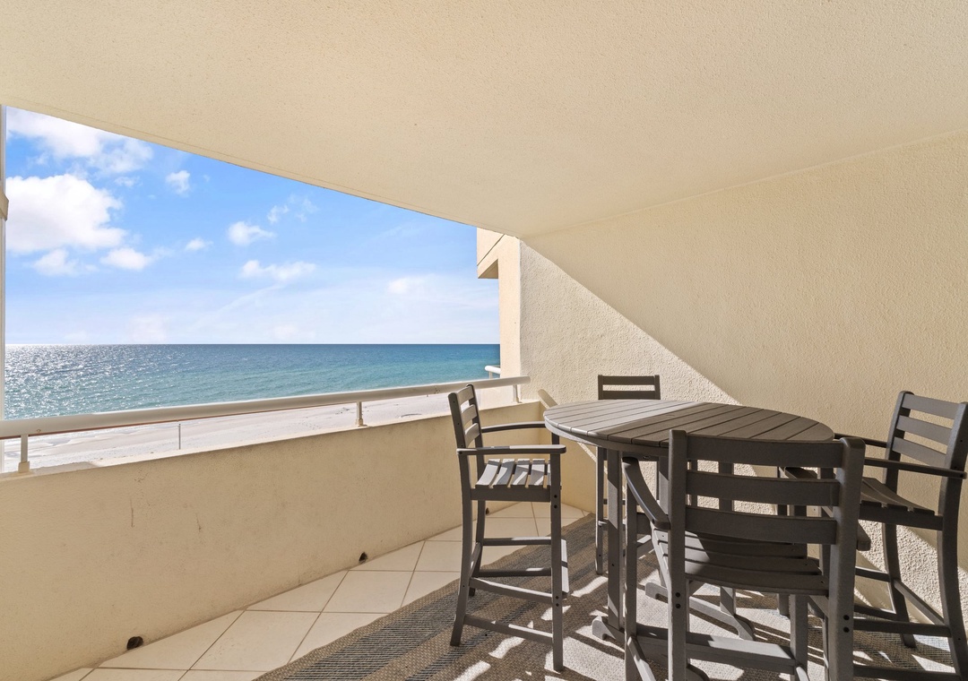 This spacious property offers an open-concept layout, custom floors and finishes, updated electronics, and much more! The living area boasts a sofa sleeper, leather chair, luxury plank floors, a large flat-screen TV, and beachfront balcony access with incredible views! Floor-to-ceiling sliding glass doors open to the Gulf-front covered terrace, where tranquil emerald-turquoise waters and snow-white sands give way to an endless horizon. An outdoor table with seating for 4 will allow you to sip your morning coffee or savor your favorite afternoon cocktail while basking in the delight of Gulf Coast living! The kitchen is well-stocked with everything you could need to prepare a wonderful dinner so make sure you check out our local seafood markets. The kitchen includes a stainless double-sided sink, full-sized appliances, and custom cabinetry. The dining area offers a wooden dining room table with seating for 6.