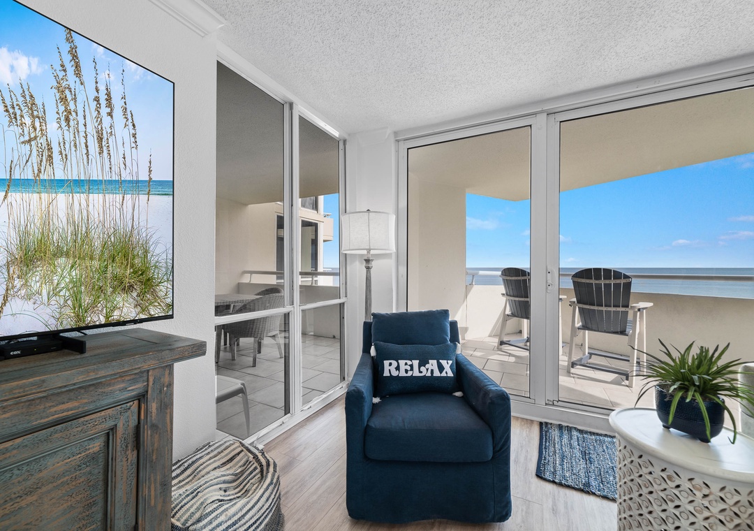 The living area features a comfortable and chic sectional sleeper, swivel armchairs, and a large, wall-mounted flat-screen TV. Glass sliding doors in both the living and dining areas lead to the expansive beach front balcony with chairs and outdoor dining table perfect for enjoying beverages and even dine al fresco while taking in the vistas of Perdido Keys shores.