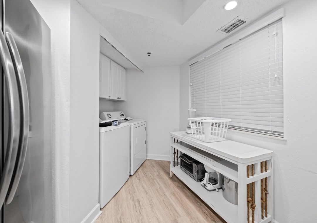 The open concept flows right into the dining area, which seats 10 people between the dining table and bar area, and on to the fully stocked gourmet kitchen. Stainless steel appliances including side by side refrigerator, double sink, granite countertops, a huge breakfast bar for entertaining, plenty of cabinet space, are provided to enable you to enjoy this home as if it were your own. There is a separate laundry area with full-size washer and dryer, overhead cabinets and shelving for groceries and other supplies. The living area also features a wet bar area with a separate small refrigerator.