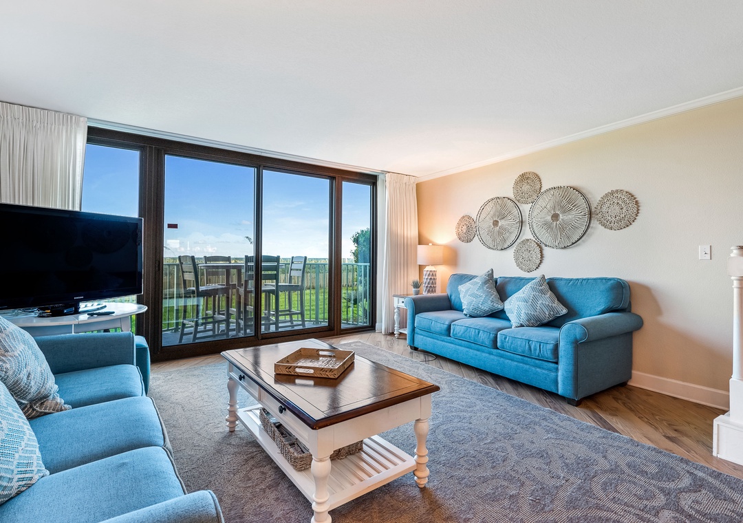 Indulge in a slice of paradise at this stunning 3-bedroom, 3.5-bath unit at Perdido Towers Resort in Perdido Key, Florida. Located along a pristine stretch of the Gulf Coast, this spacious ground-floor condo offers a 2-story layout with modern updates and conveniences. Relax in the living area, featuring cozy furnishings, a large flat-screen TV, and direct access to the beachfront patio. Step onto your private terrace and take in the breathtaking Gulf views while enjoying the peaceful sounds of the ocean, all from the comfort of your seaside retreat.