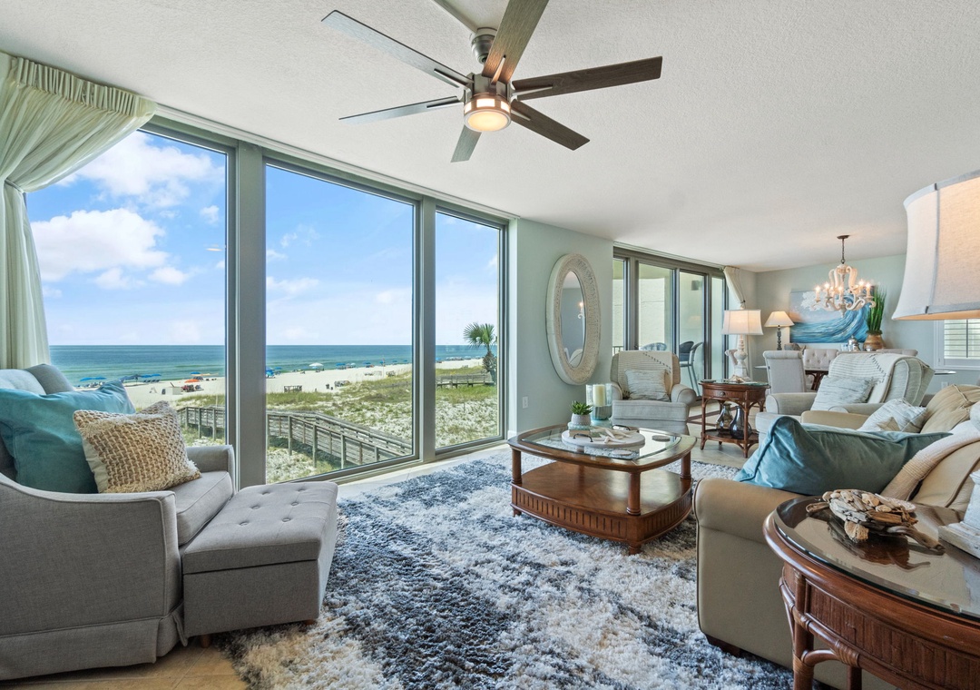 Welcome to Perdido Towers West 308, a stunning three-bedroom, three-bathroom condo located in picturesque Perdido Key, FL. This luxurious unit offers a perfect blend of comfort and elegance, featuring floor-to-ceiling windows throughout that provide breathtaking views and abundant natural light.