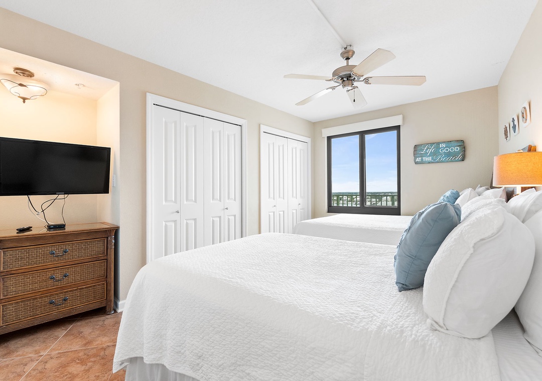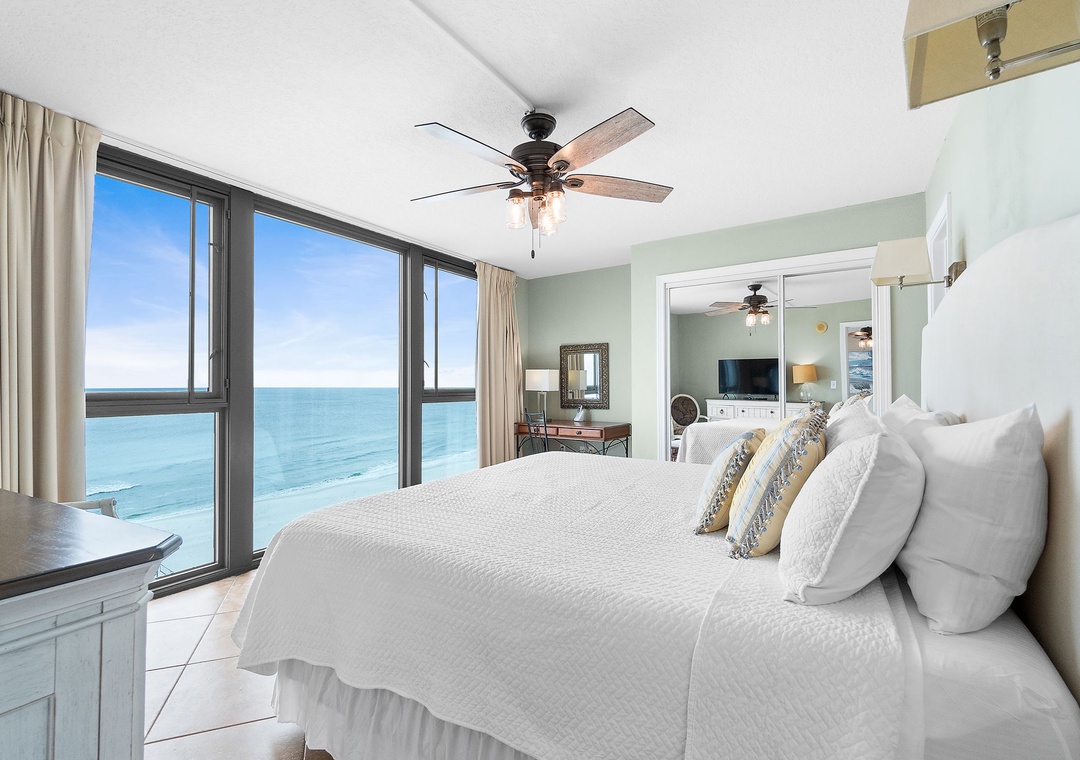 The master bedroom offers spectacular views, a king-size bed, luxury linens, and a private bath, along with a wooden desk and free Wi-Fi, making it a great work-from-home retreat. The second bedroom sleeps up to four with a queen and full bed, mounted TV, and ample closet space. With a full-size washer and dryer included, this condo provides everything you need for a comfortable and relaxing beach vacation. Book Perdido Towers West 906 today for a perfect getaway!