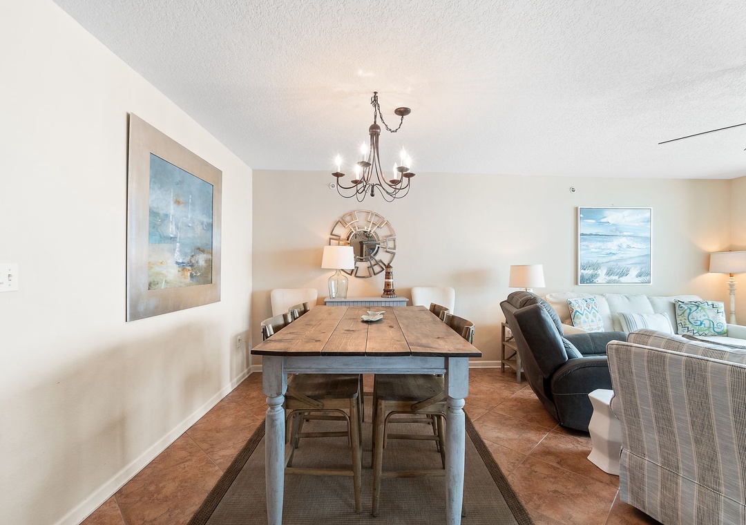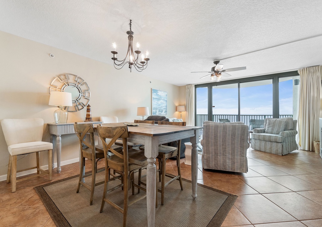 Experience the beauty of Florida's Gulf Coast in this stunning 2-bedroom, 2-bath condo on the 9th floor of Perdido Towers in Perdido Key. With only 33 units, this low-density resort offers a peaceful escape from crowded beaches and pools. The condo boasts floor-to-ceiling windows with breathtaking views of the sugar-white sands and emerald waters. Enjoy the open living area with comfortable seating, a flat-screen TV, and a dining space for six. The fully equipped kitchen features a bar with seating for two, perfect for casual meals.