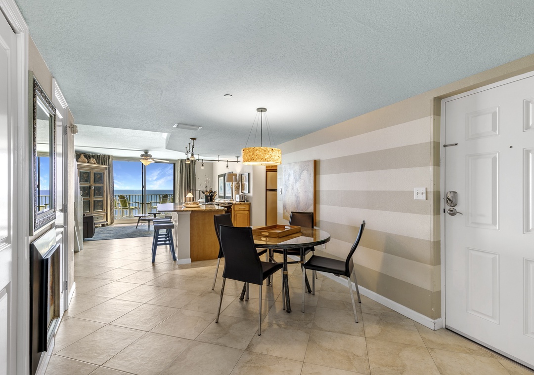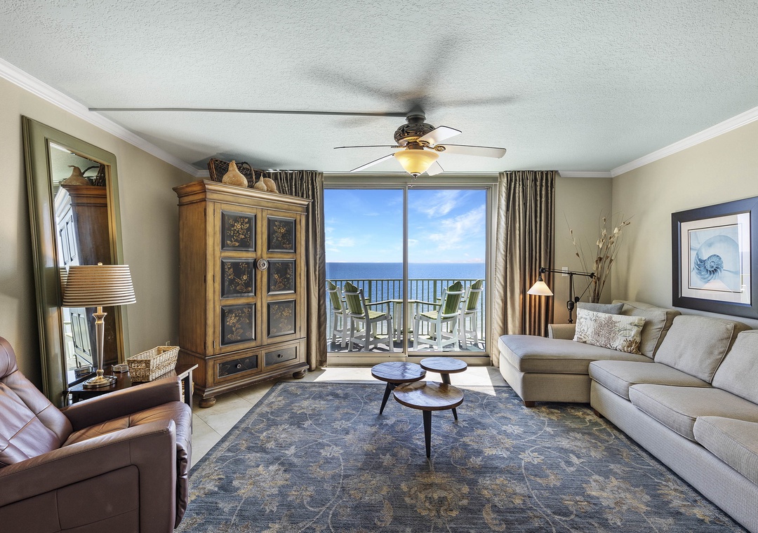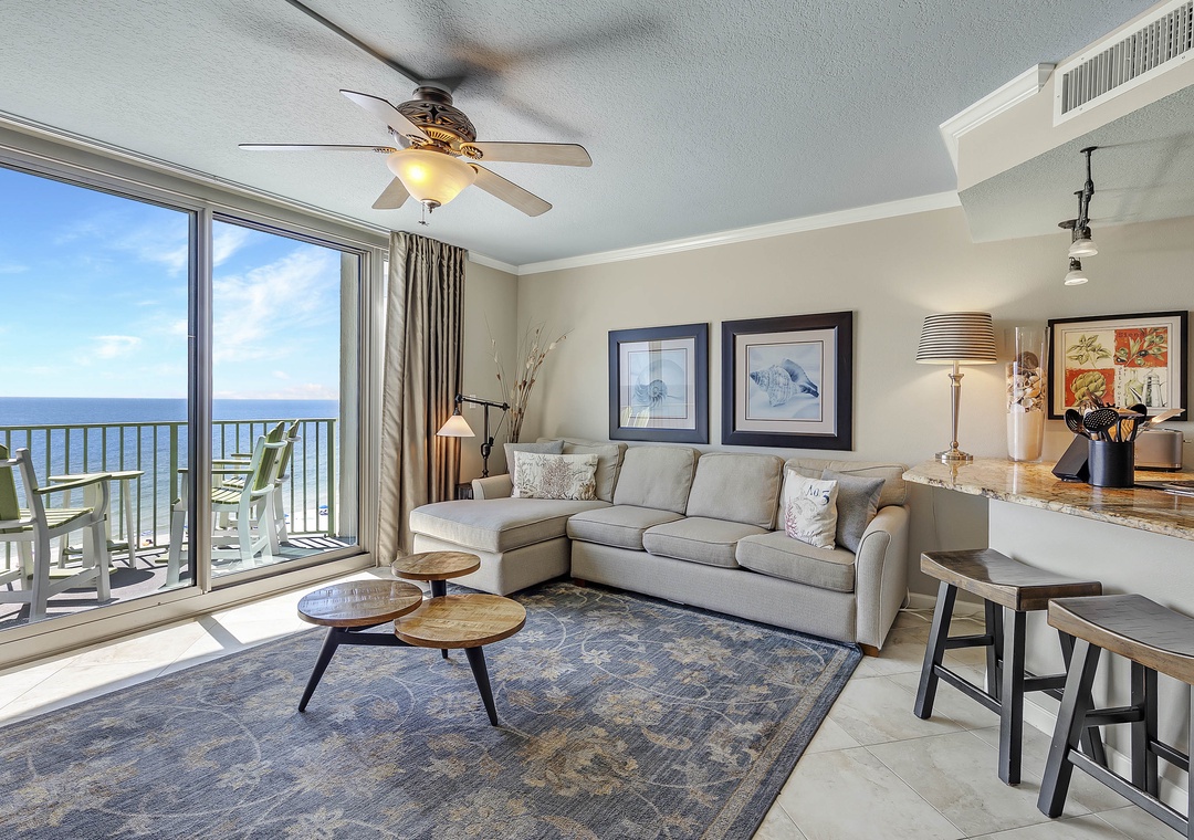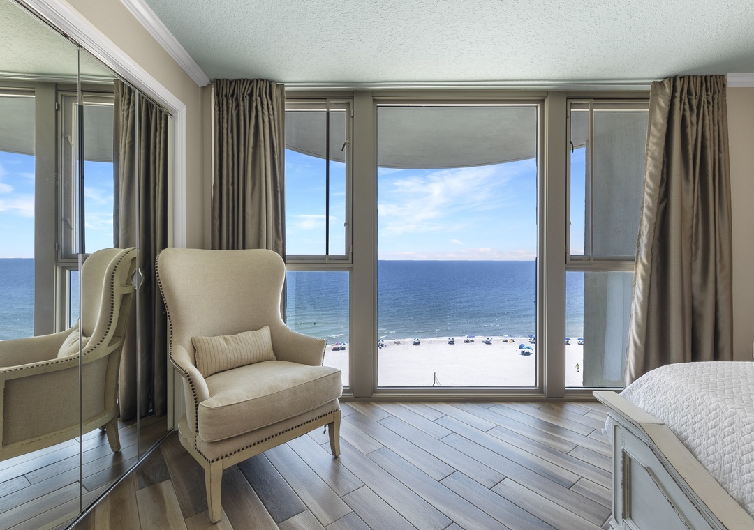 Experience the perfect beach escape in this stunning 3-bedroom, 2.5-bathroom condo on the 9th floor, where you'll be greeted with panoramic views of the Gulf of Mexico's emerald waters and sugar-white sands. Whether you're relaxing in the living room or waking up in the master bedroom, floor-to-ceiling windows and sliding doors let the breathtaking scenery in. The spacious beachfront balcony offers ample seating for enjoying your morning coffee or unwinding with a glass of wine, and if you're lucky, you might catch a spectacular Blue Angels flyover!