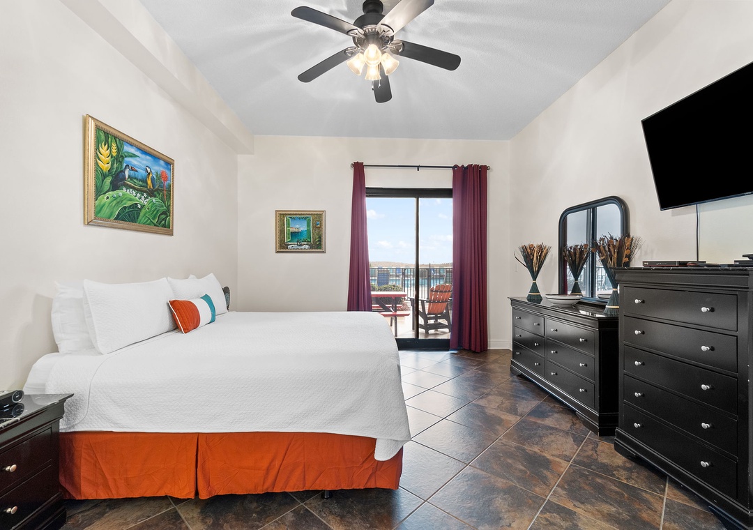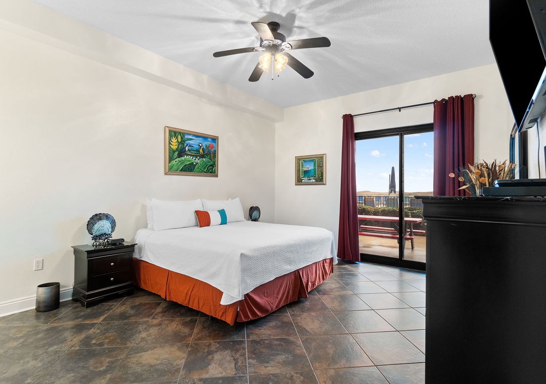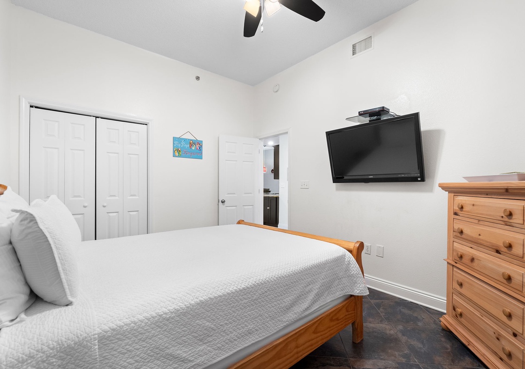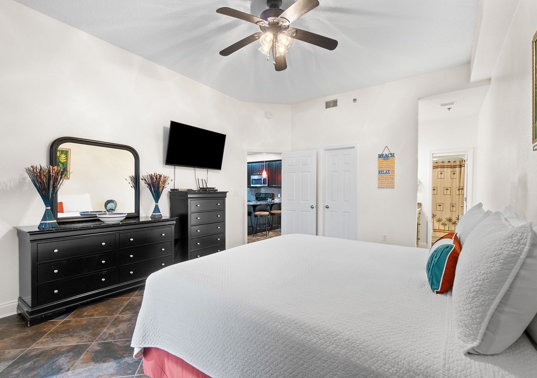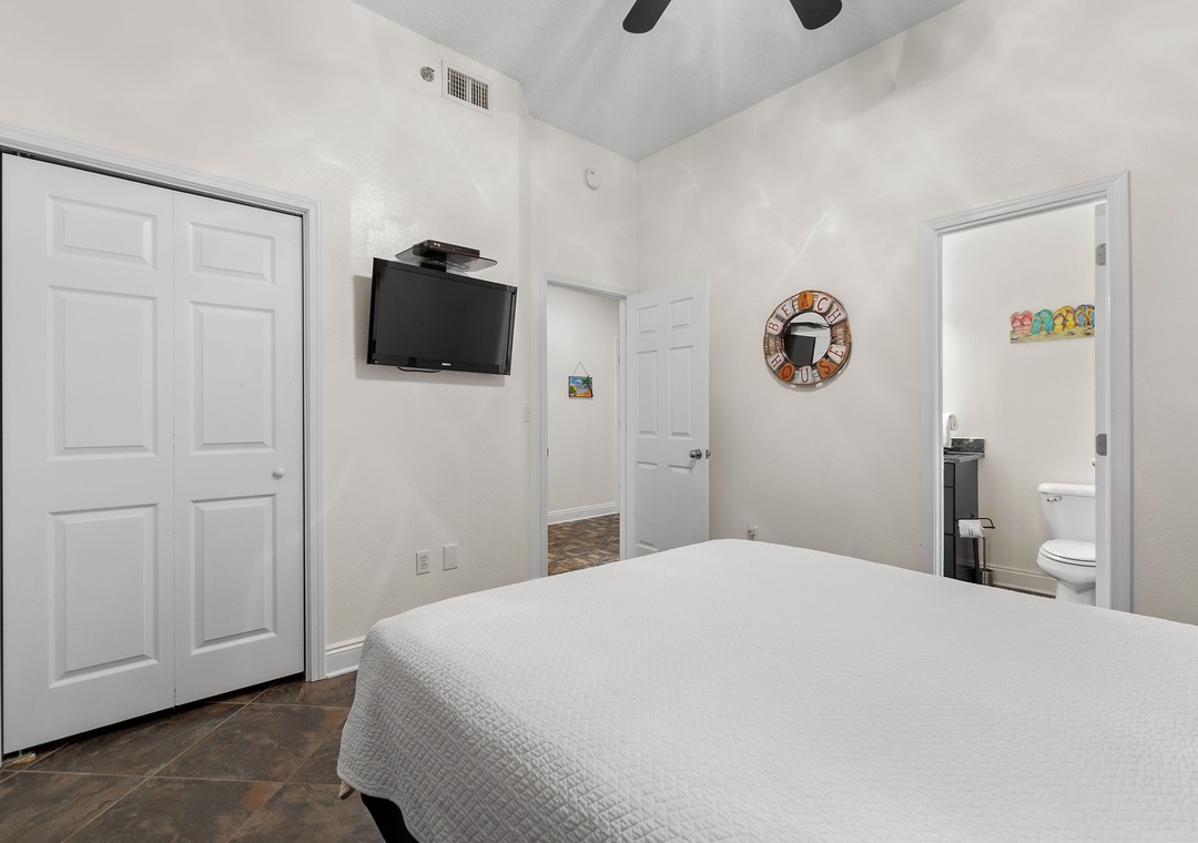 The primary bedroom offers a spacious king-size bed, a mounted HDTV, and access to a private balcony. The luxurious primary bathroom features a tile shower and jetted tub. A serene second bedroom includes a cozy queen bed, a mounted HDTV, and an ocean view. A spacious third bedroom overlooking the beach has one full bed and an HDTV. A hall bathroom features roomy countertops and a walk-in shower perfect for accommodating all guests. All bedrooms contain closets for luggage and other items.