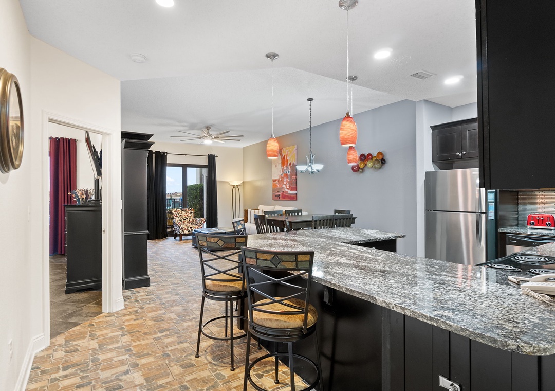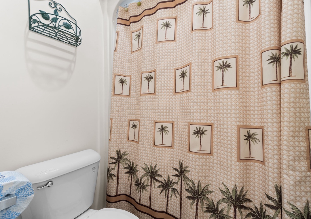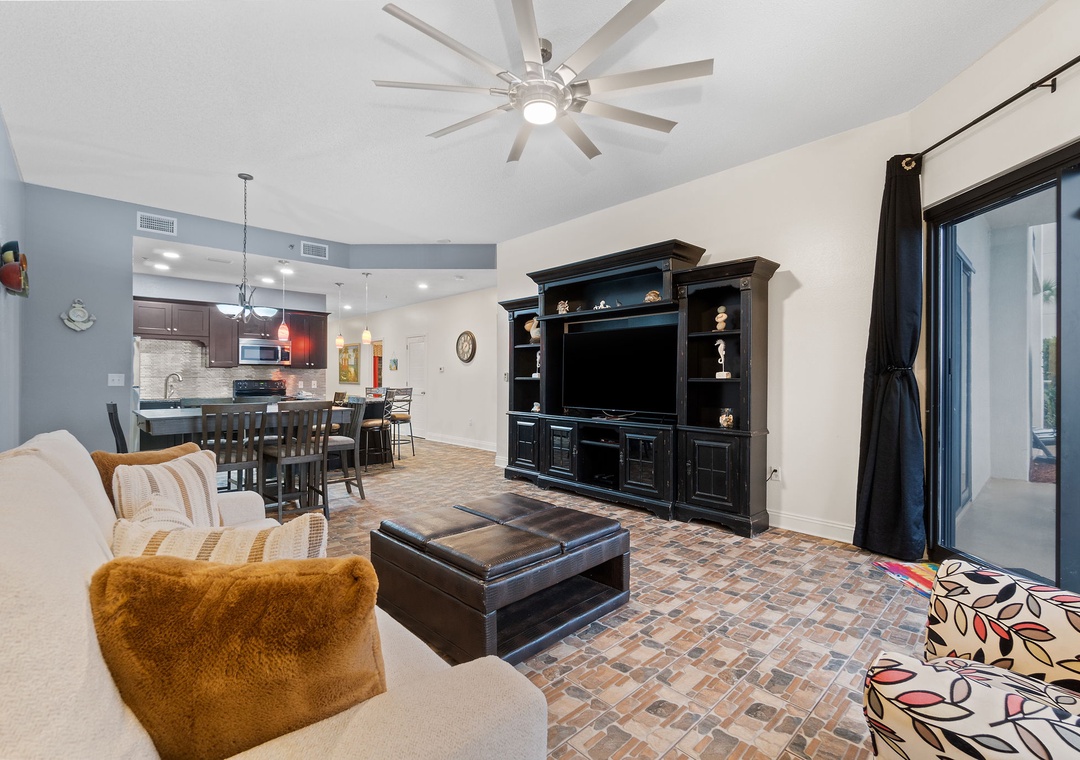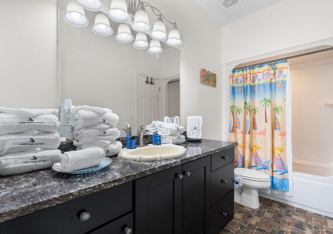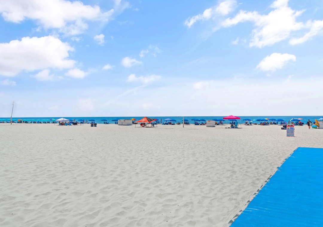 The primary bedroom offers a spacious king-size bed, a mounted HDTV, and access to a private balcony. The luxurious primary bathroom features a tile shower and jetted tub. A serene second bedroom includes a cozy queen bed, a mounted HDTV, and an ocean view. A spacious third bedroom overlooking the beach has one full bed and an HDTV. A hall bathroom features roomy countertops and a walk-in shower perfect for accommodating all guests. All bedrooms contain closets for luggage and other items.