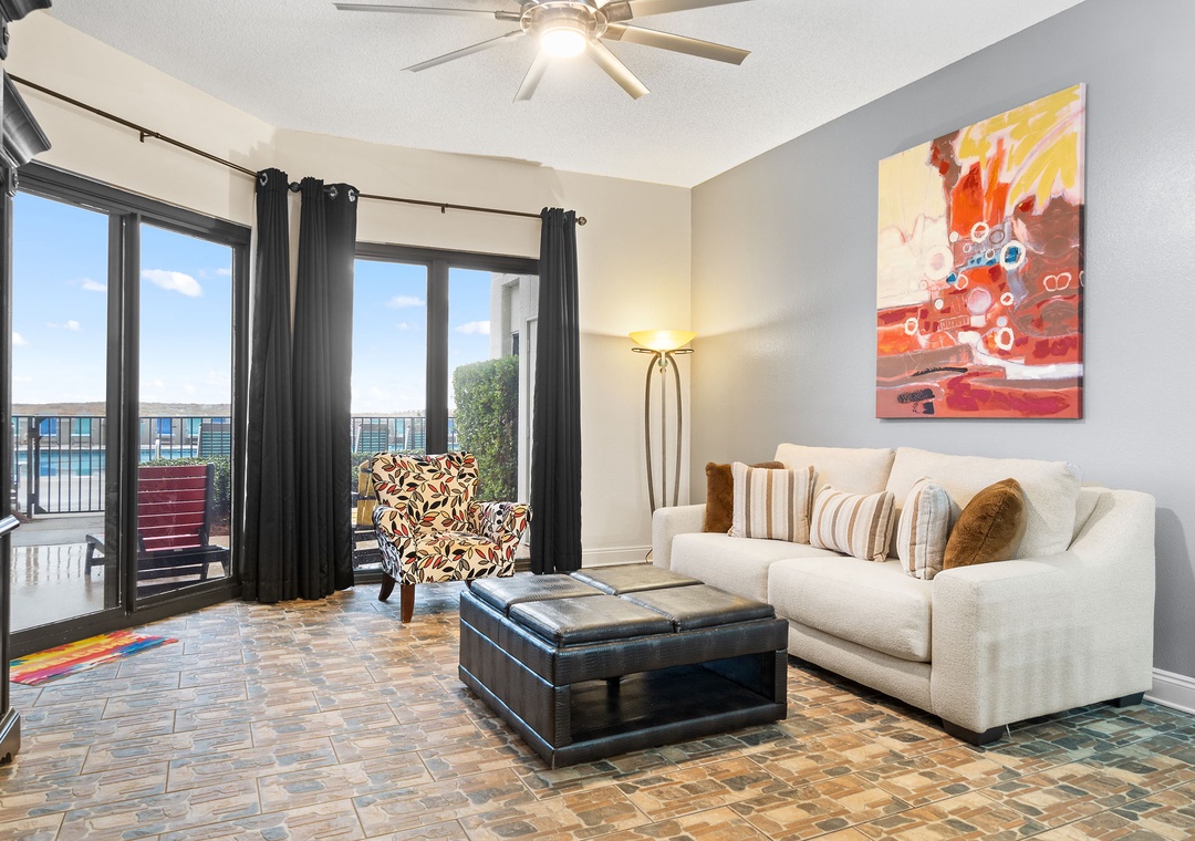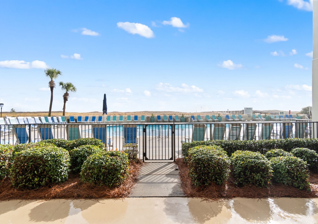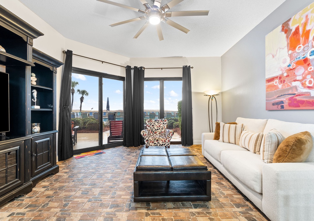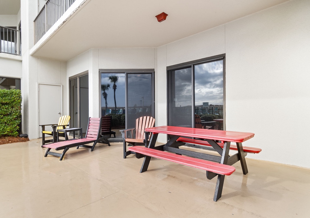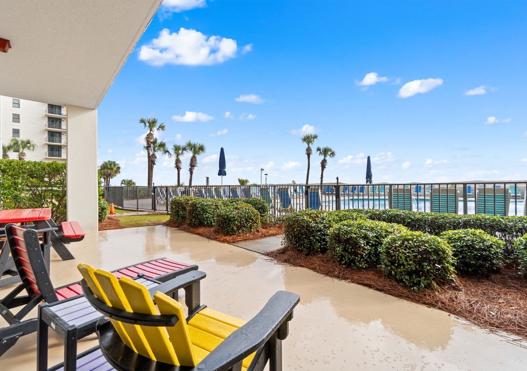 Phoenix 6 011 is a ground level beachfront condo that boasts a spectacular ocean view and convenient beach access! The main living space offers a large and cozy living area with updated furniture and plenty of comfortable seating for the whole family. A work bar in the living area provides the perfect place for computers or puzzles while enjoying the scenery. The kitchen is fully stocked with all of the pots, pans, and kitchenware needed to make yourself at home during your Orange Beach vacation. Floor to ceiling windows wrap around the indoor dining table for dinner with a view. The balcony features a dining table and two rocking chairs perfect for relaxing and enjoying the beach below.