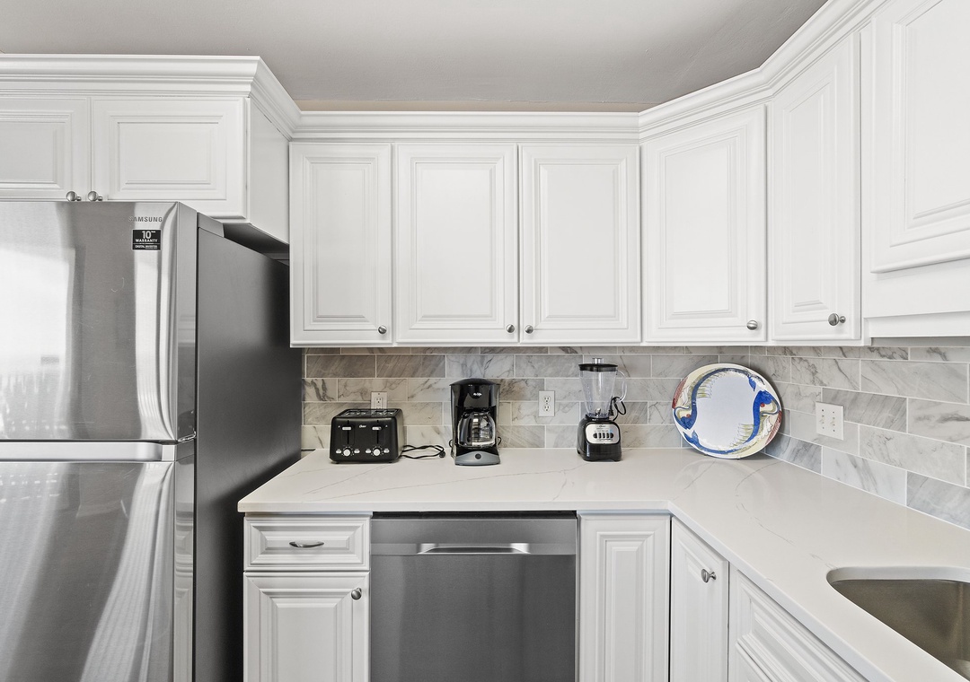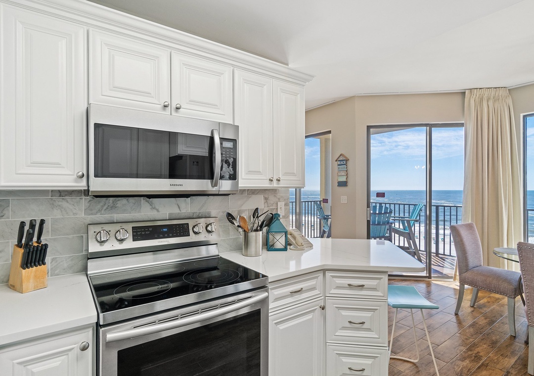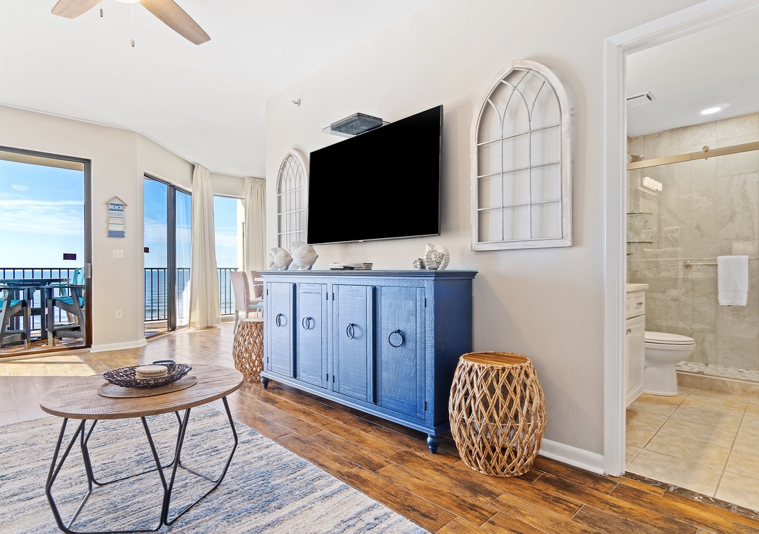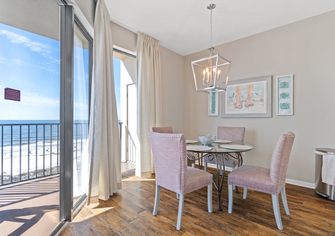 The fully equipped kitchen is designed for both style and function, featuring all-new appliances, a breakfast bar, and everything you need to prepare delicious meals. The dining area seats four, with additional seating for two at the breakfast bar, providing plenty of room for family meals or entertaining. Whether you’re sipping your morning coffee or enjoying a sunset dinner on the balcony, this luxury unit offers an ideal setting for a memorable beach getaway.