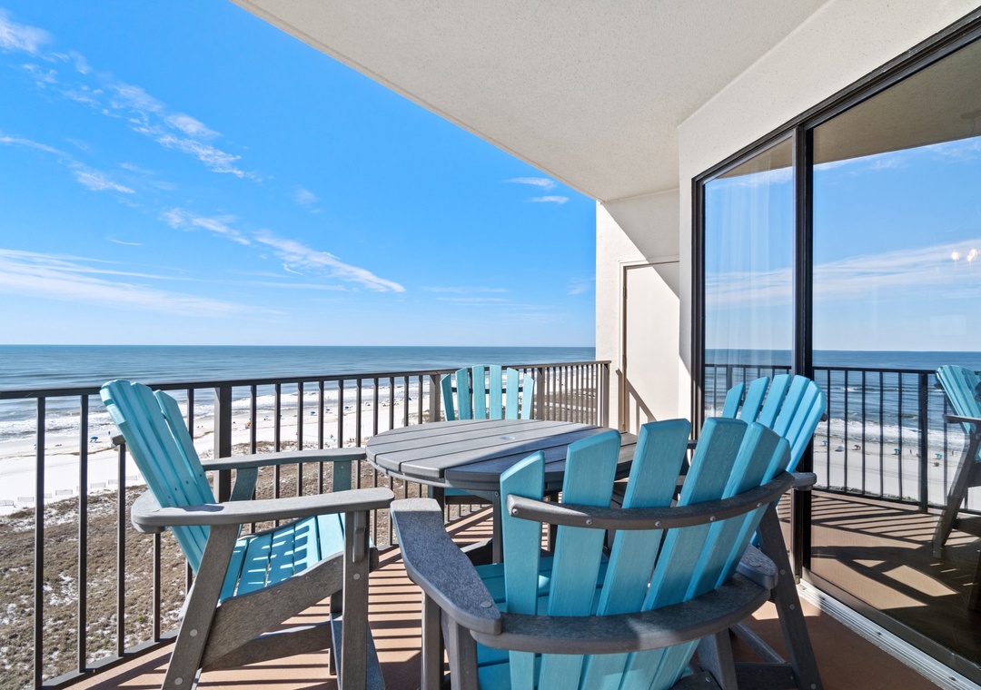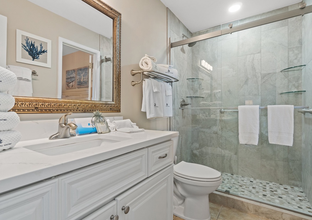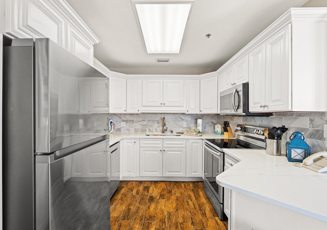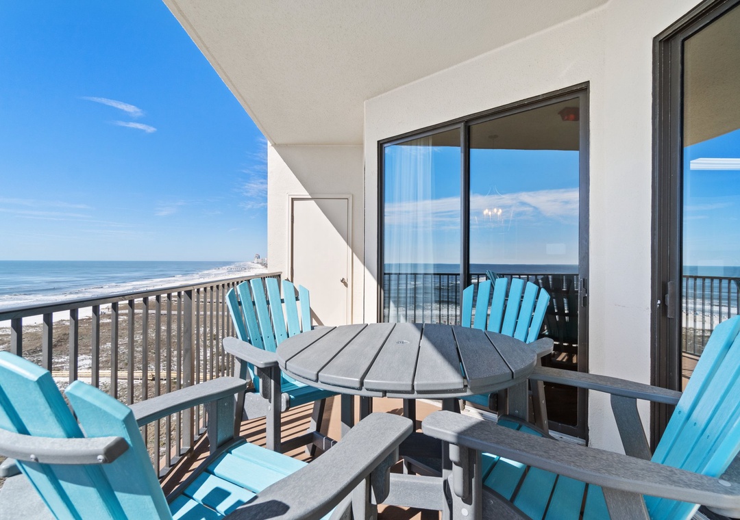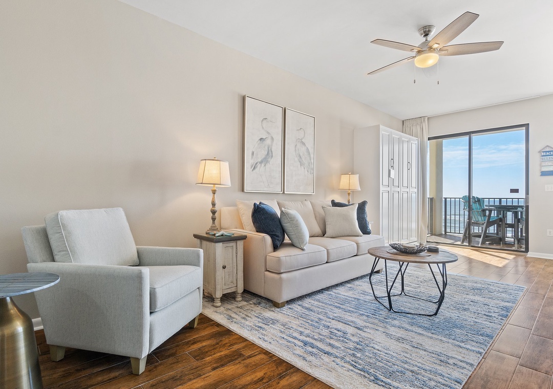 The fully equipped kitchen is designed for both style and function, featuring all-new appliances, a breakfast bar, and everything you need to prepare delicious meals. The dining area seats four, with additional seating for two at the breakfast bar, providing plenty of room for family meals or entertaining. Whether you’re sipping your morning coffee or enjoying a sunset dinner on the balcony, this luxury unit offers an ideal setting for a memorable beach getaway.