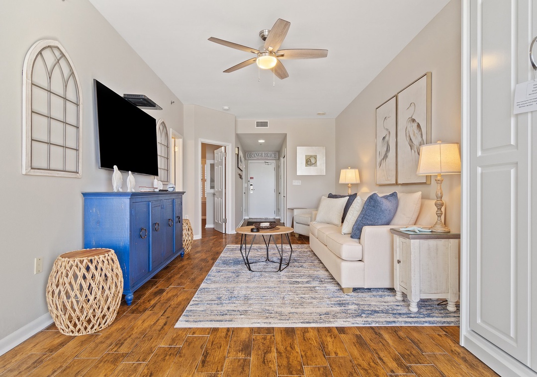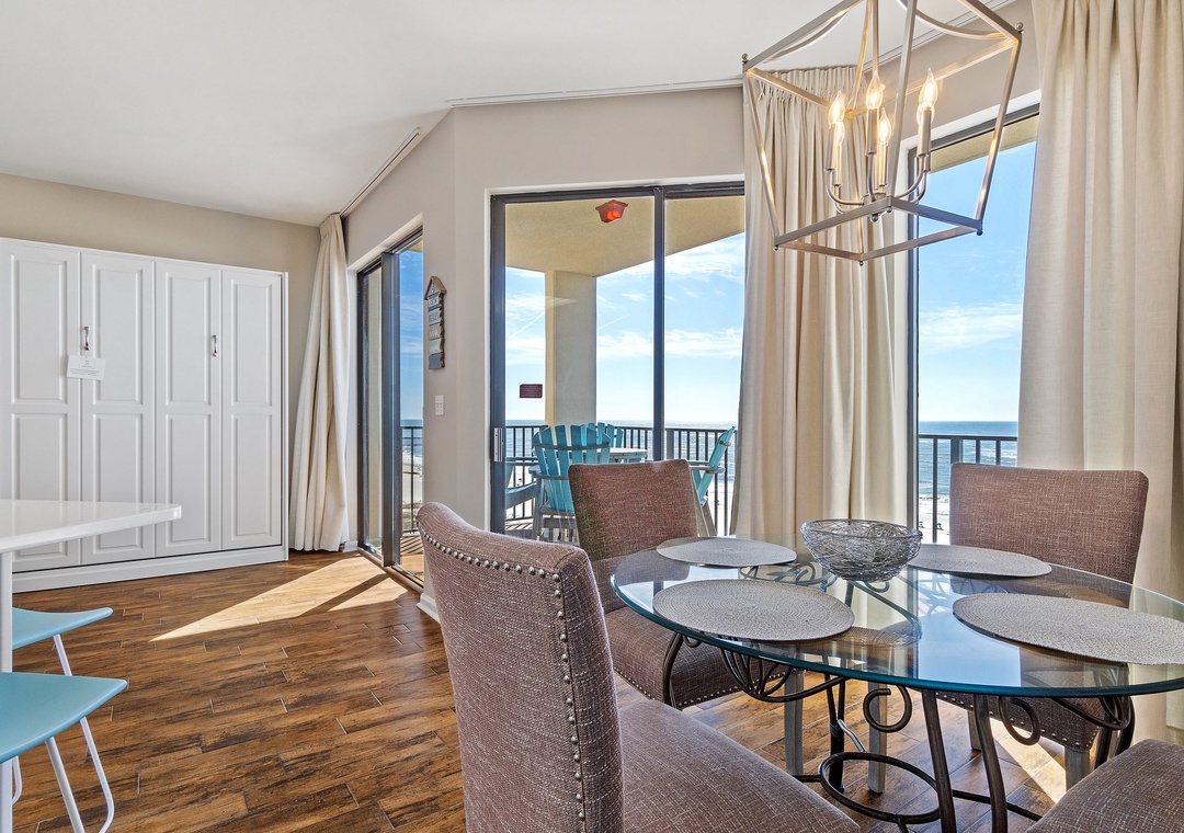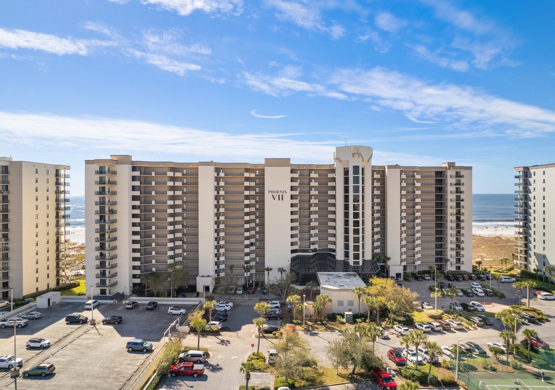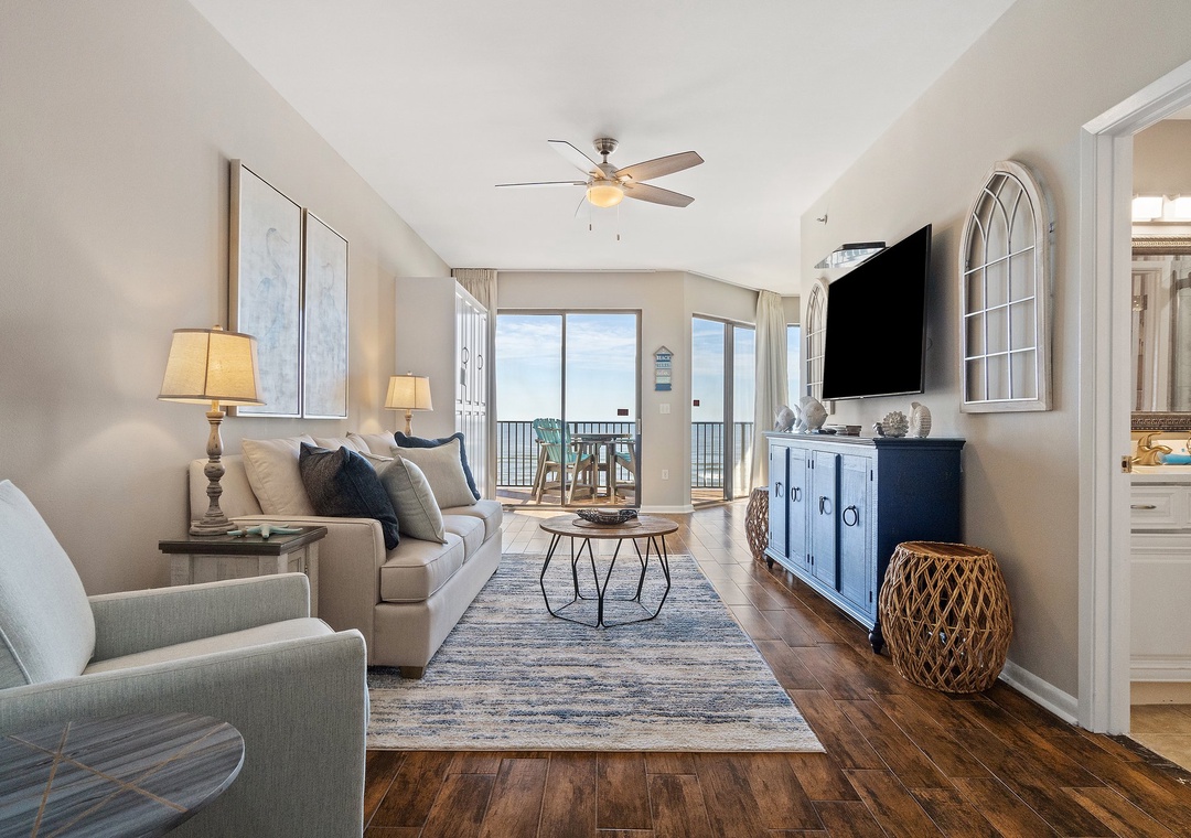 Experience an unforgettable vacation in this beautifully renovated 1-bedroom, 1-bath condo at Phoenix VII. Recent upgrades include new flooring, fresh paint, stylish artwork, and brand-new furnishings, along with a stunning custom walk-in shower and top-of-the-line kitchen appliances. Nestled along a pristine stretch of the Gulf Coast, this luxury complex offers the perfect backdrop for relaxation, with miles of sugar-white sands and emerald waters just steps away. The open floor plan is both elegant and comfortable, featuring plush seating, a large LCD TV, and sleeping accommodations for up to six with a sleeper sofa and queen Murphy bed. Step through the floor-to-ceiling sliding glass doors to the spacious, covered 11th-floor balcony and take in the breathtaking panoramic views of the Gulf.