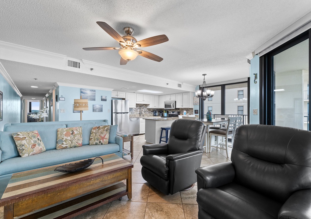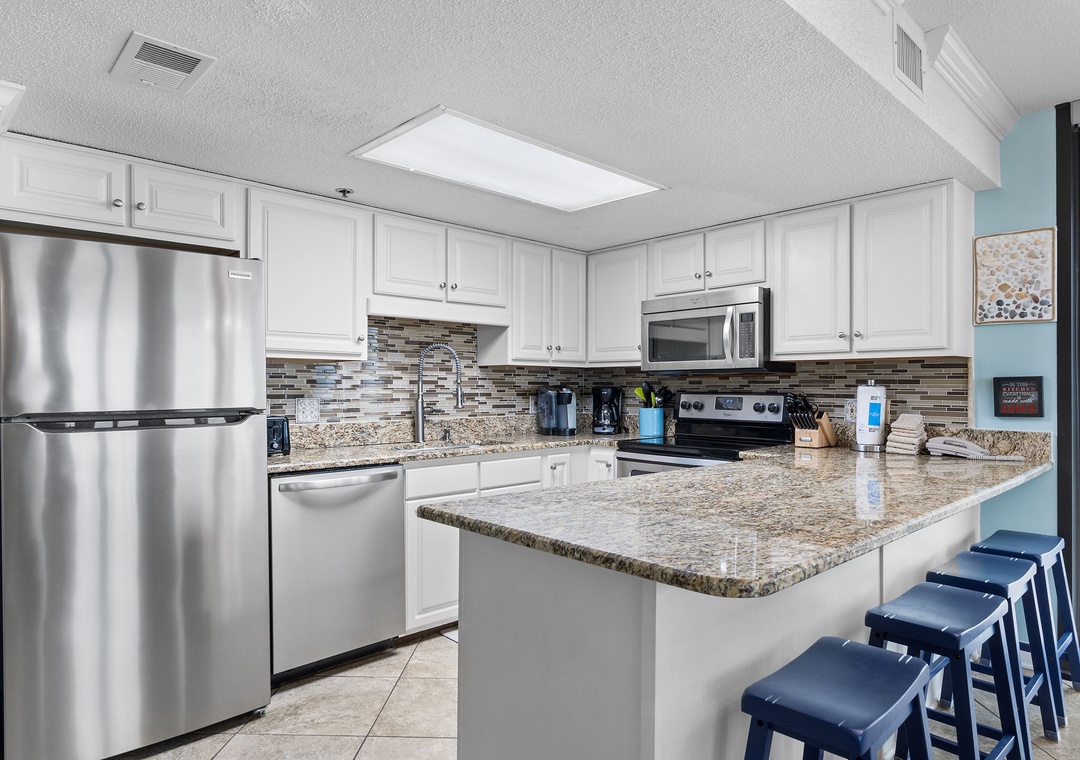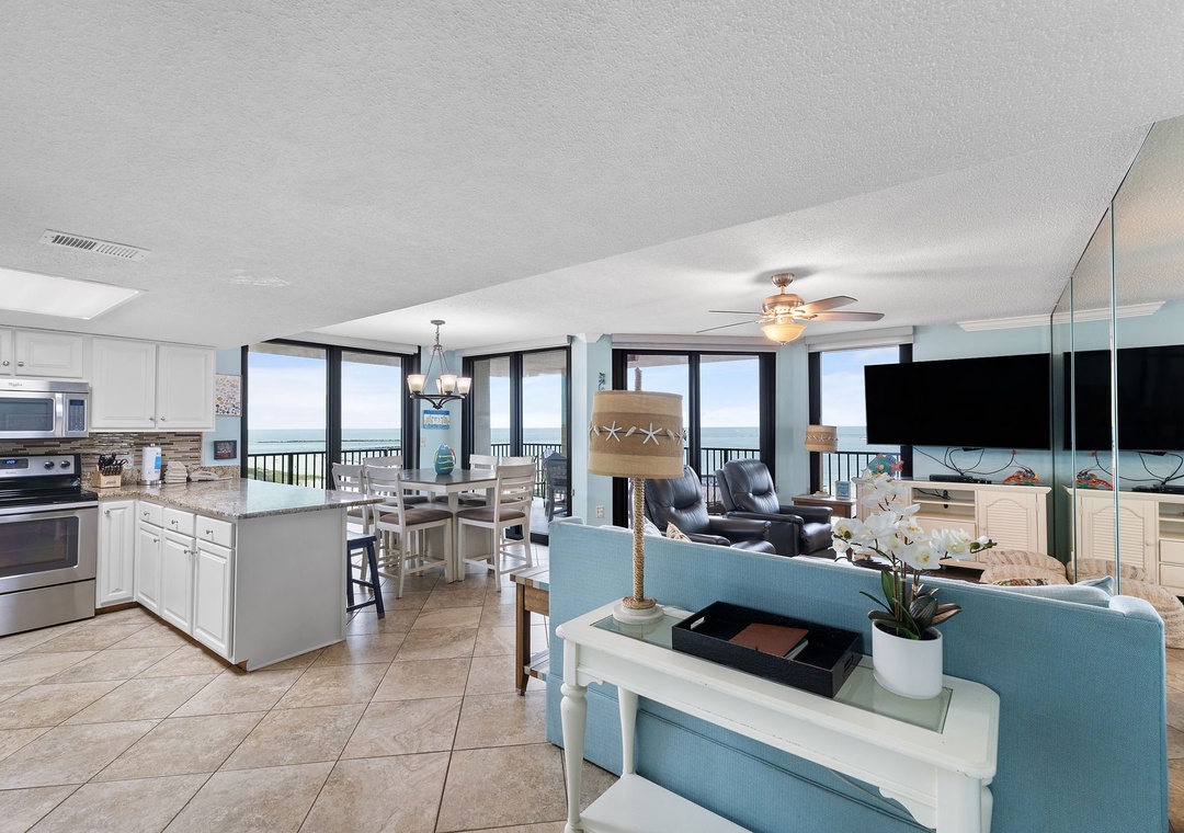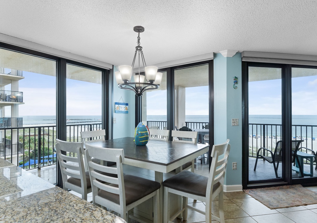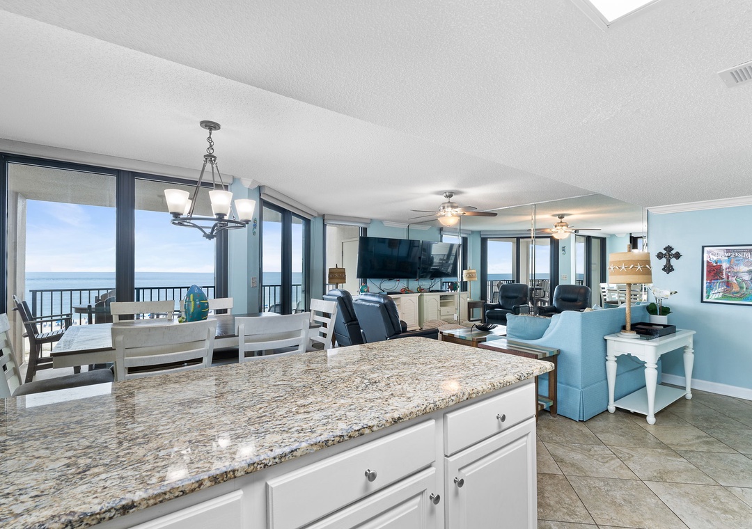 Welcome to Phoenix East 511, a beautifully remodeled coastal condo that combines style and comfort with upscale features throughout. This spacious unit greets you with a relaxed, sophisticated vibe, perfect for unwinding by the beach. The large living room invites you to take in the stunning ocean views through expansive windows, or settle in for movie night on the 65" Smart TV equipped with a Bluetooth surround sound bar. The dining area, which comfortably seats up to ten, opens seamlessly into the updated kitchen, a culinary haven with new cabinetry, stainless steel appliances, and sleek granite countertops.